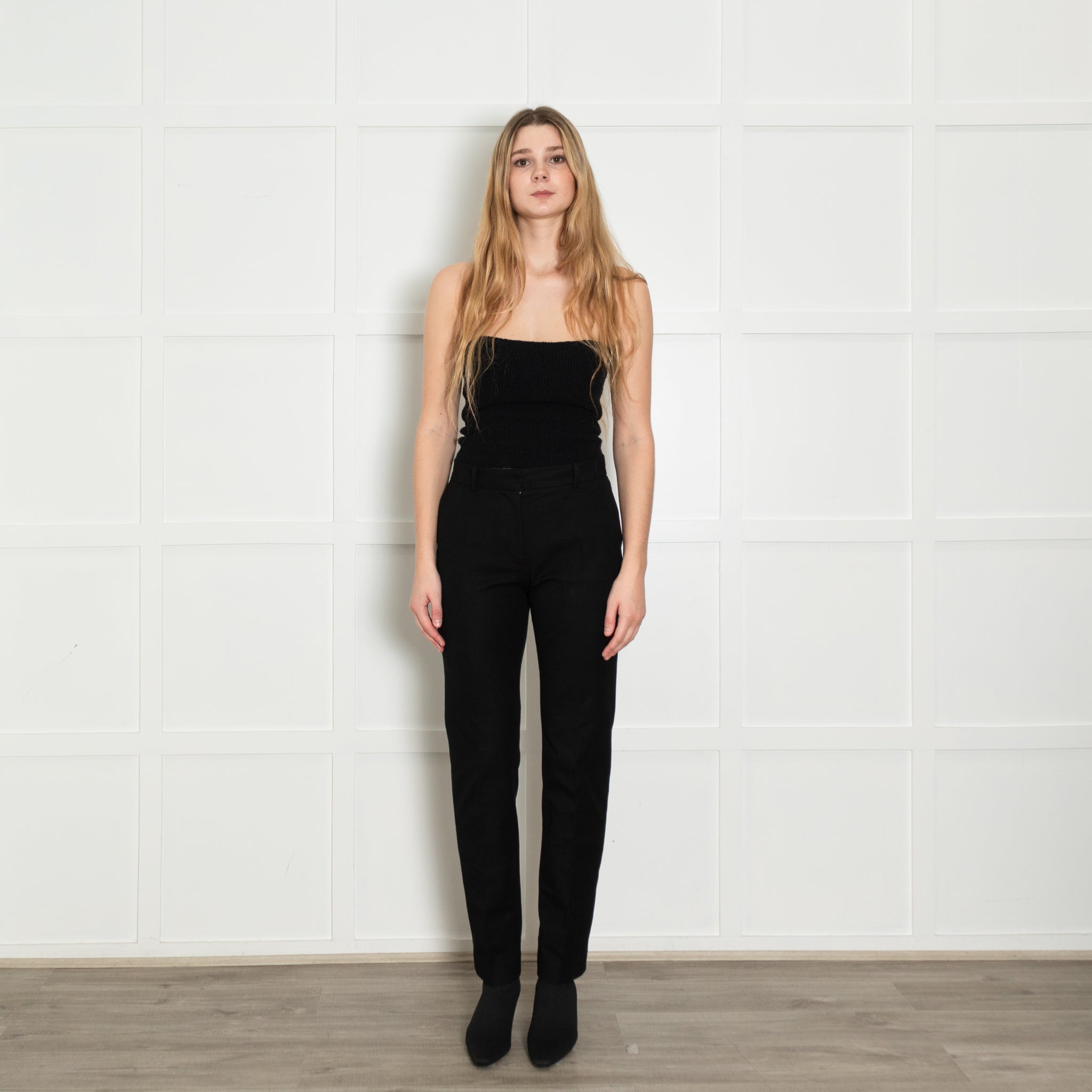 Joseph black trousers, featuring a tailored straight leg design, two front pockets, two back pockets, and a single zipped front closure, with a hoop belt waist.
