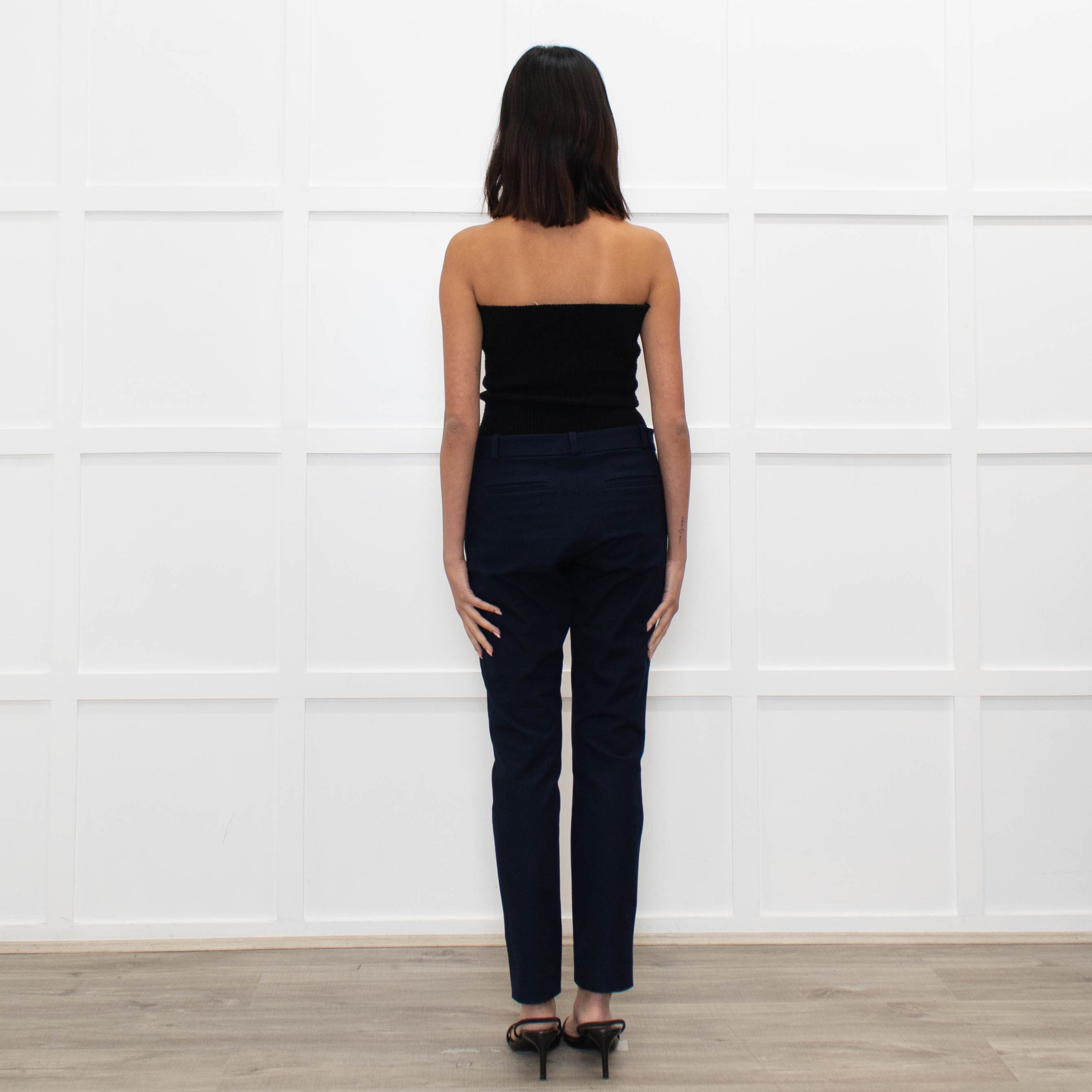 Joseph navy slim-leg cotton blend trousers with concealed front zip and metal clip closure, belt loops, and four pockets.