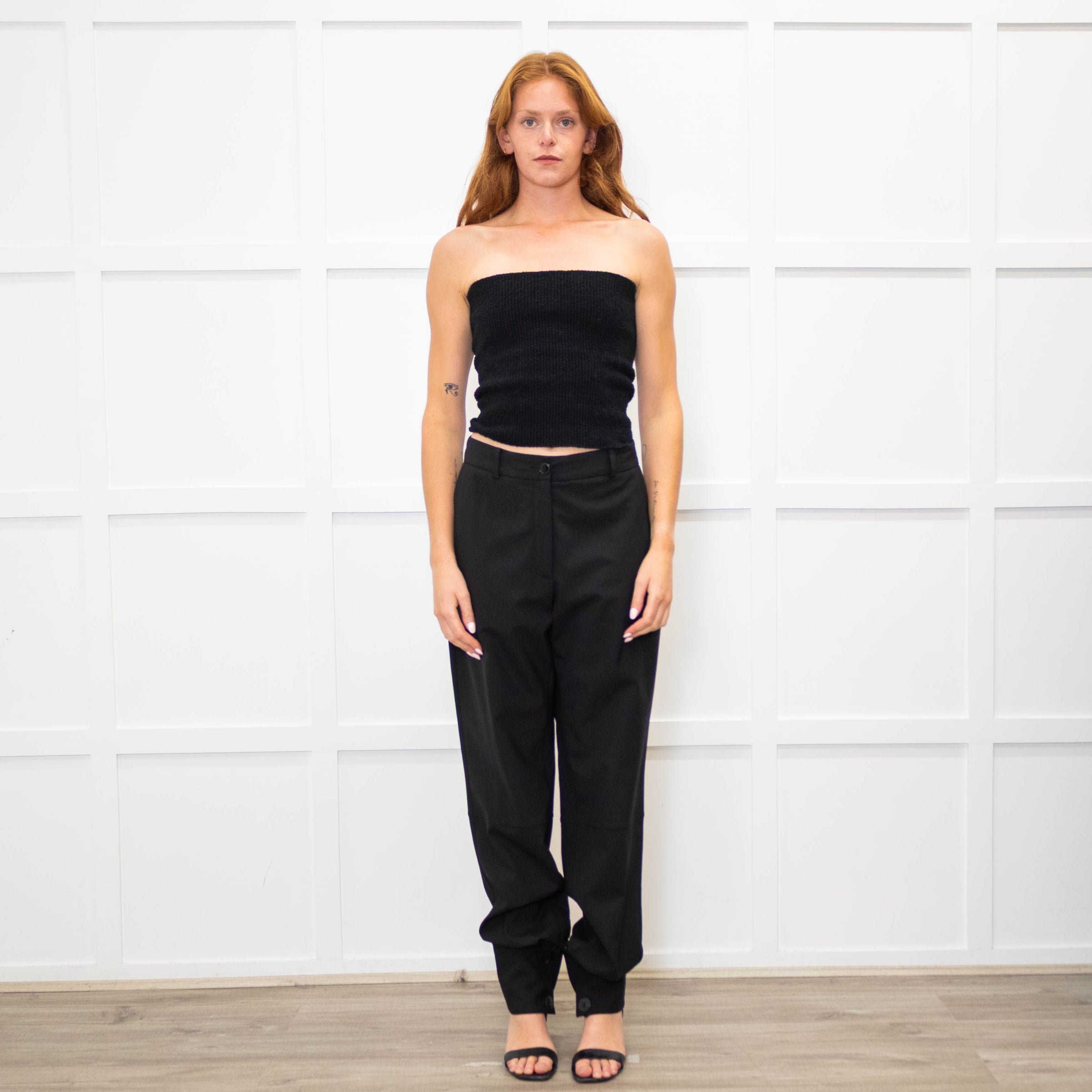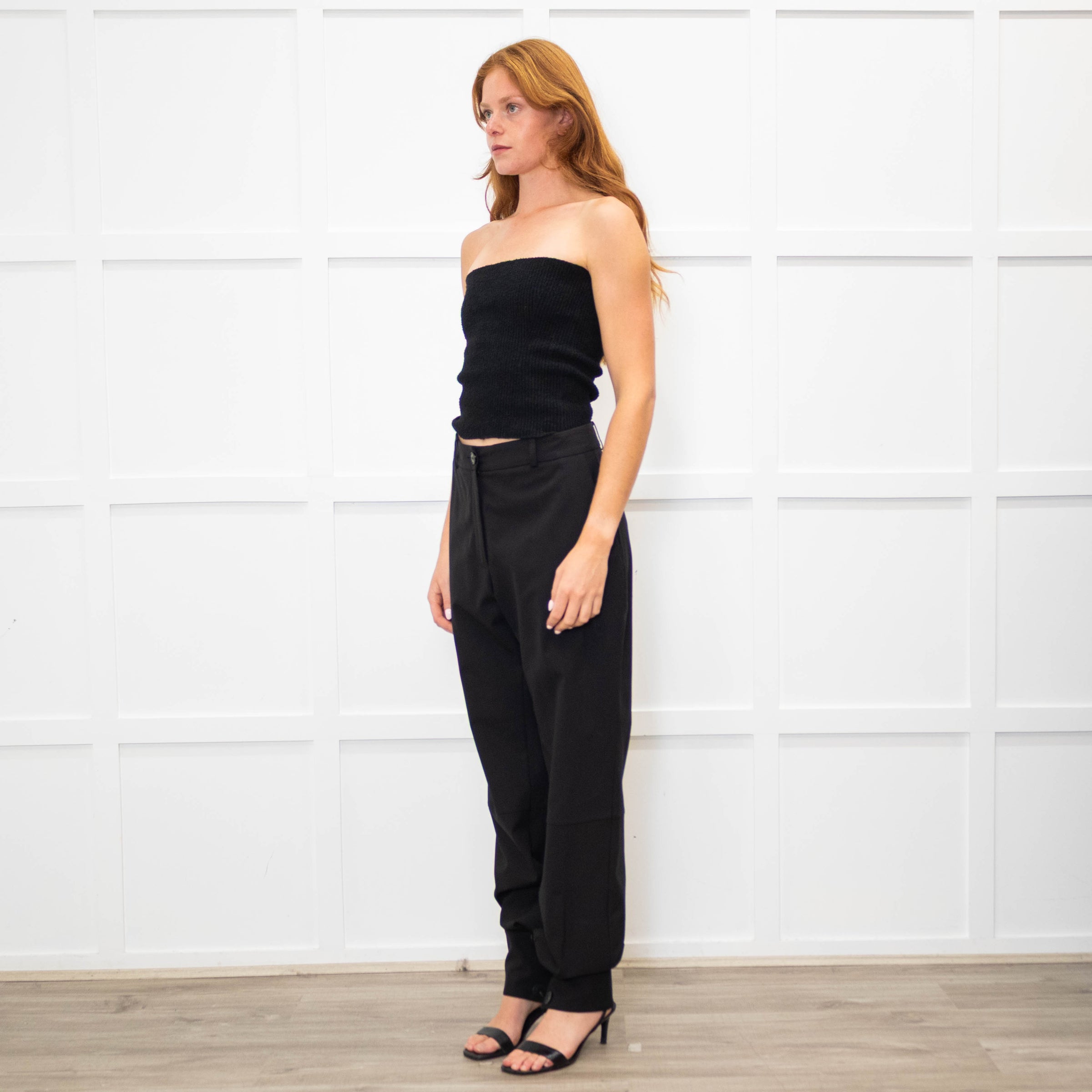 JW Anderson black wool cuffed hem trousers with button detailing. These trousers feature front concealed zip and button flies, belt loops, and three pockets.