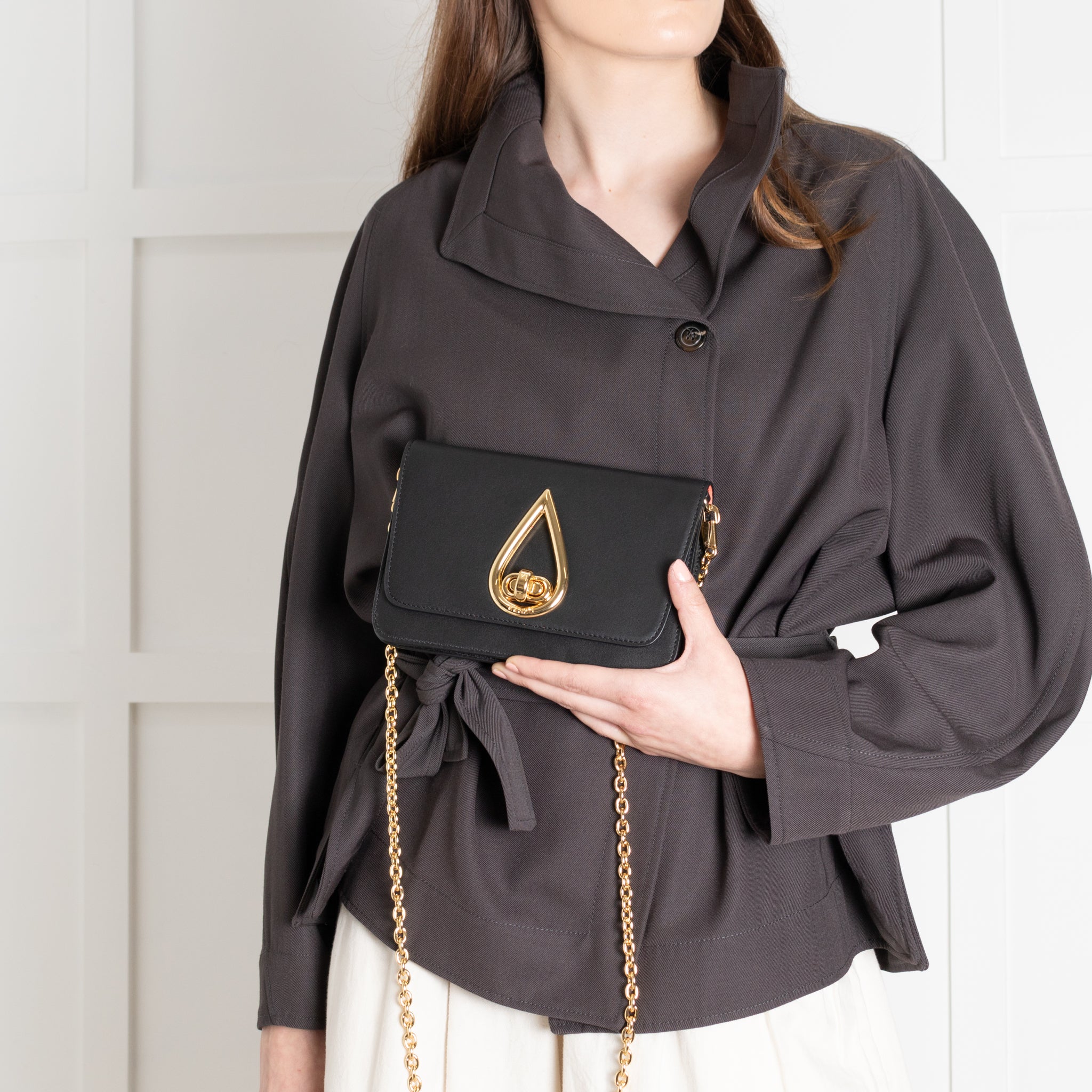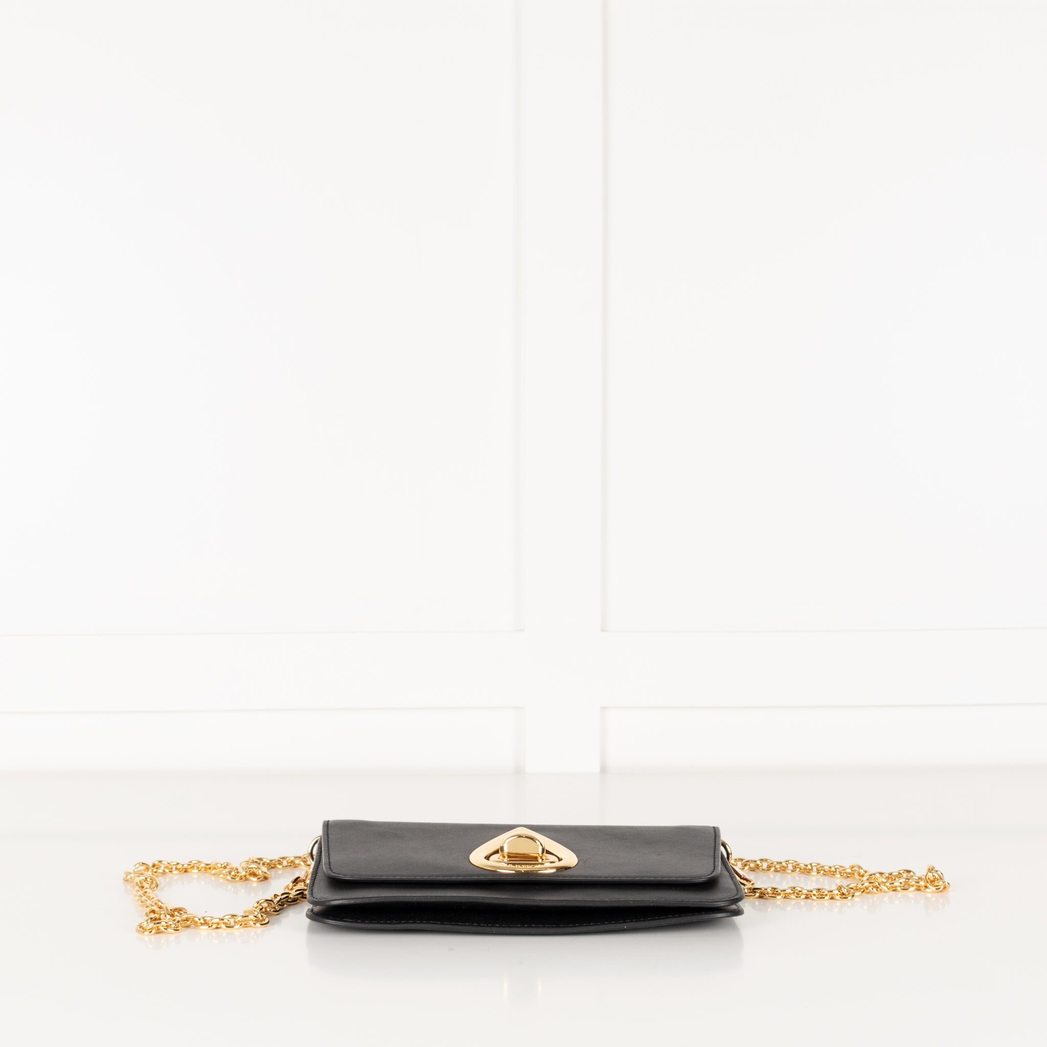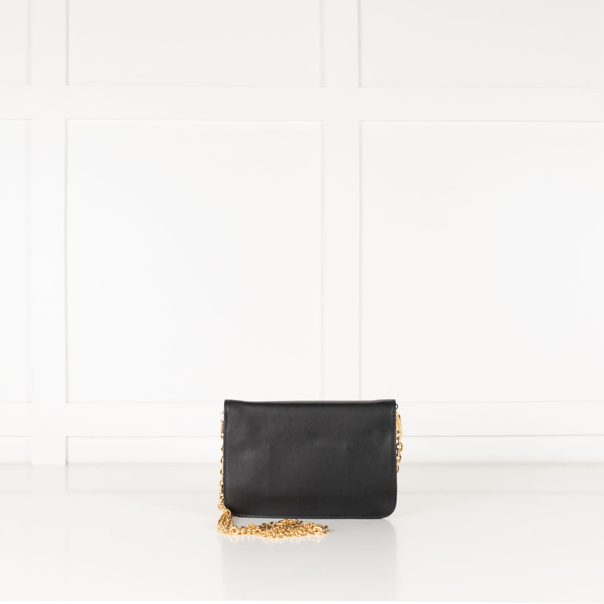 Kenzo black calfskin clutch bag with front twist lock closure in gold-tone metal and a long crossbody chain strap. New with tags.