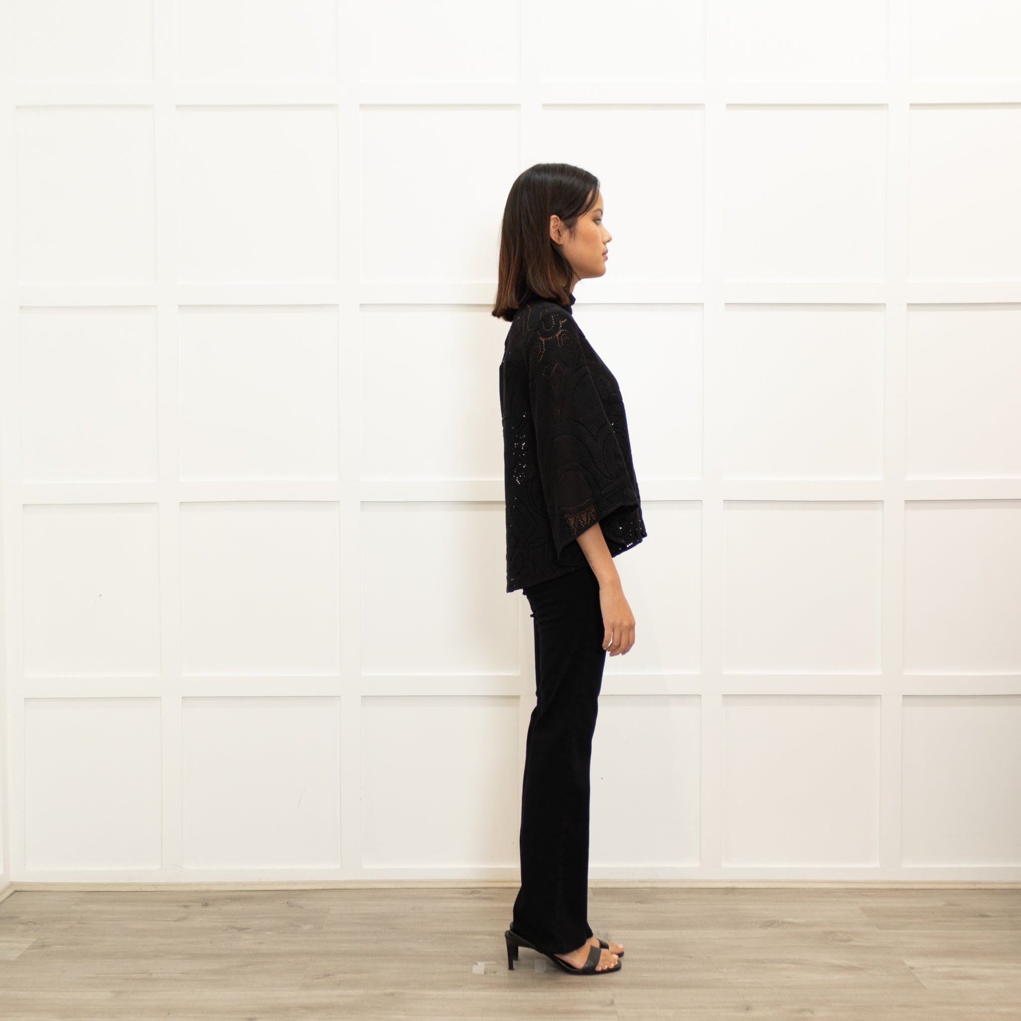 La Double J black lace bell sleeve top with a high neckline and cut-out detailing.