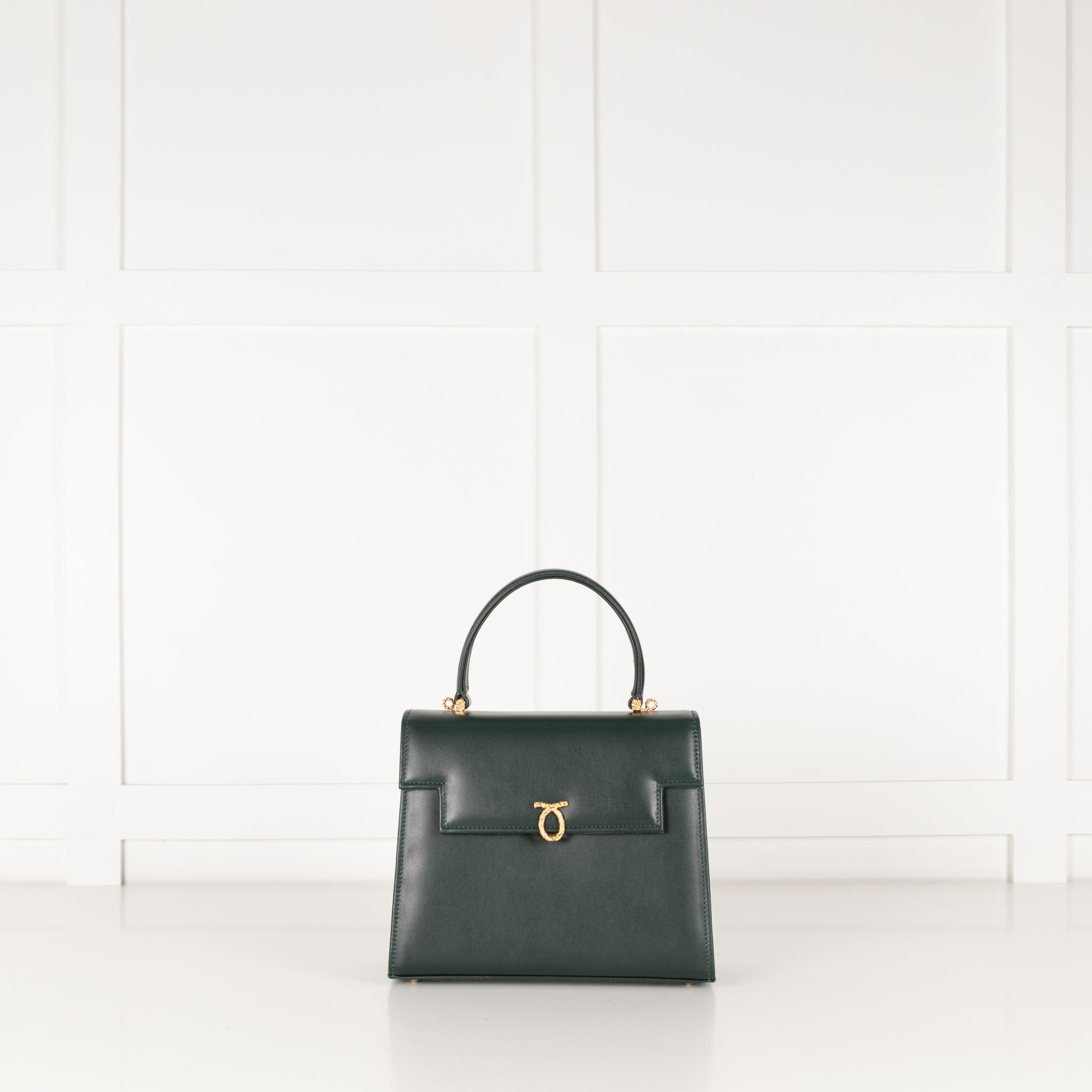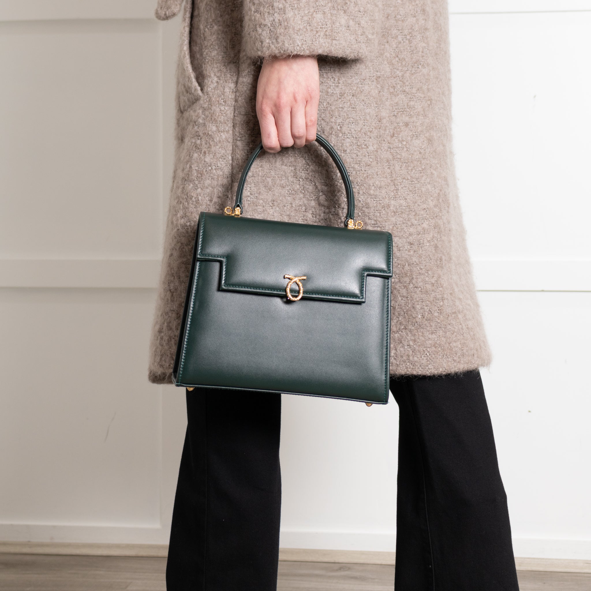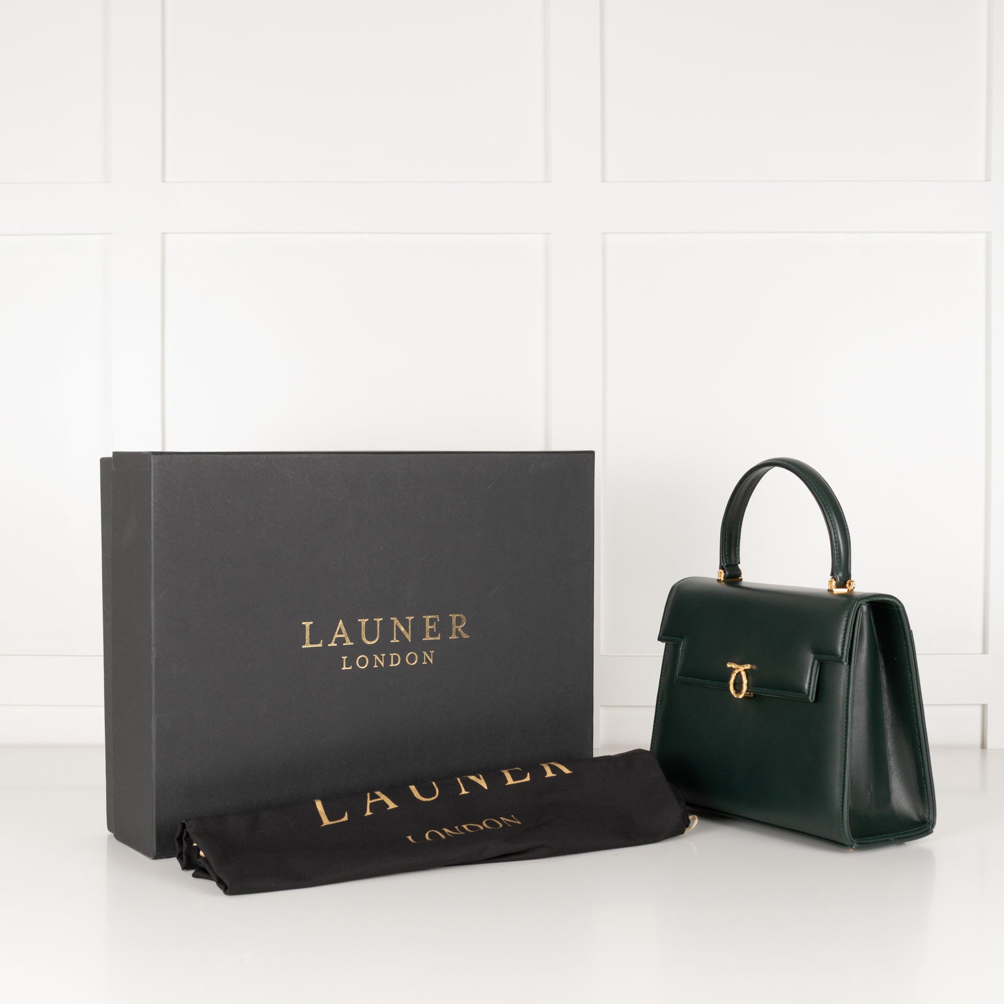 Launer London forest green traviata bag, crafted with leather exterior, featuring an elegant single handle deisgn, with gold accent pieces, a single lock flap close, with a hard ribbon deisgn. A beautiful velvet interior with two separate compartments, an outer flap side closure, and a single zipped compartment. This bag is accompanied by the original dust bag, a miniature mirror, and a leather shoulder strap for a more comfortable fit.