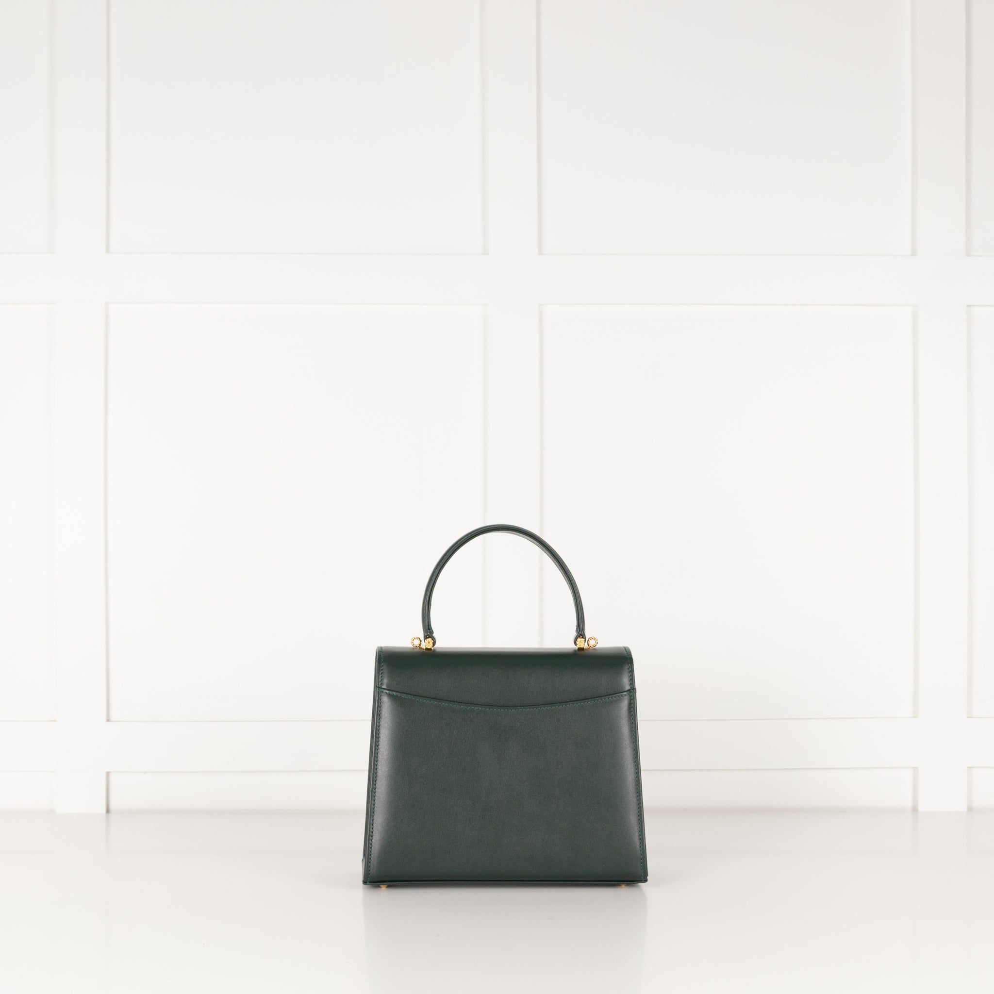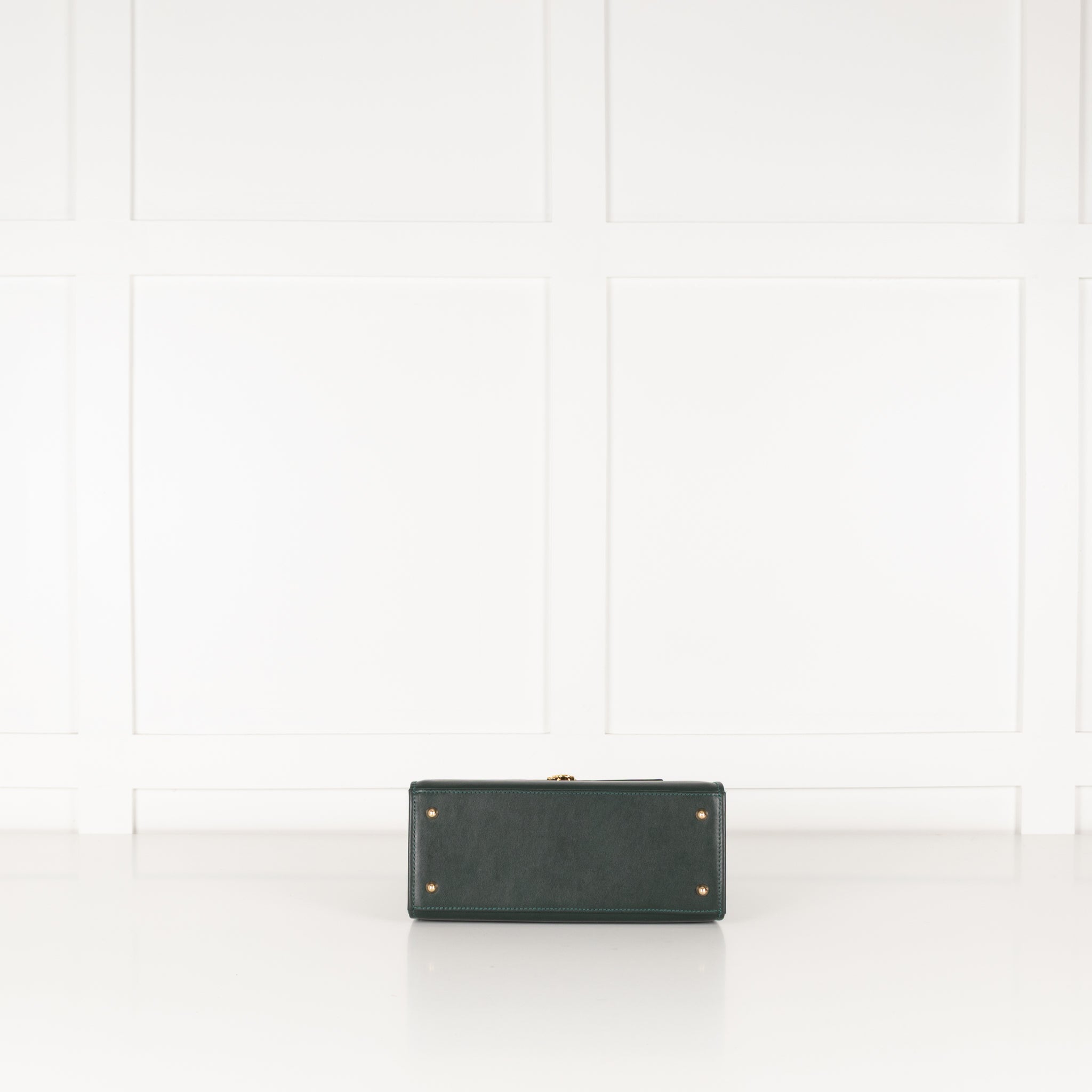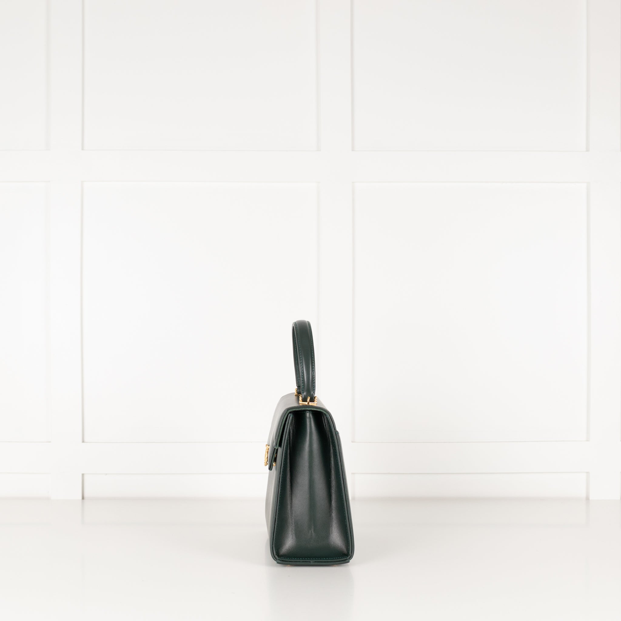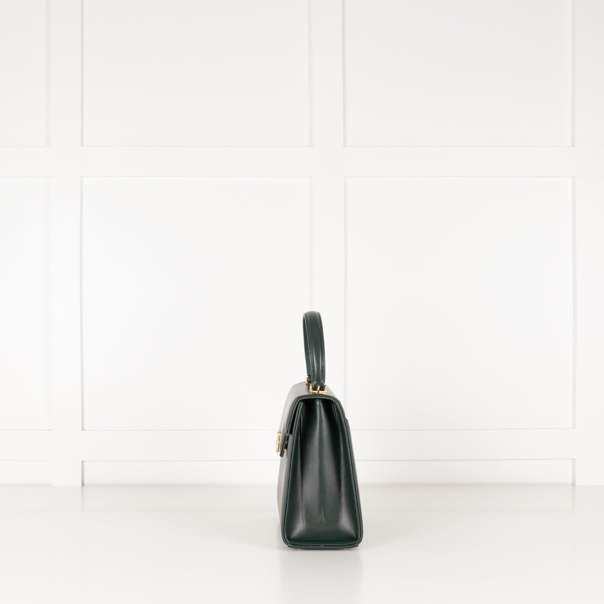 Launer London forest green traviata bag, crafted with leather exterior, featuring an elegant single handle deisgn, with gold accent pieces, a single lock flap close, with a hard ribbon deisgn. A beautiful velvet interior with two separate compartments, an outer flap side closure, and a single zipped compartment. This bag is accompanied by the original dust bag, a miniature mirror, and a leather shoulder strap for a more comfortable fit.