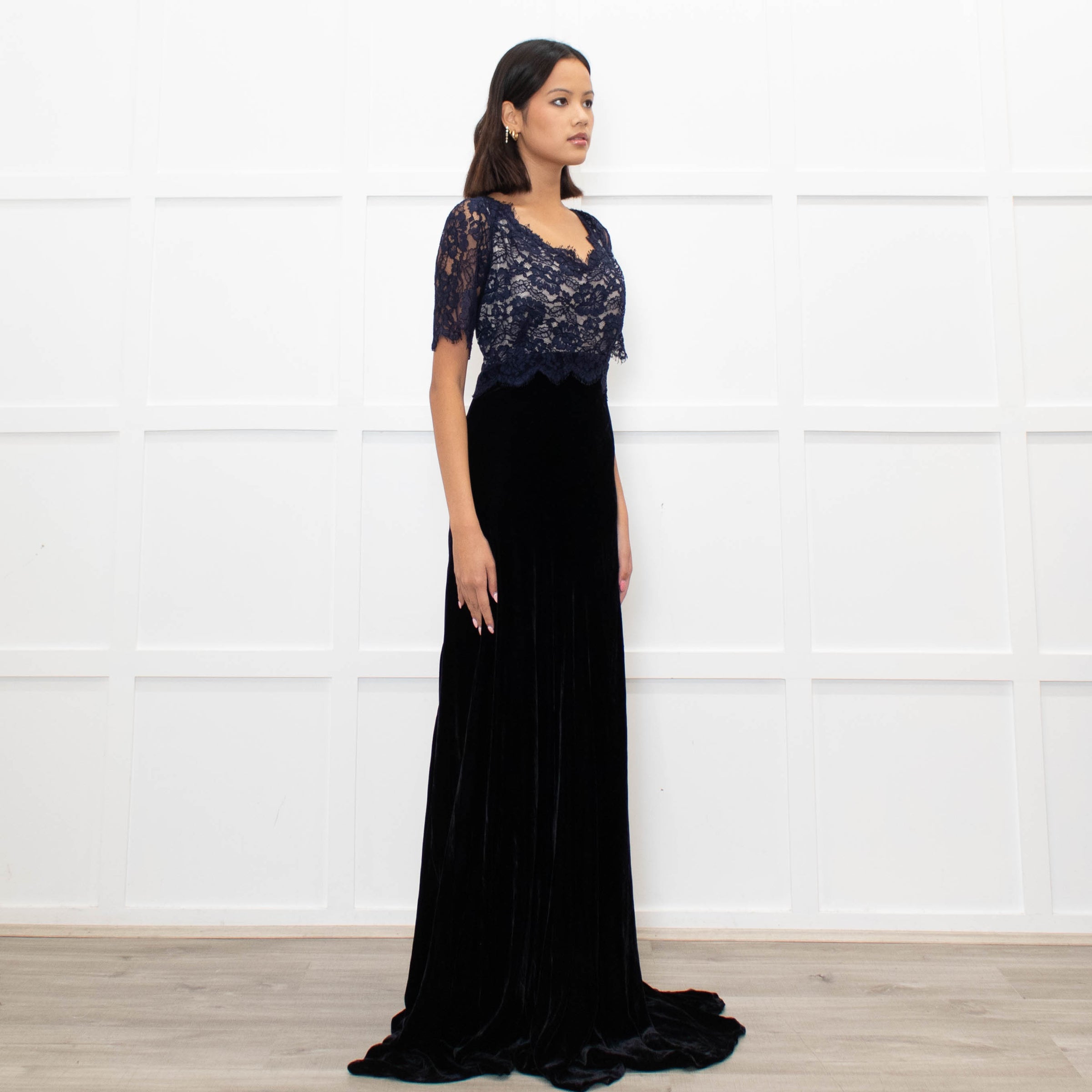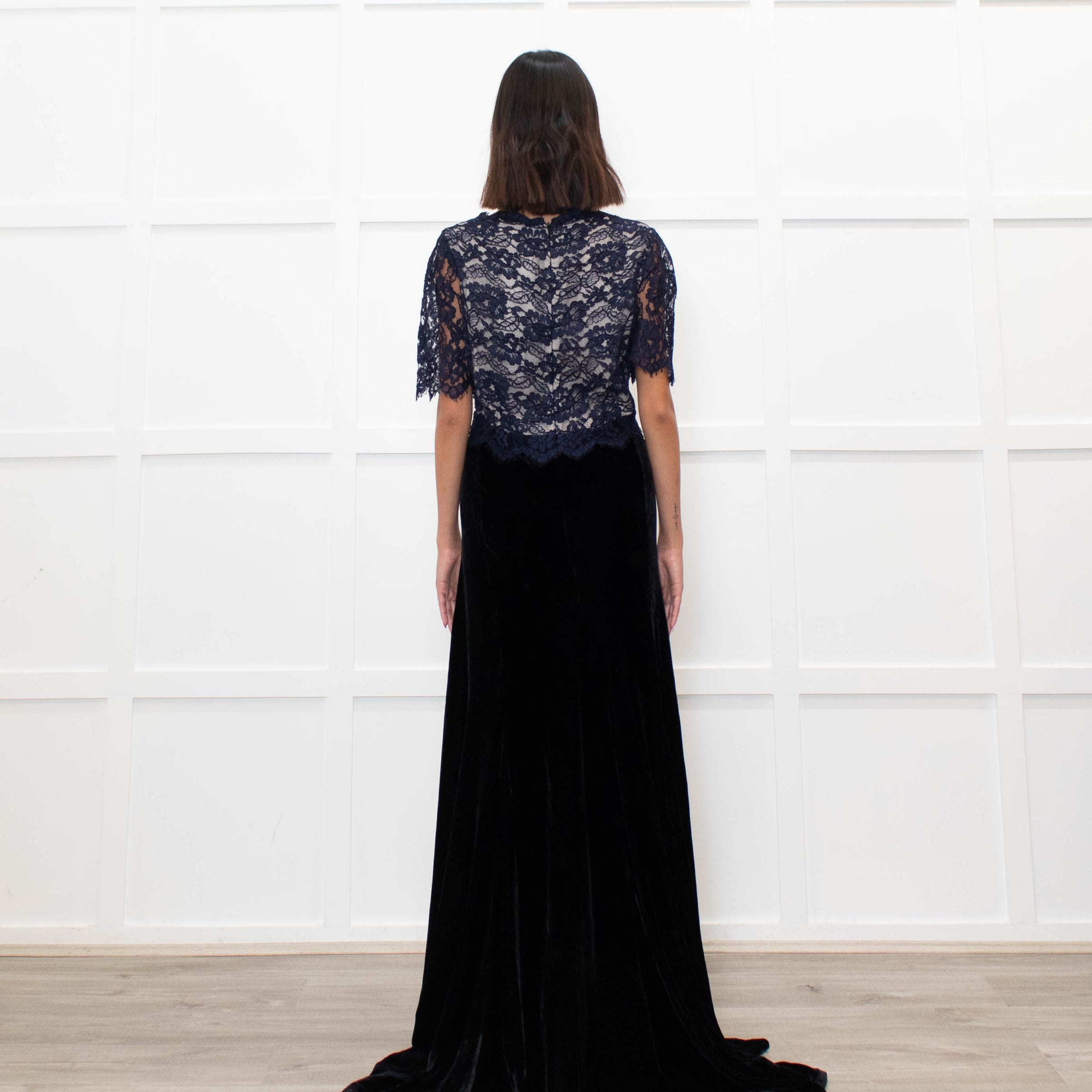 Libelula long evening dress with a black velvet skirt, and a blue/ black lace top, lined with white silk. Finished with short sleeves and eyelash lace edging.