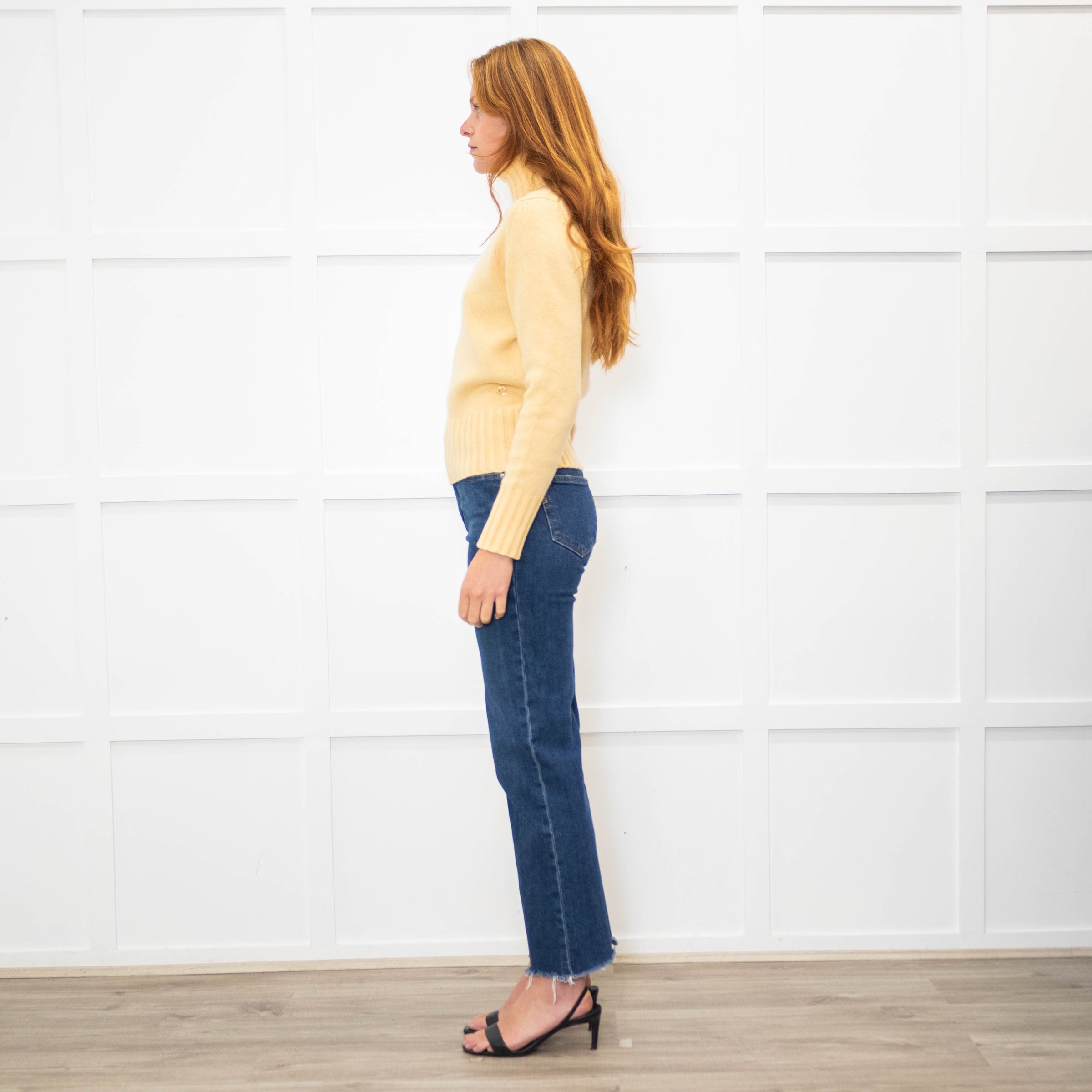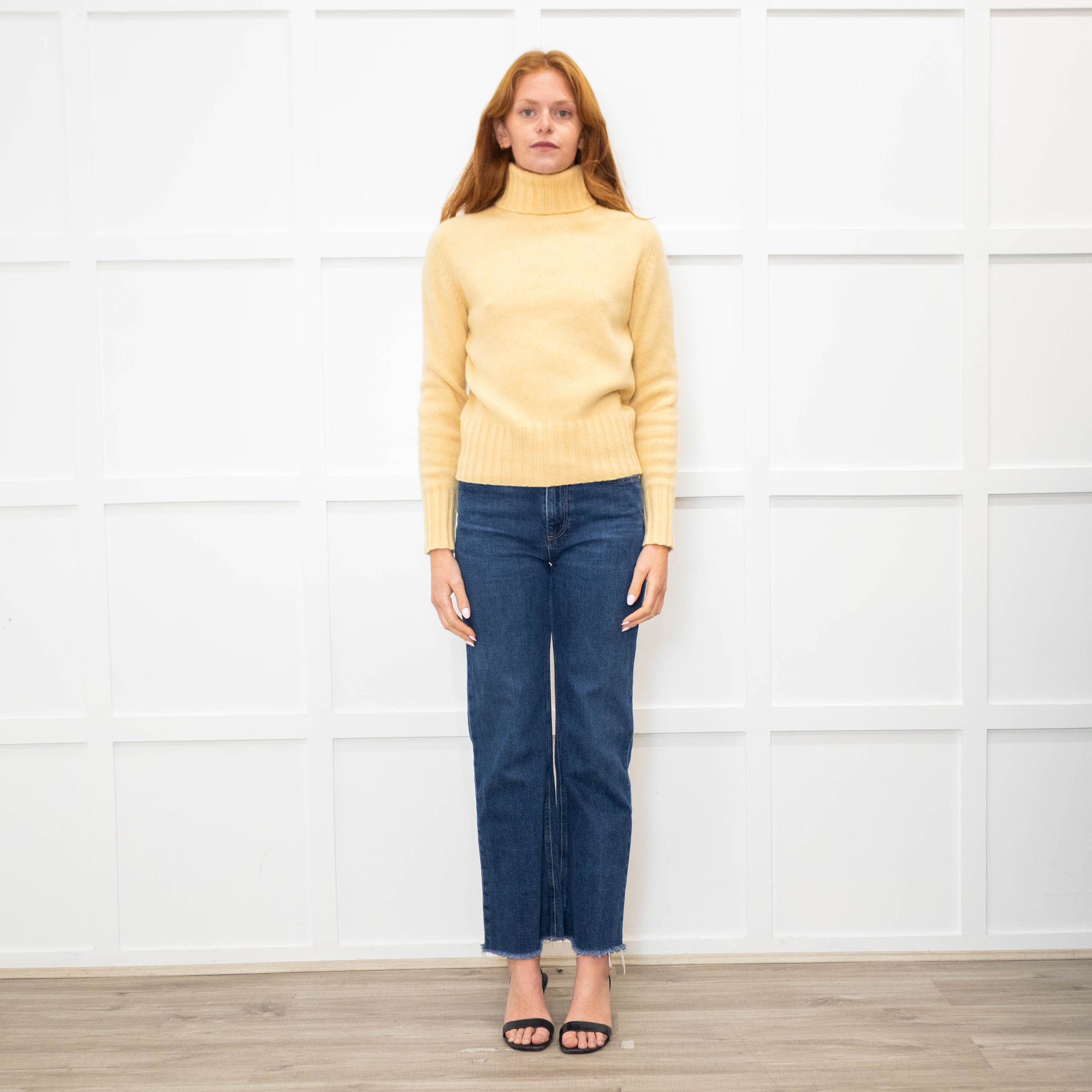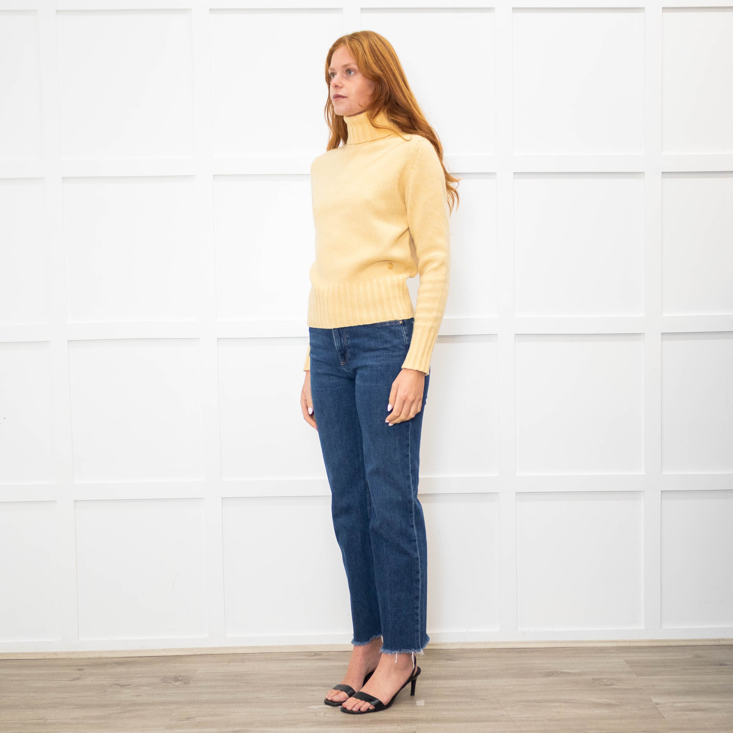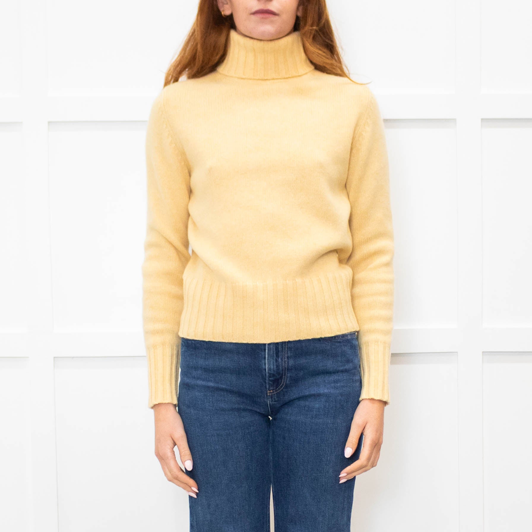 Loro Piana soft yellow baby cashmere jumper with a high/ rolled neckline, long sleeves, and chunky ribbed trim detailing. Finished with a small gold-tone branded disk plaque.