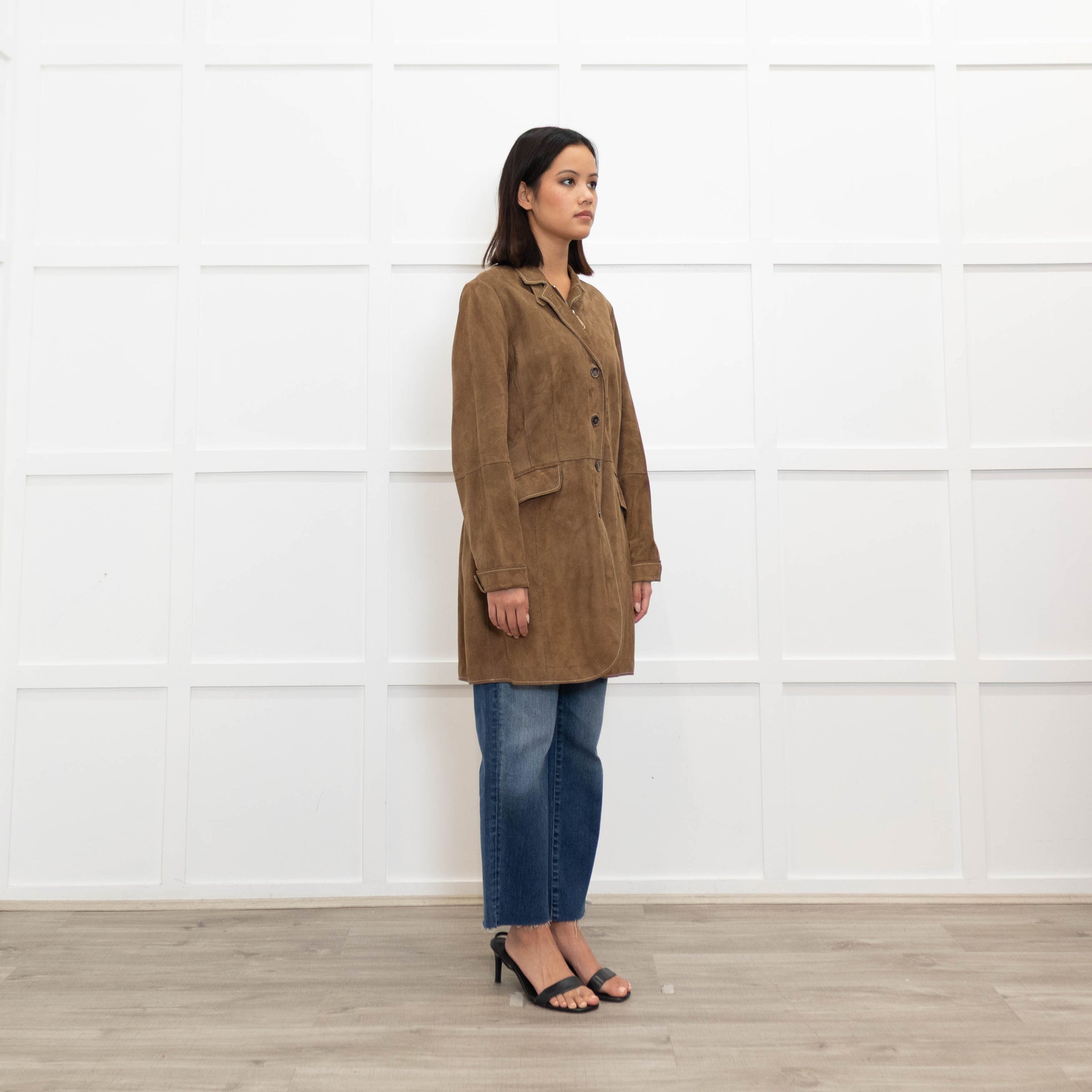 Mabrun brown faux suede jacket with panel stitch detailing, two front flap pockets, front zip and button closure, and buttons on the sleeve cuffs.