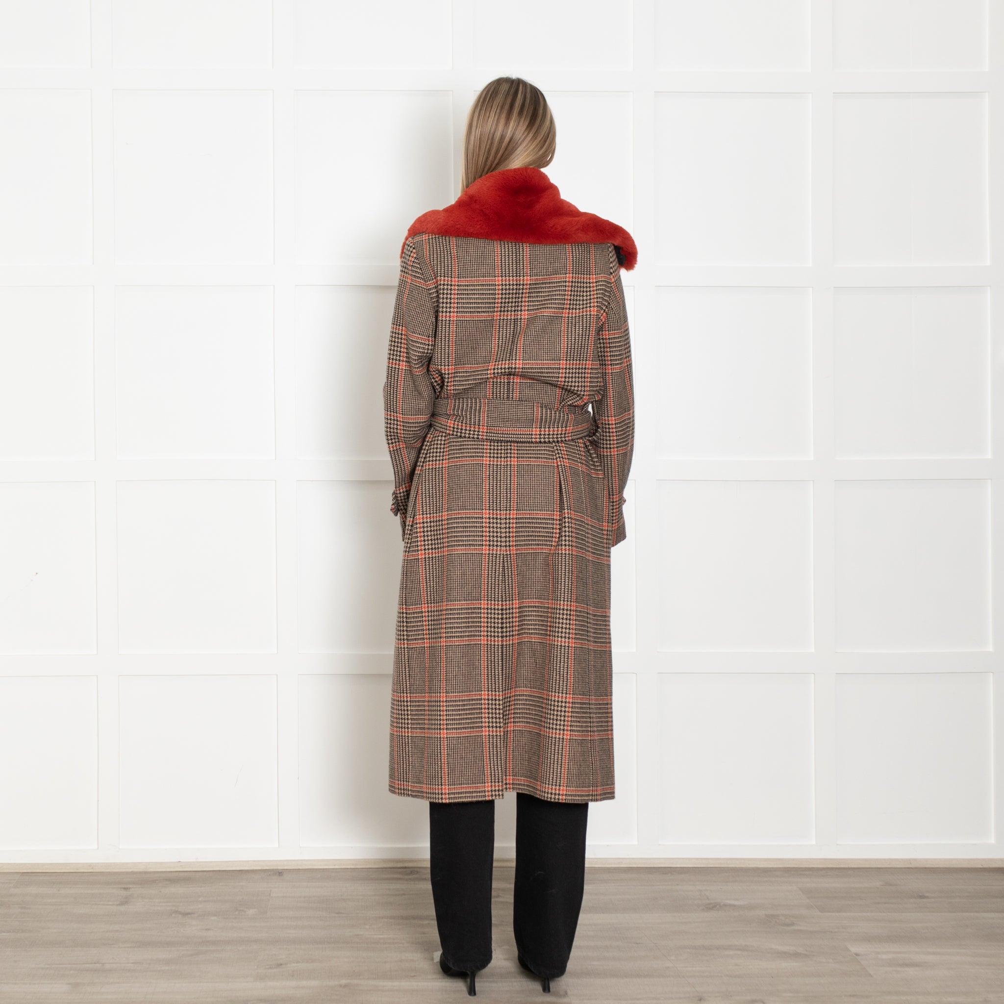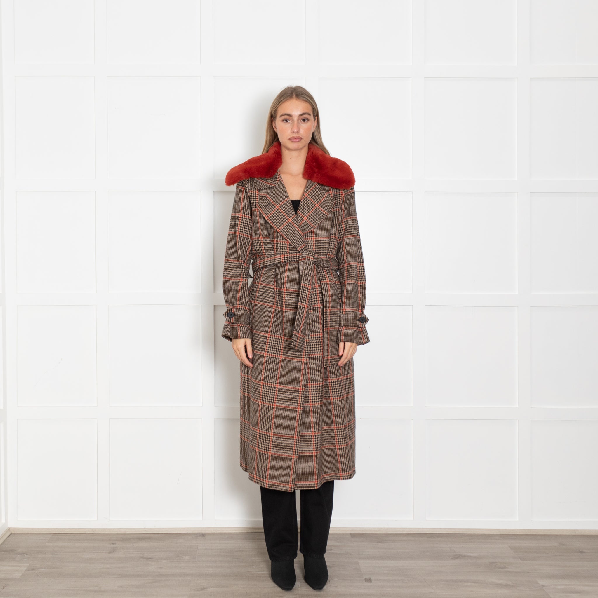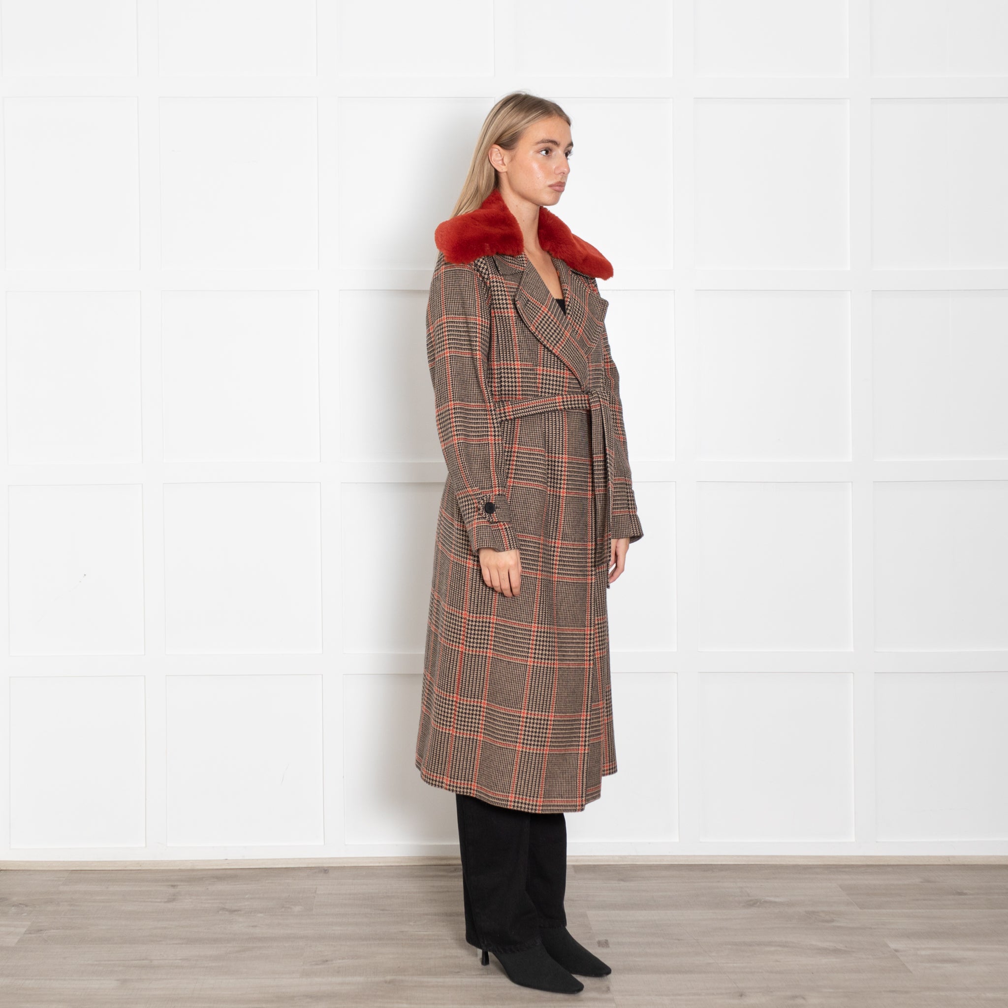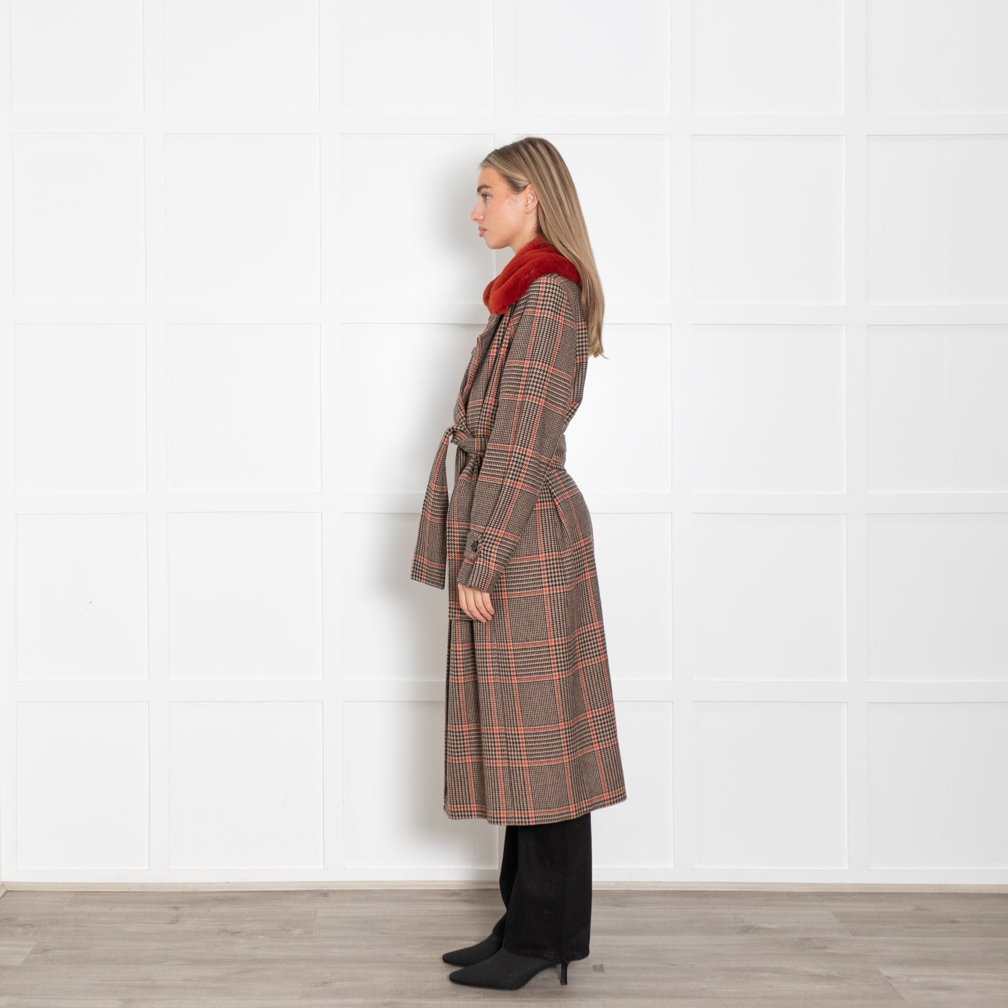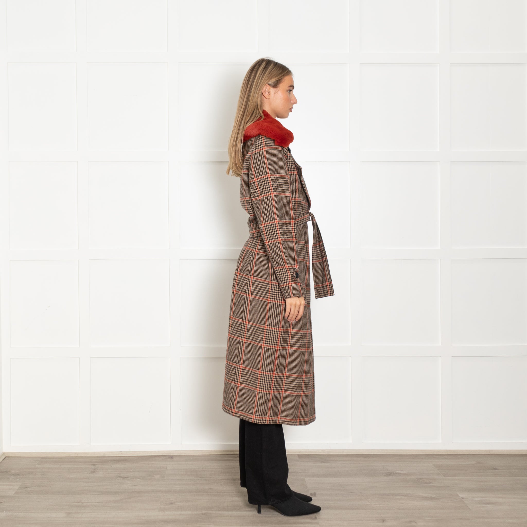 Maison Lener brown and black Prince of Wales checked coat, featuring a long-sleeve, long design, with a rust faux orange fur collar, tapered button-up arms, a single black button up front collar design, two front pockets with a wrapped tie belt.
