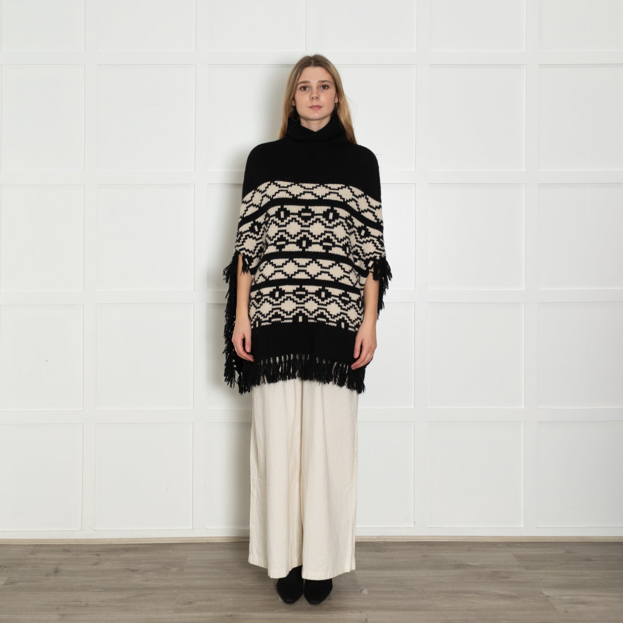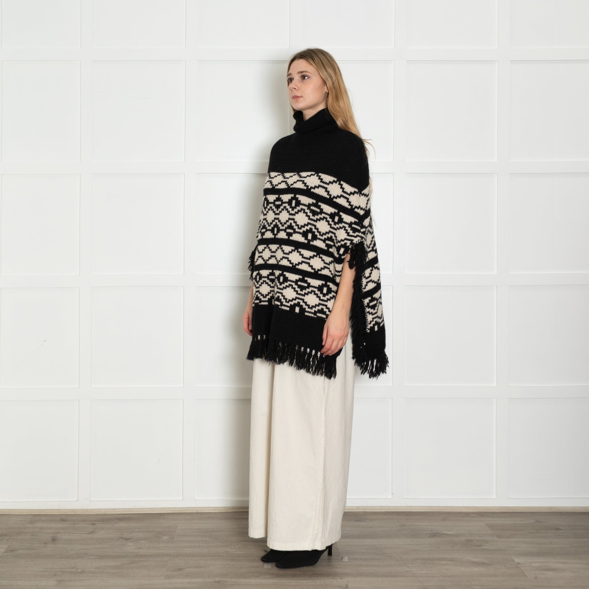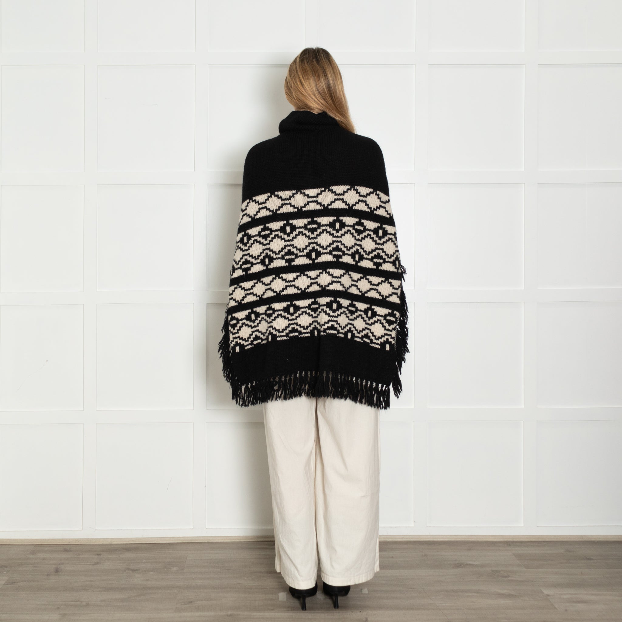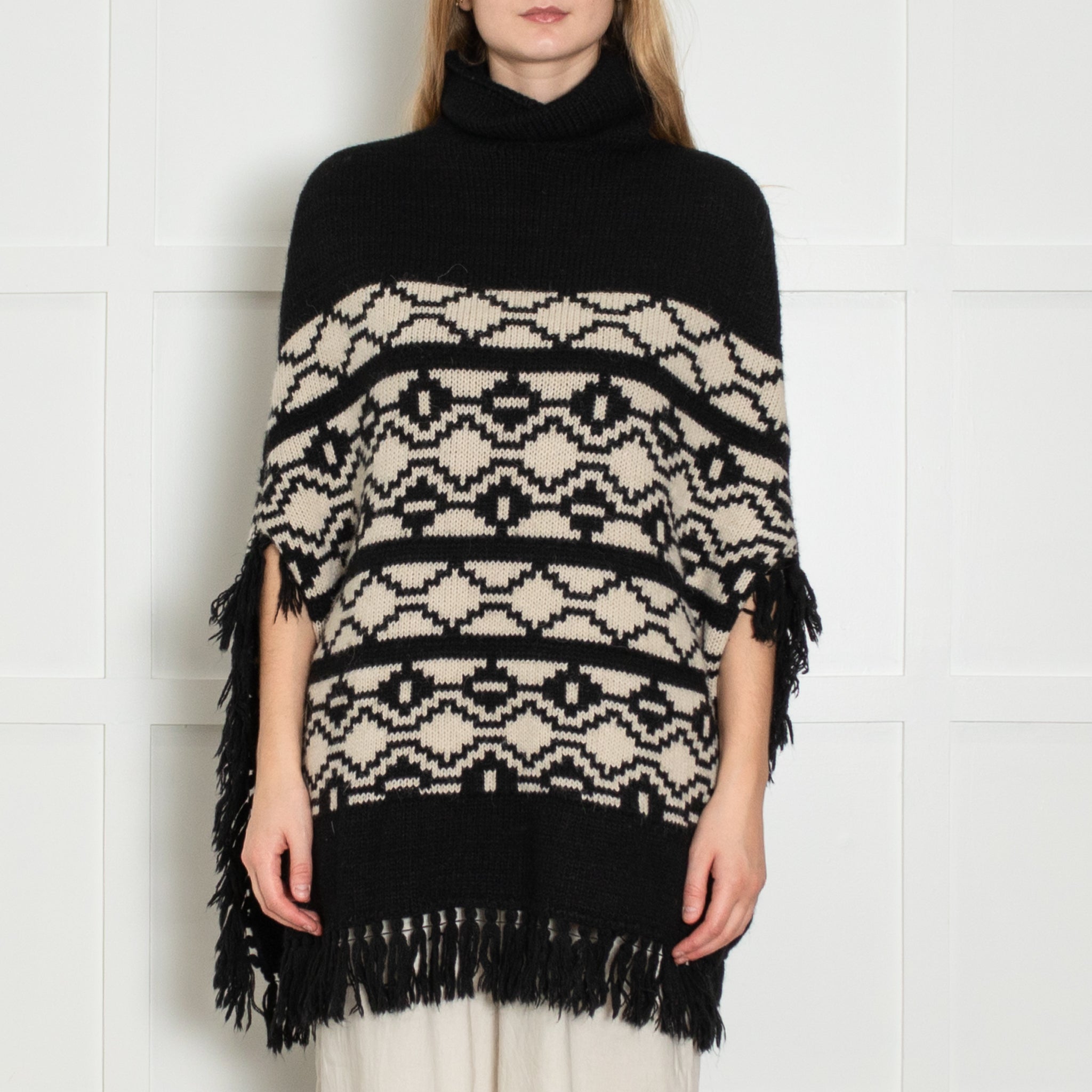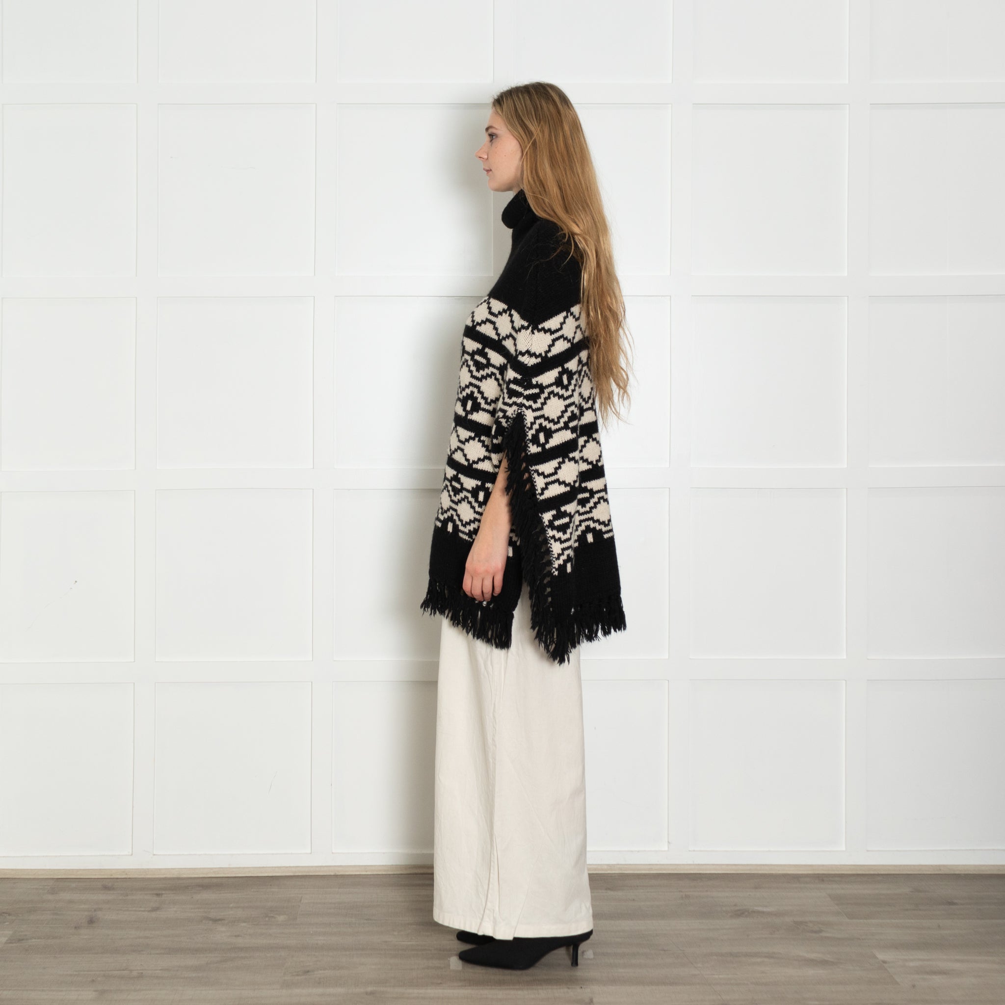 Maje black sleeveless poncho, featuring a stunning white patterned design, crafted with a soft knitted wool fabric, and a high rolled neck design.