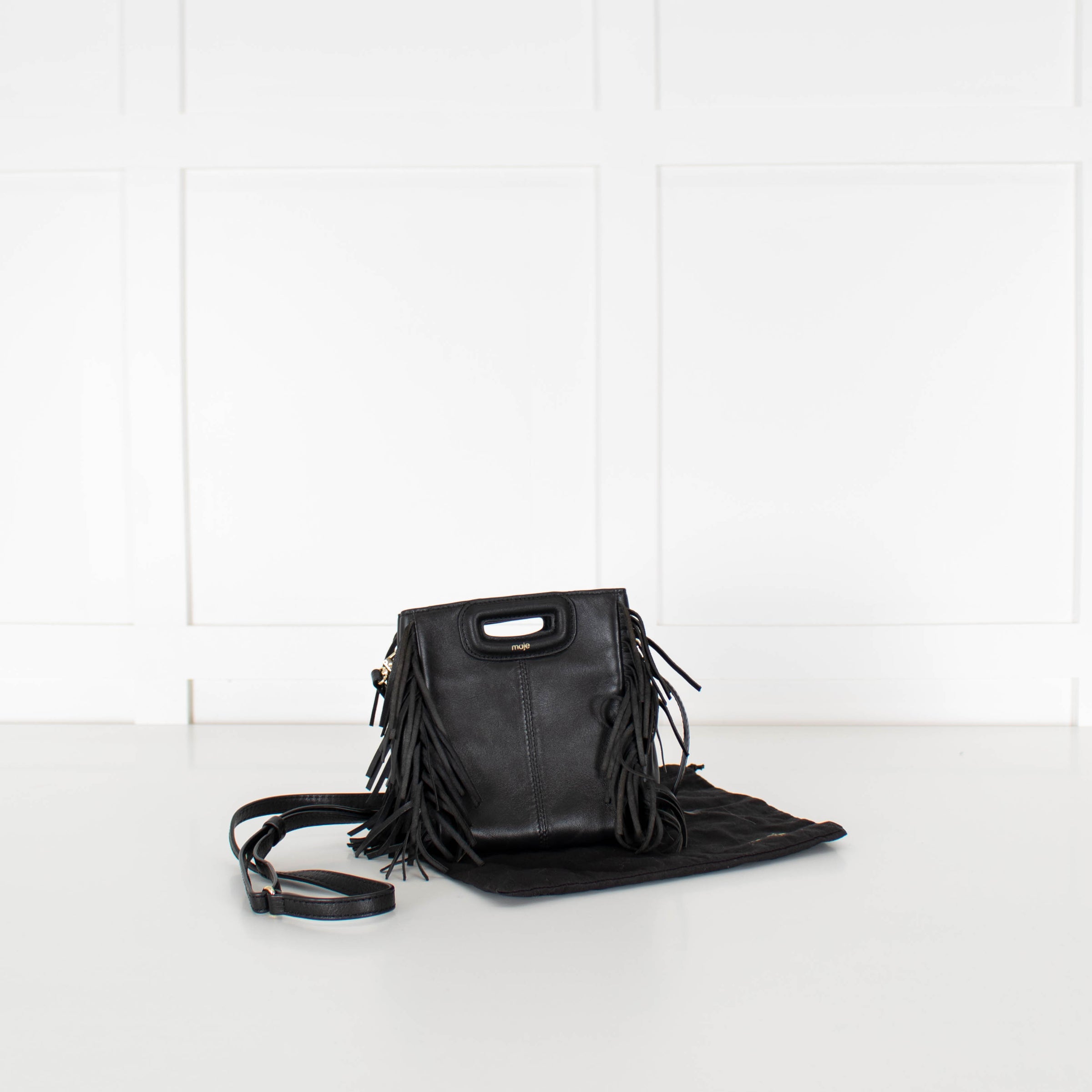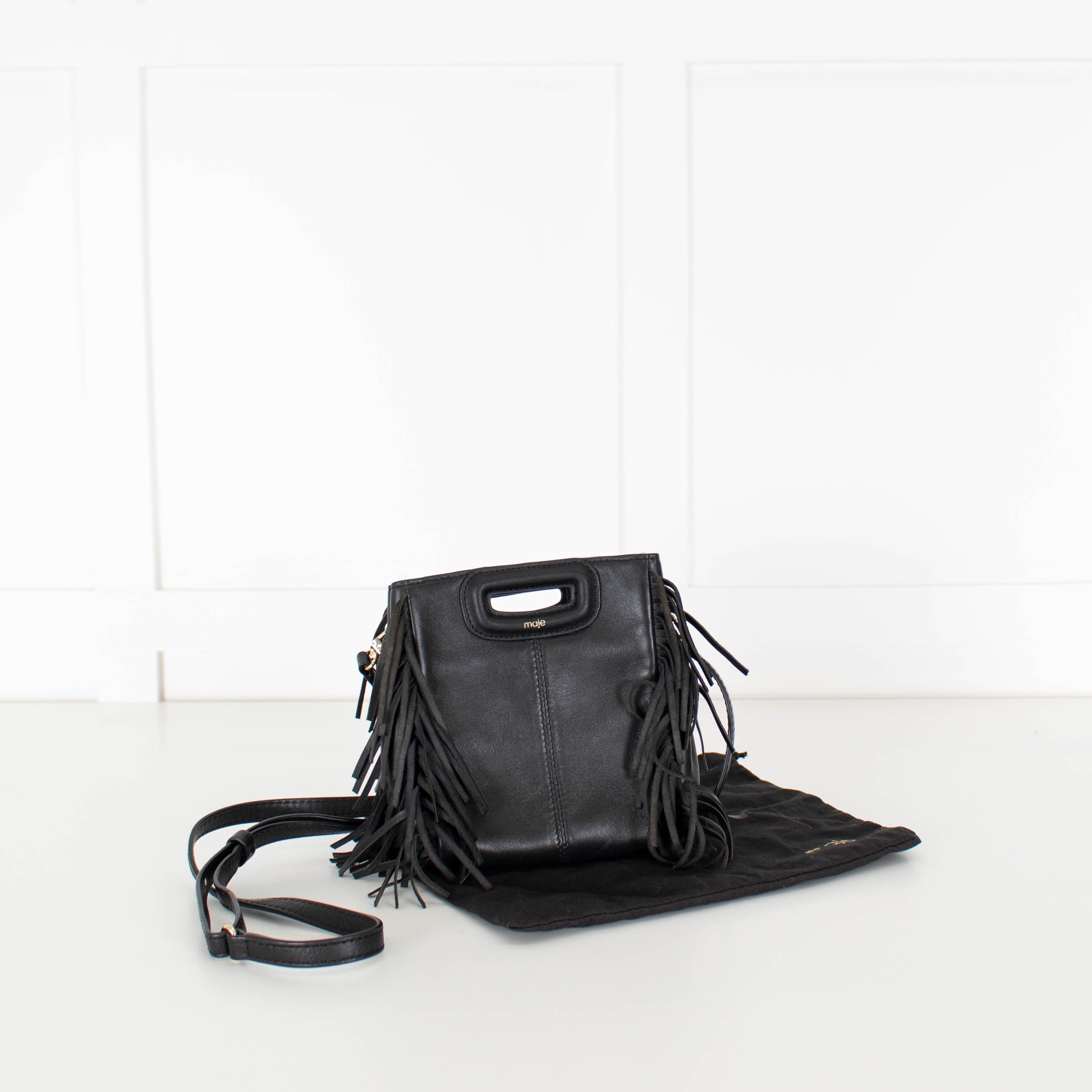 Maje black leather Fringed Frame Mini Handloe crossbody bag with layered fringe detailing. Designed with a structured top handle, detachable crossbody strap, and compact silhouette.