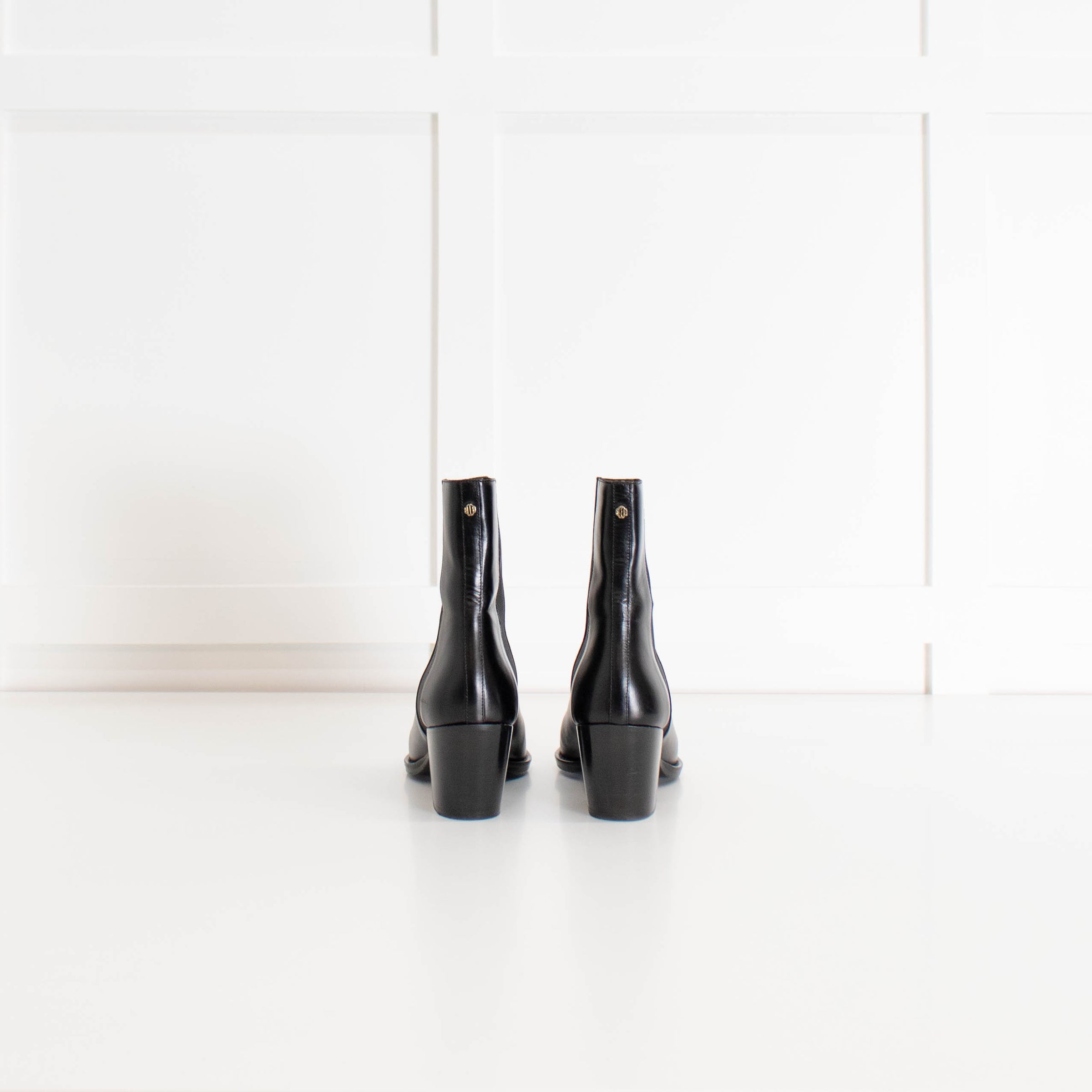 Maje black smooth leather Cuban heeled ankle boots with Chelsea style elasticated side panels, a pointed toe, and an internal pull tab.
