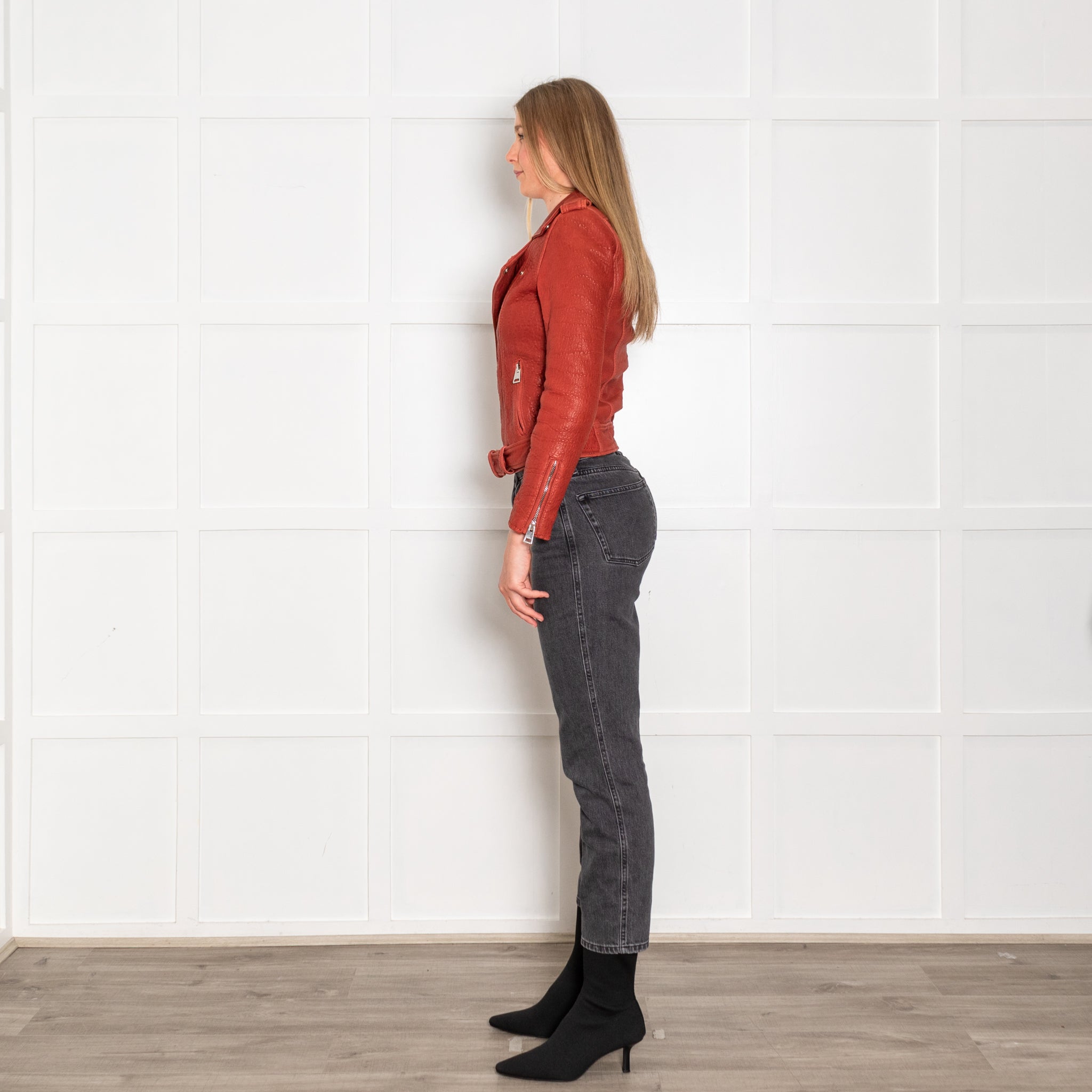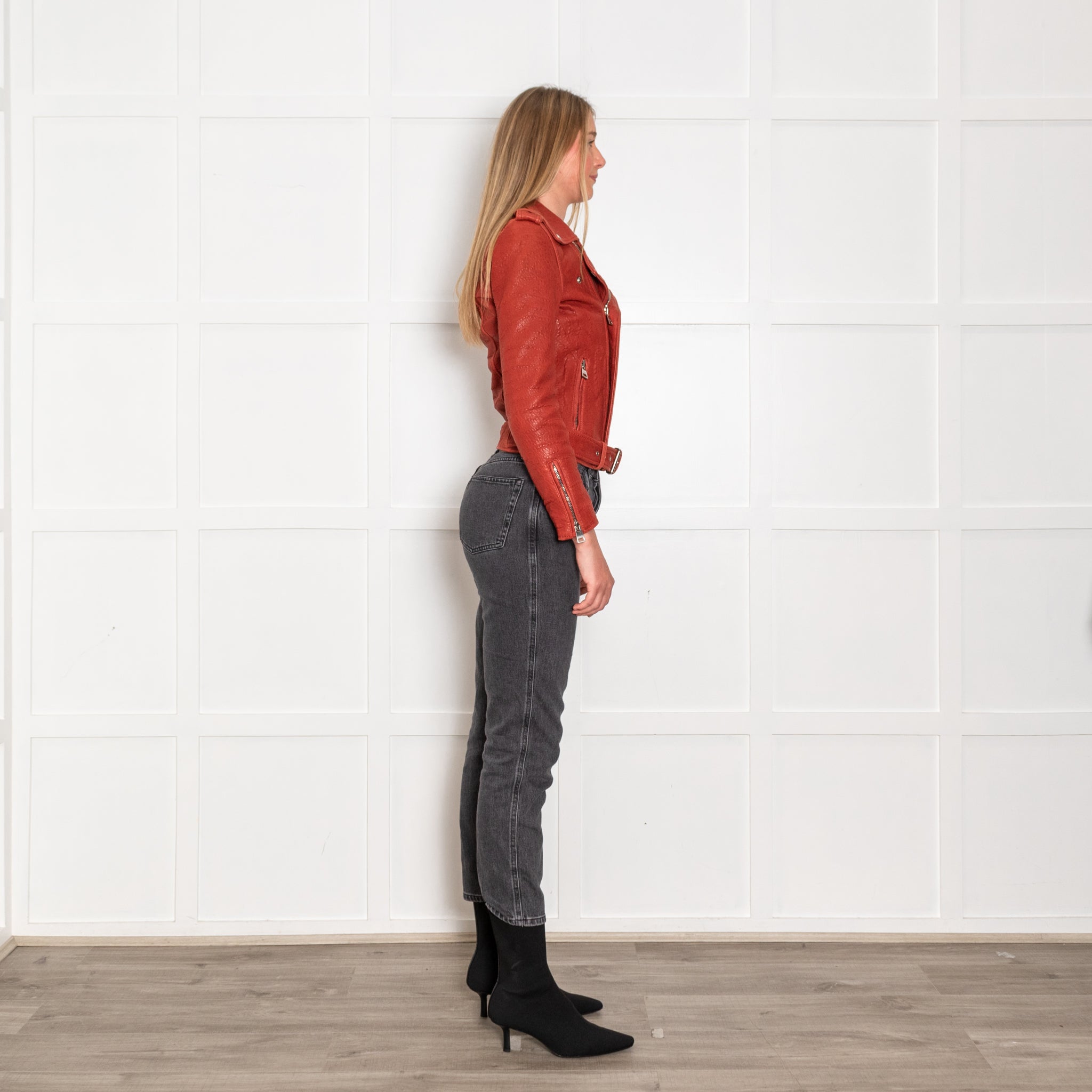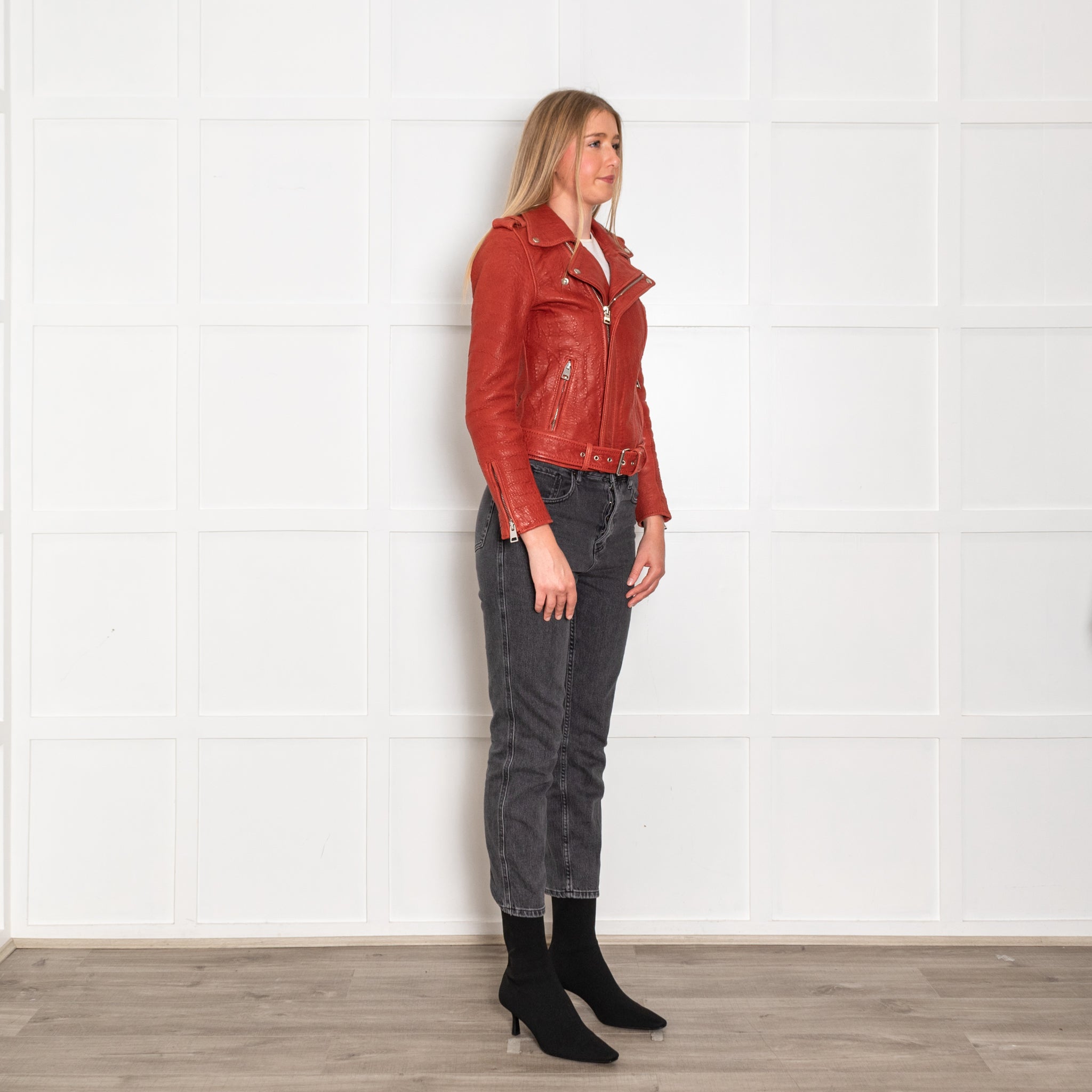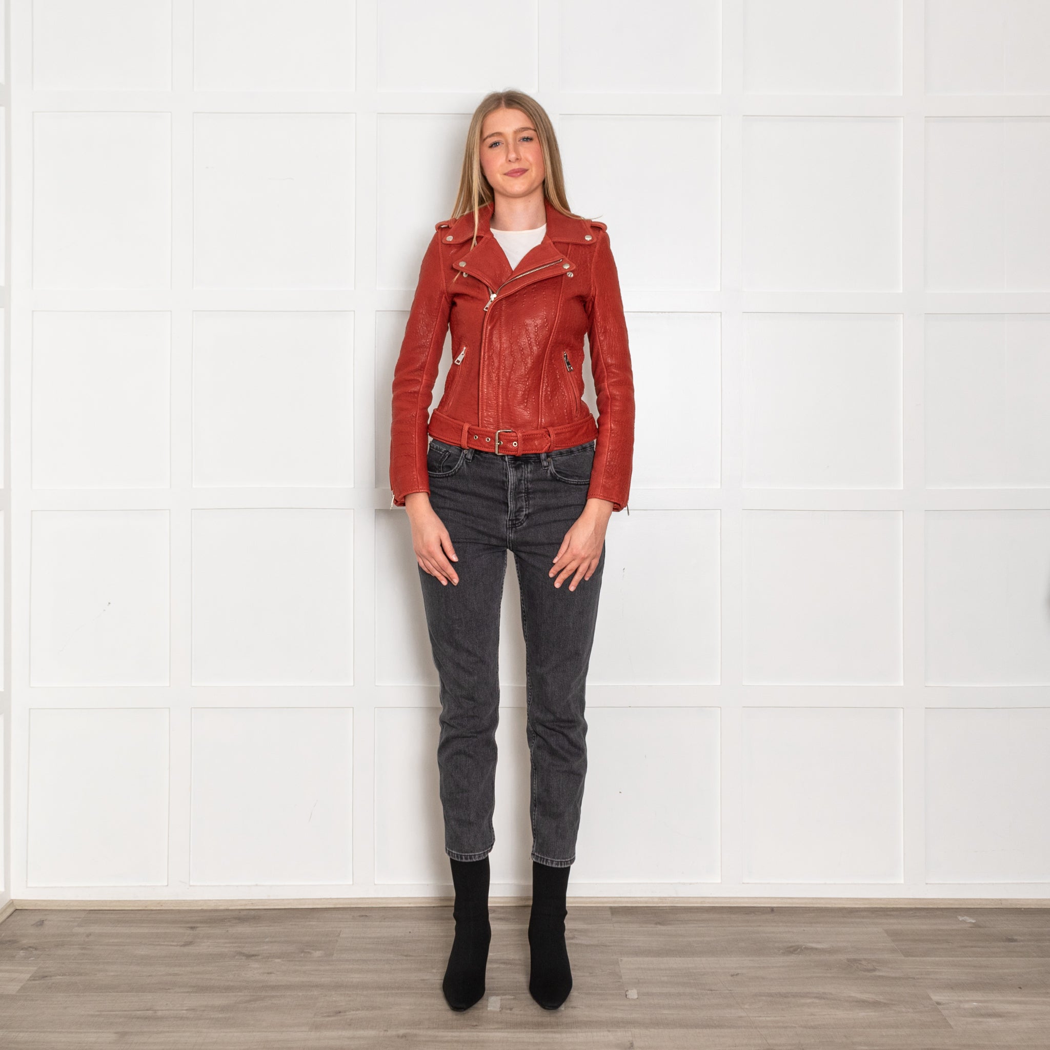 Maje red leather biker jacket, featuring a stunning textured design, with two front silver zipped pockets, a single front zip and a classic collar, with a matching leather adjustable belt.