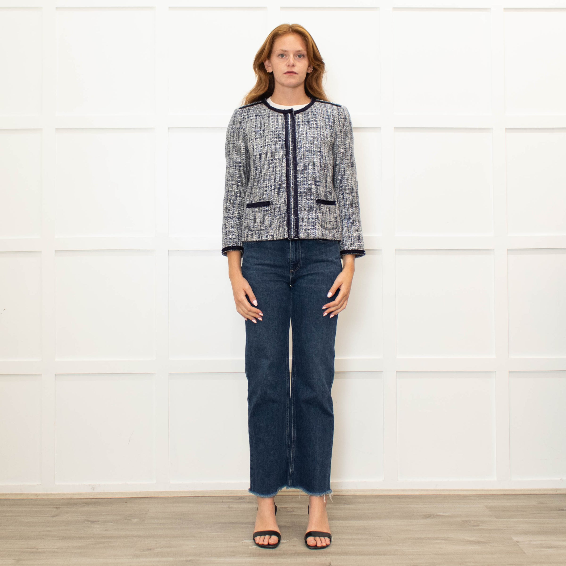 Marella blue cotton trim tweed jacket with raw edge detailing, long sleeves, and a popper fastened front.