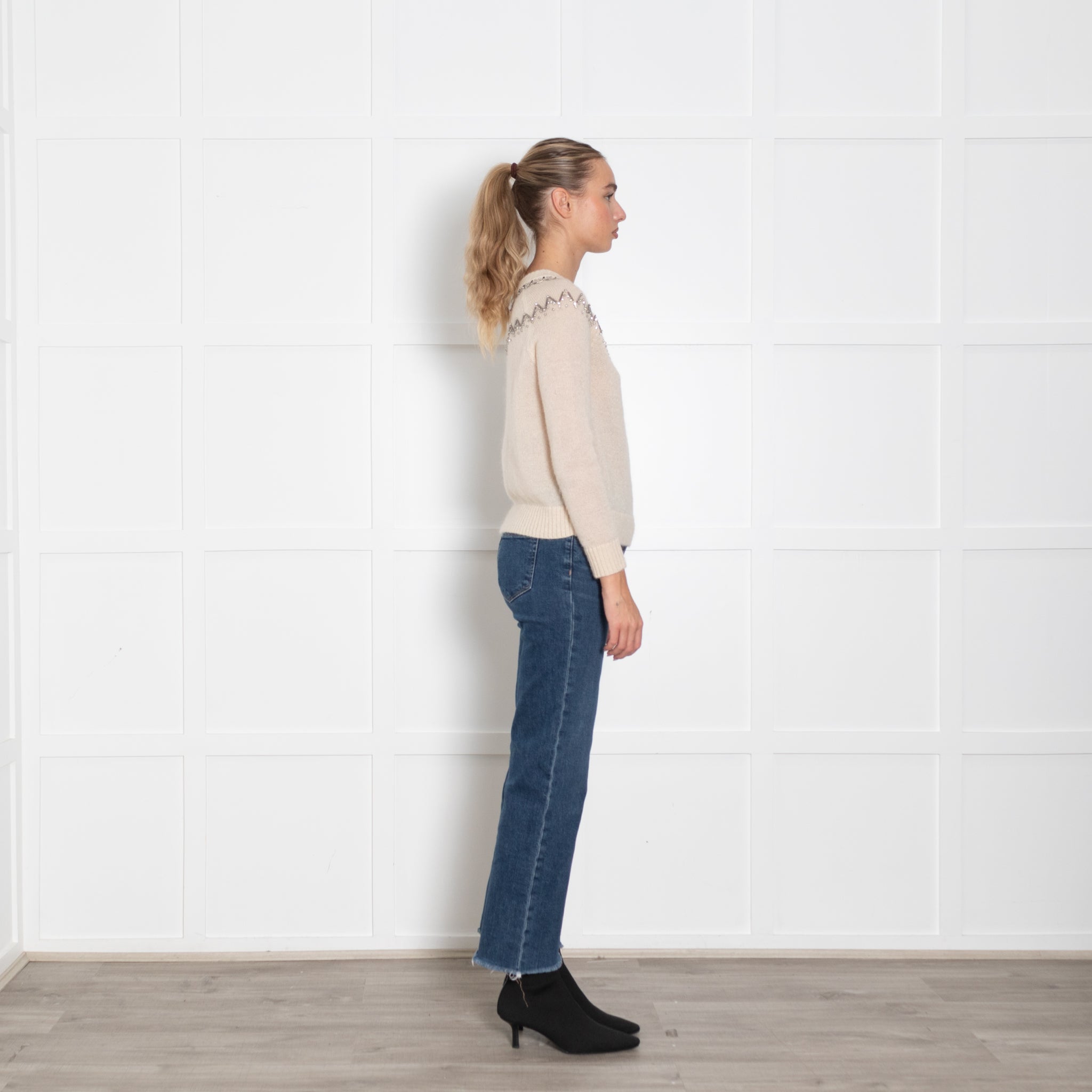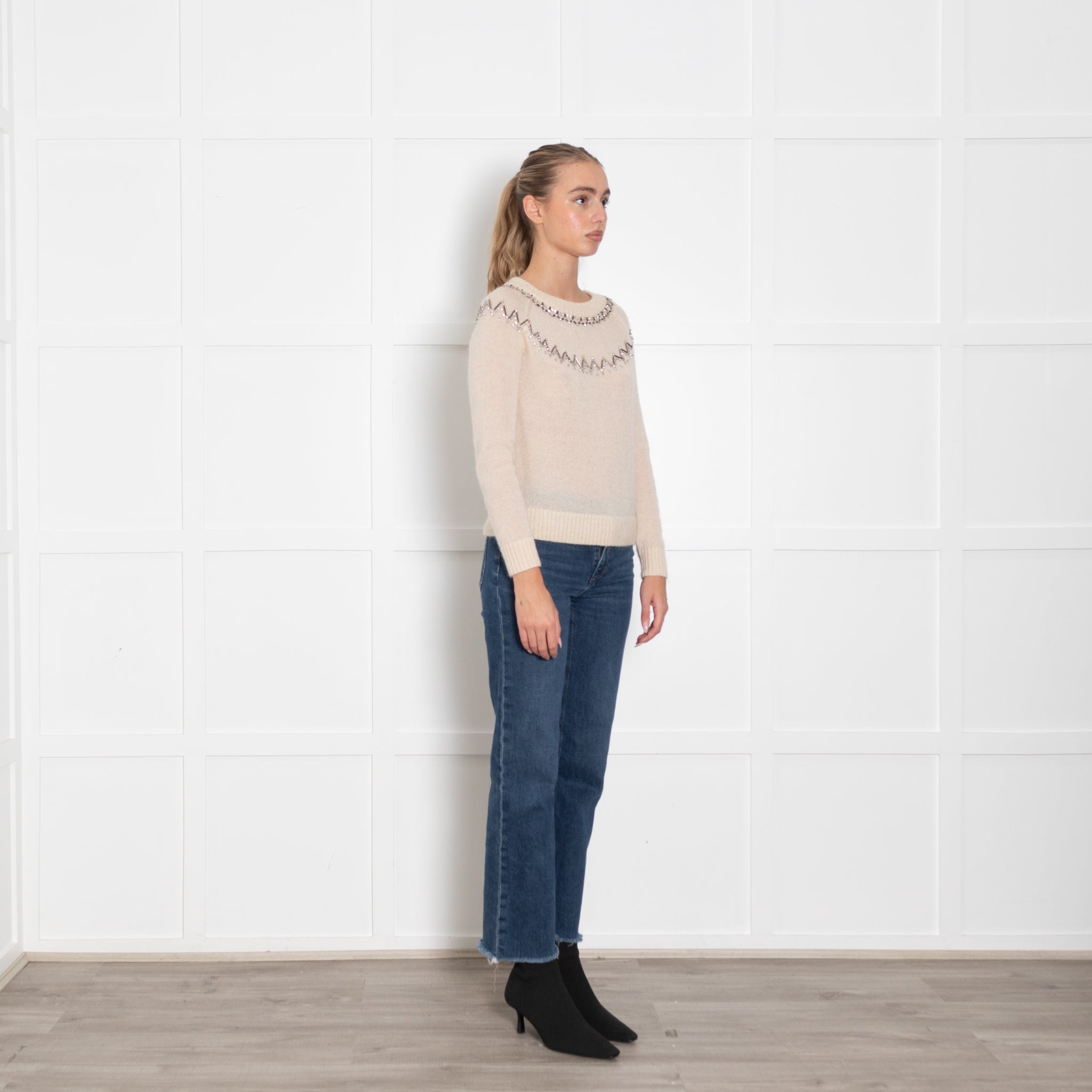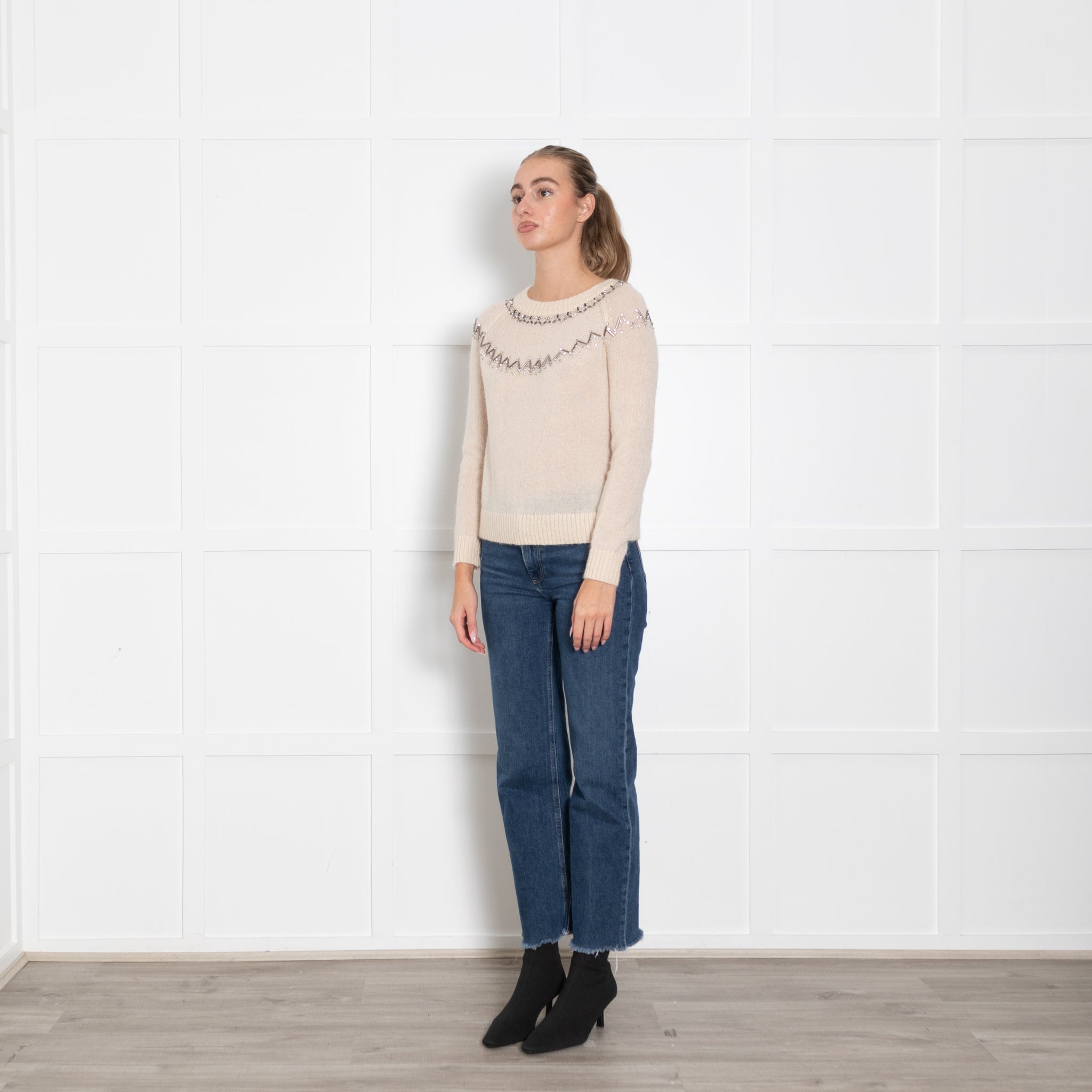 Marie Sixtine cream long-sleeve sweater, crafted with soft mohair wool, featuring a classic rounded neckline, with silver and diamante yoke front accent designs.