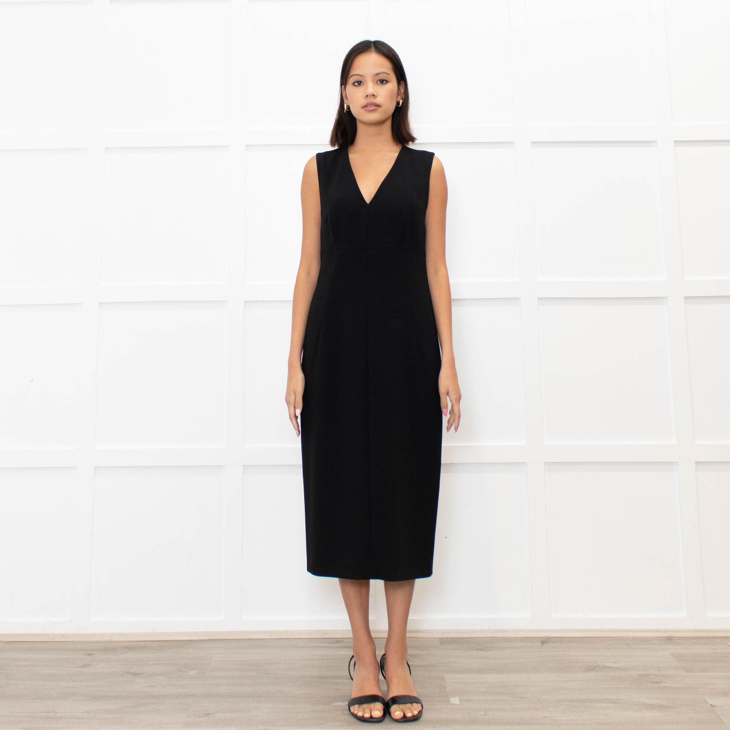 Max Mara black crepe sleeveless shift dress with a V-shaped neckline, a rear zip fastener, a rear hem split, and a panelled design.