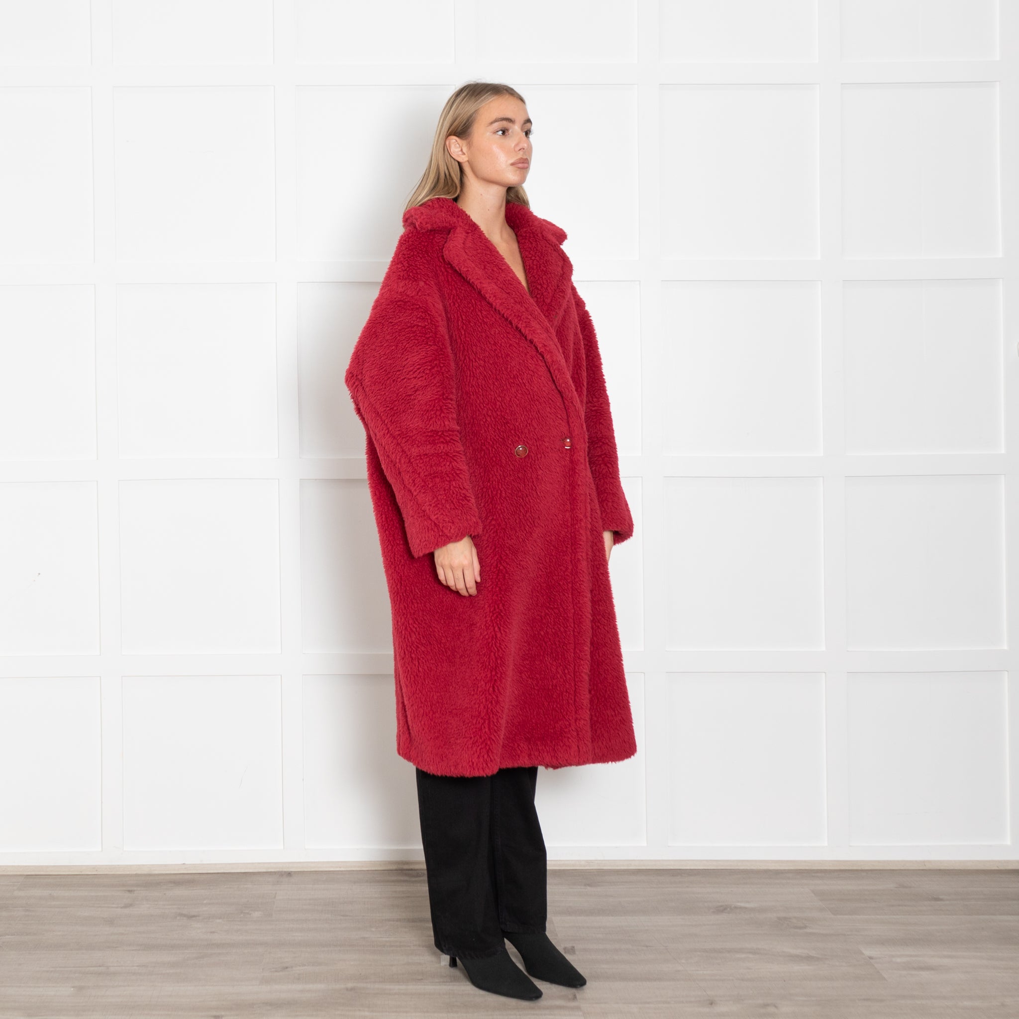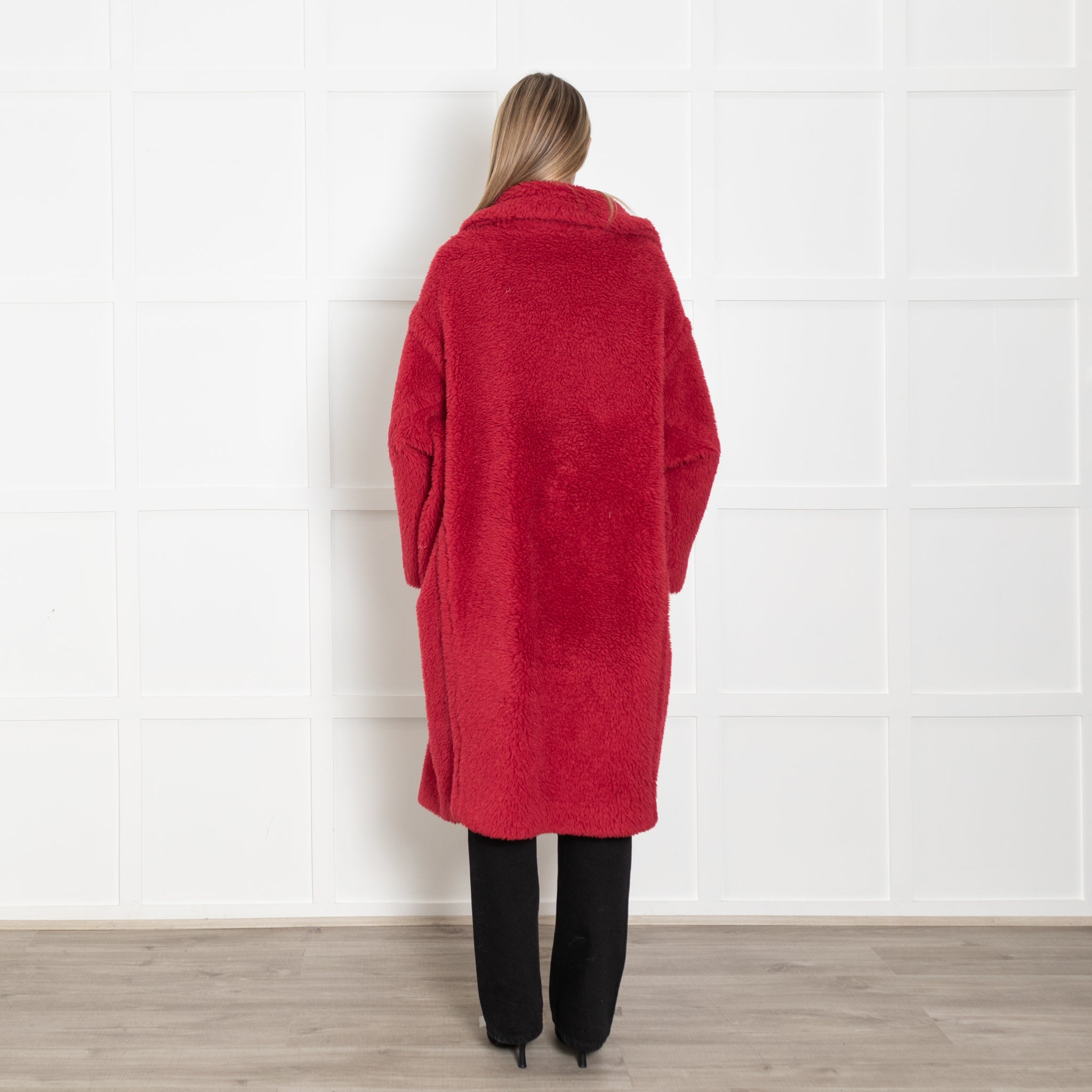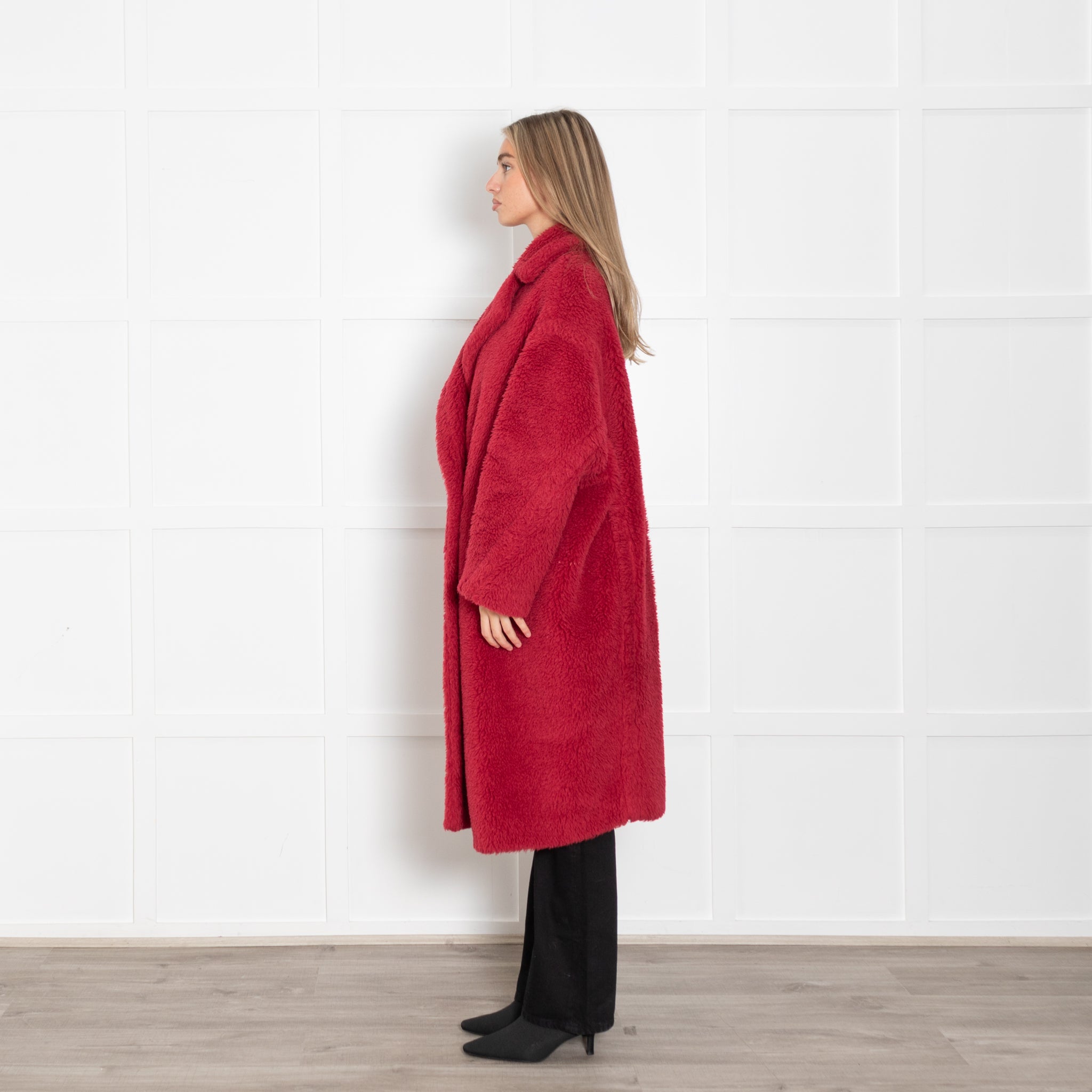 Max Mara long-sleeve red teddy coat, crafted with a stunning warm fur exterior, a beautiful red and black Max Mara interior lining and a single gold button-up front closure, featuring two front spacious pockets and a large classic collar.
