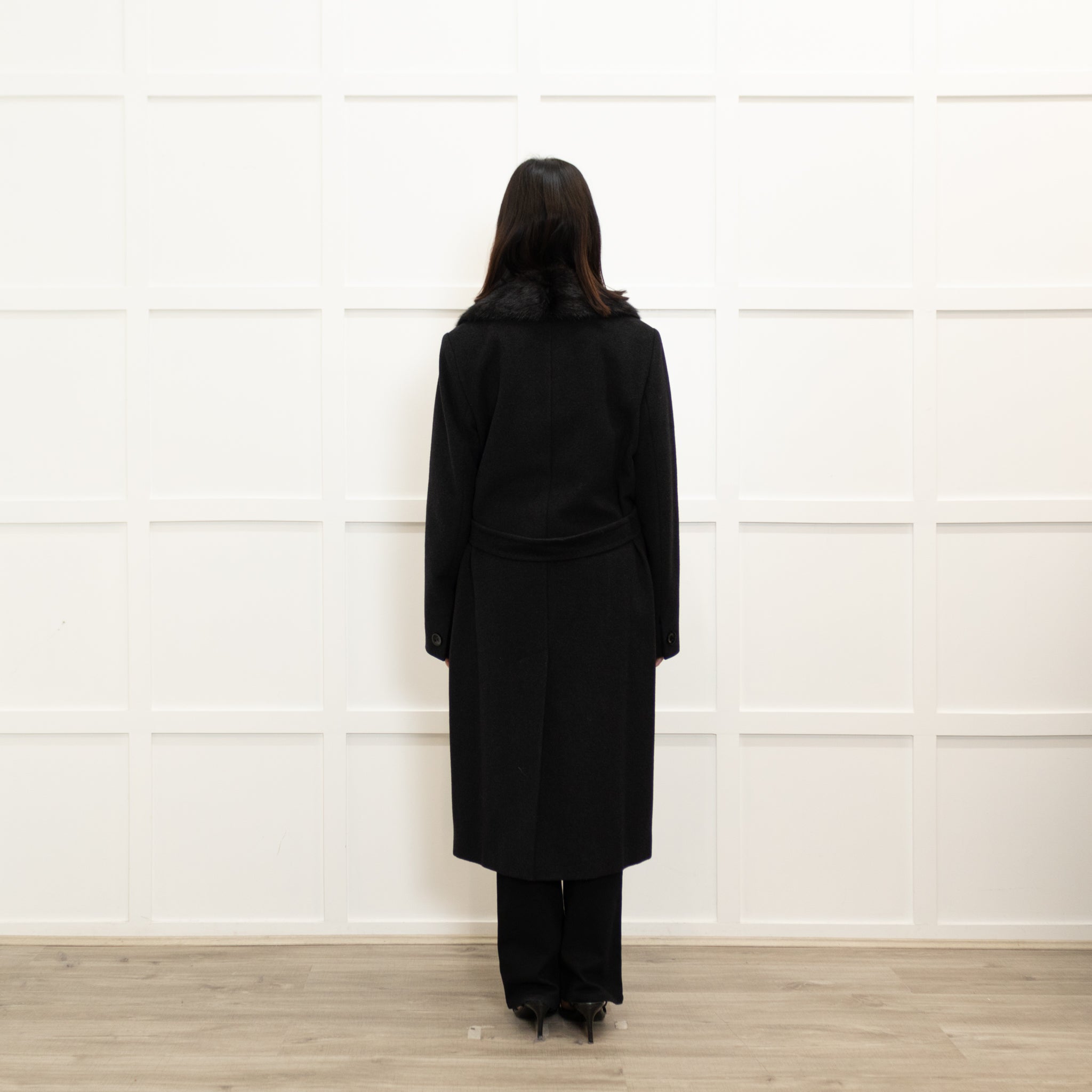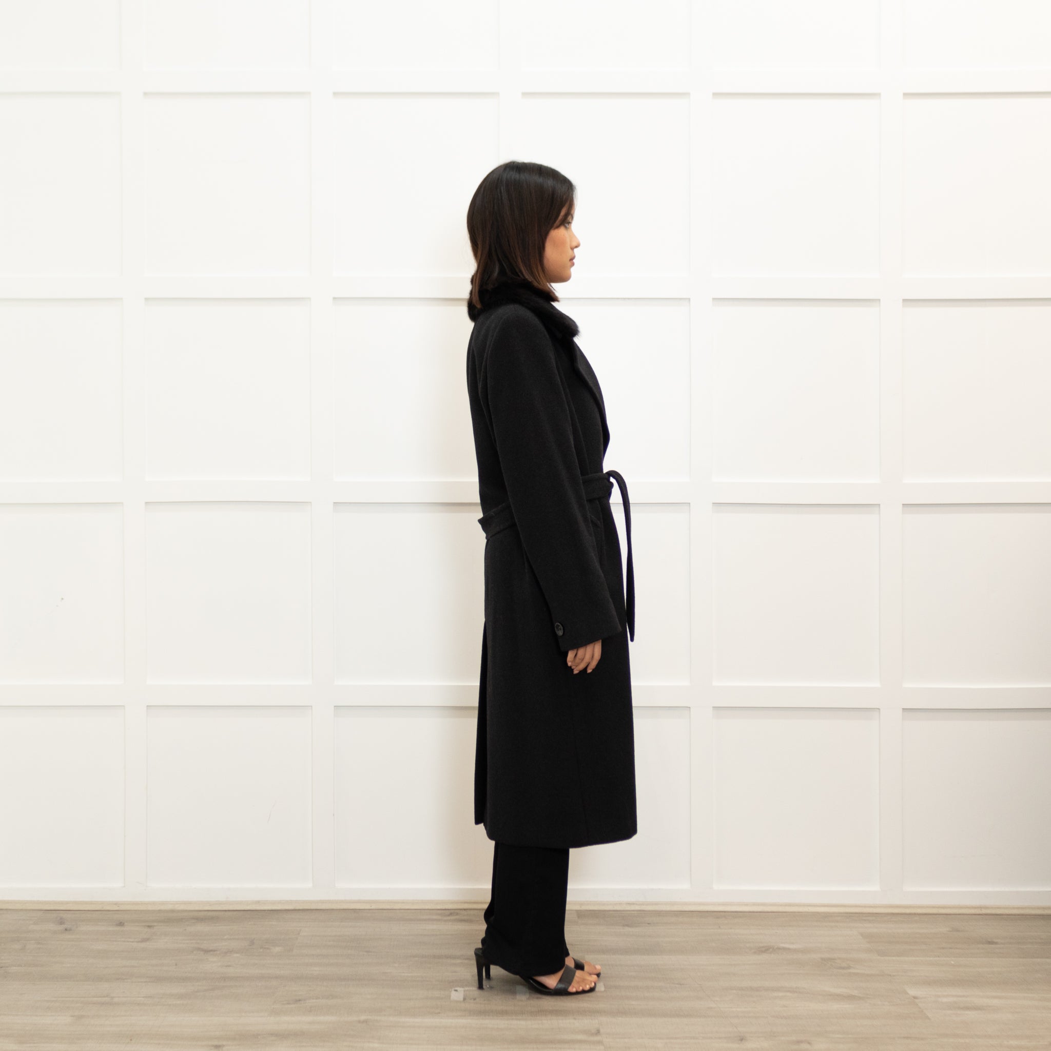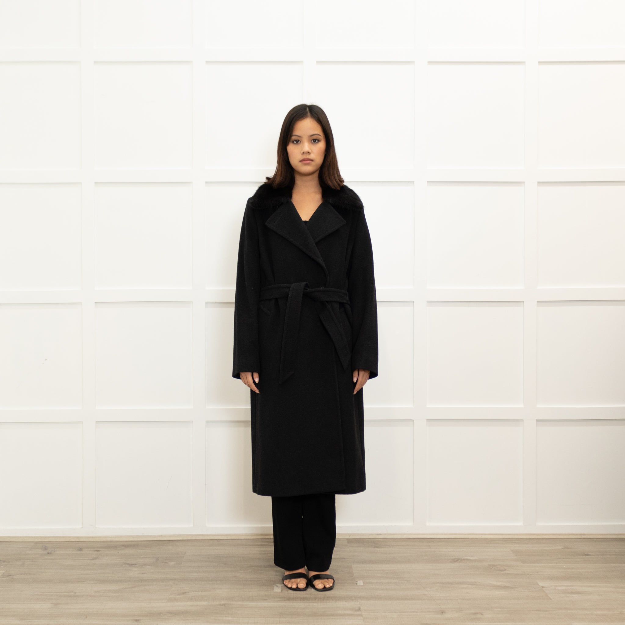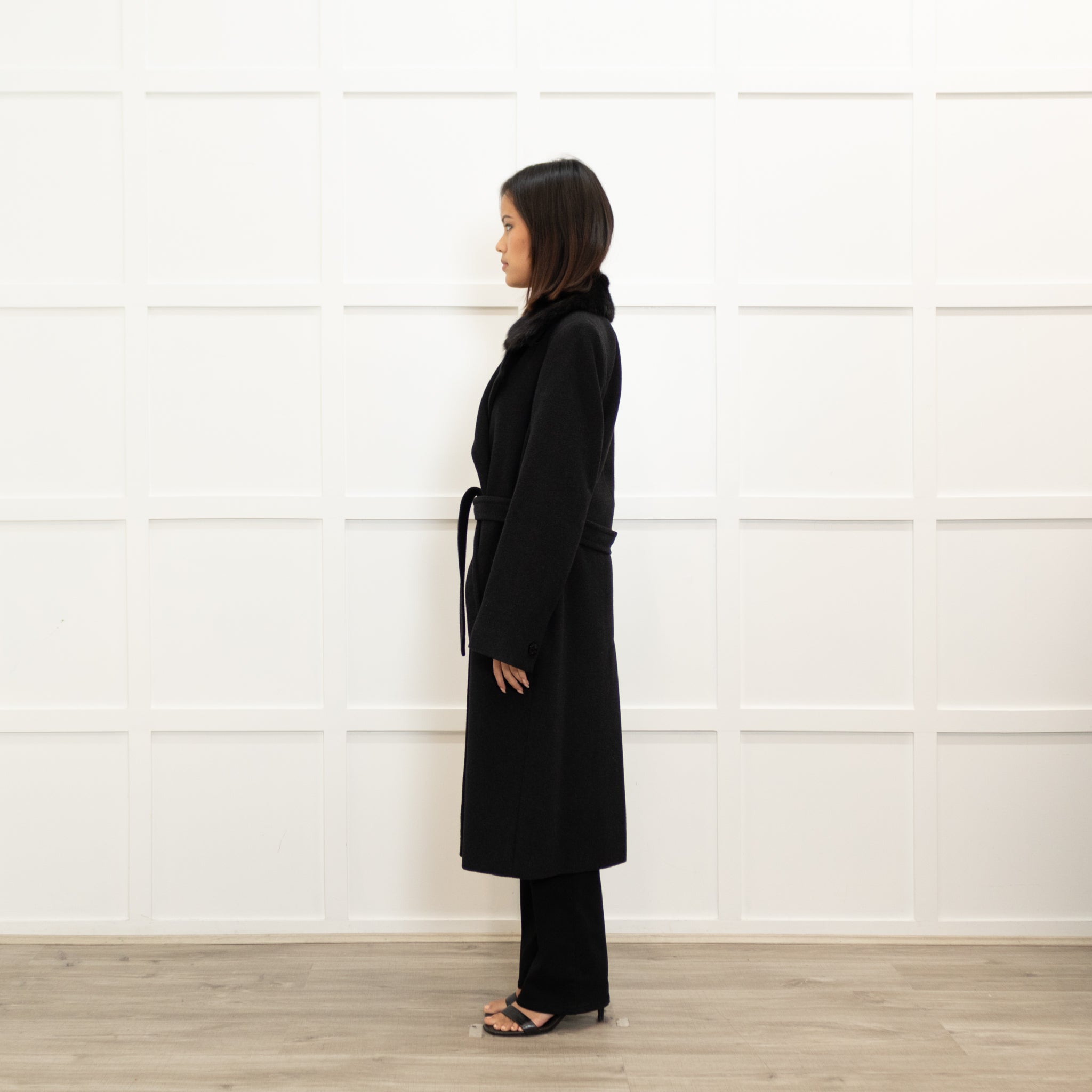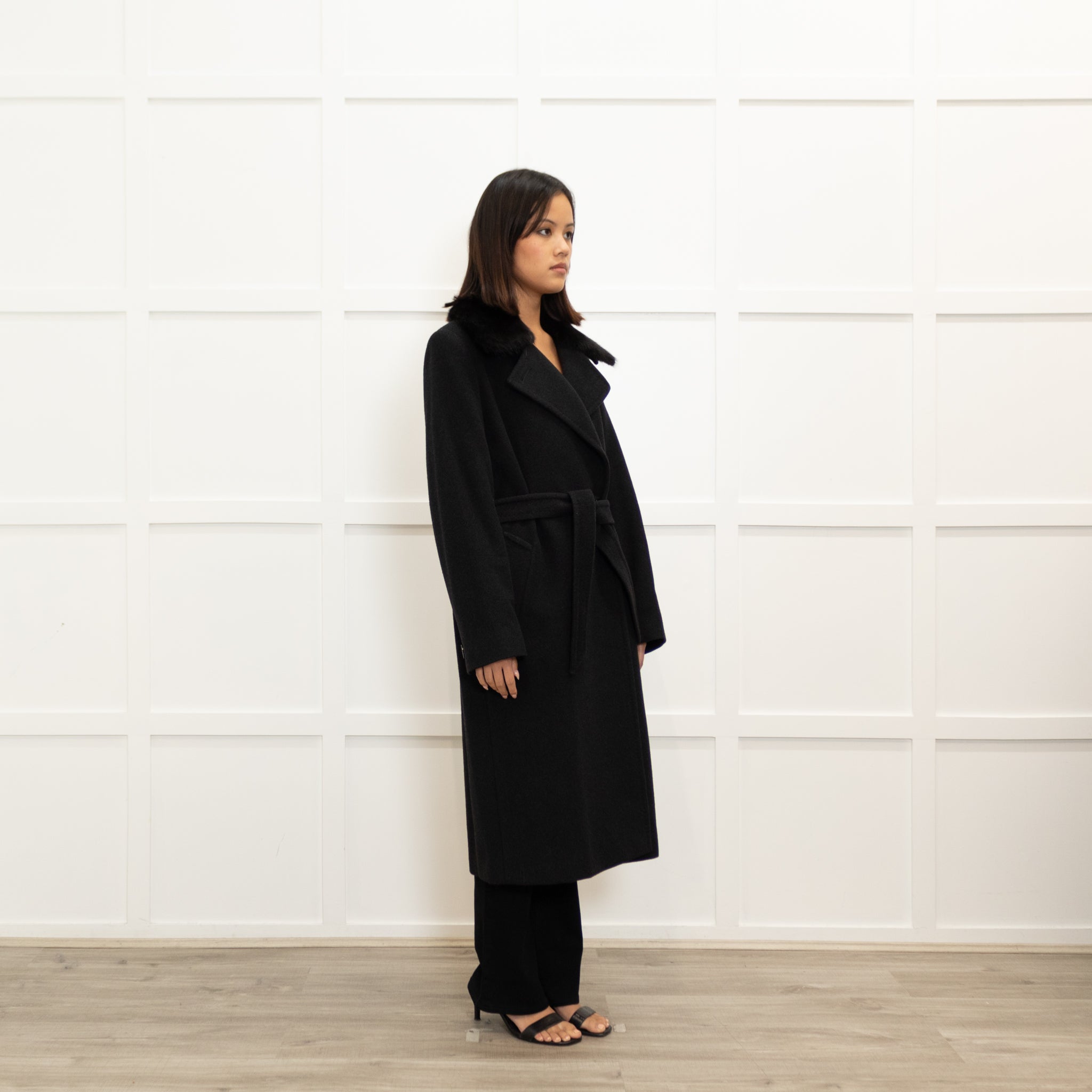 Max Mara Studio grey coat, featuring a stunning angora blend fur collar, two large button-up front closures, two spacious side pockets, and a matching waist tie for an elegant yet comfy look.