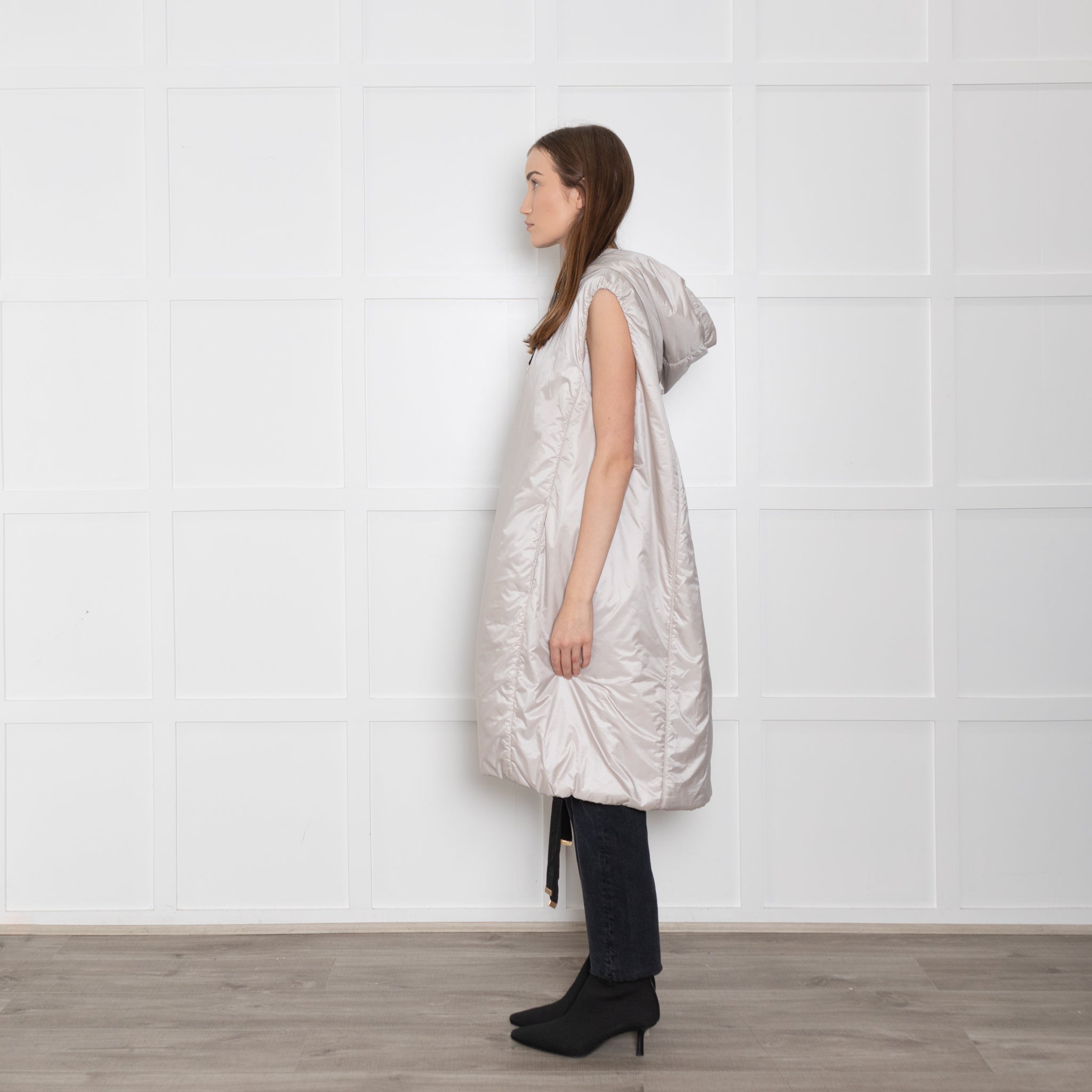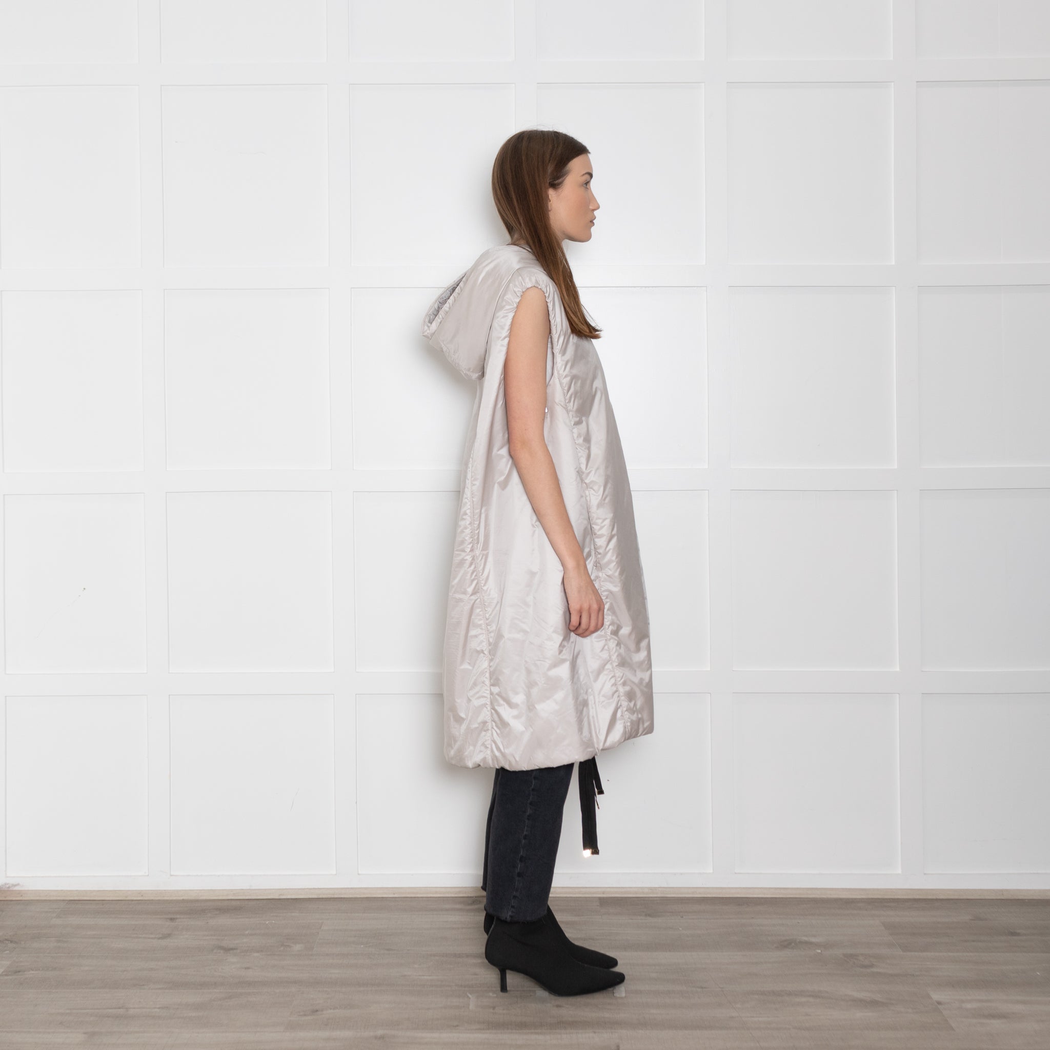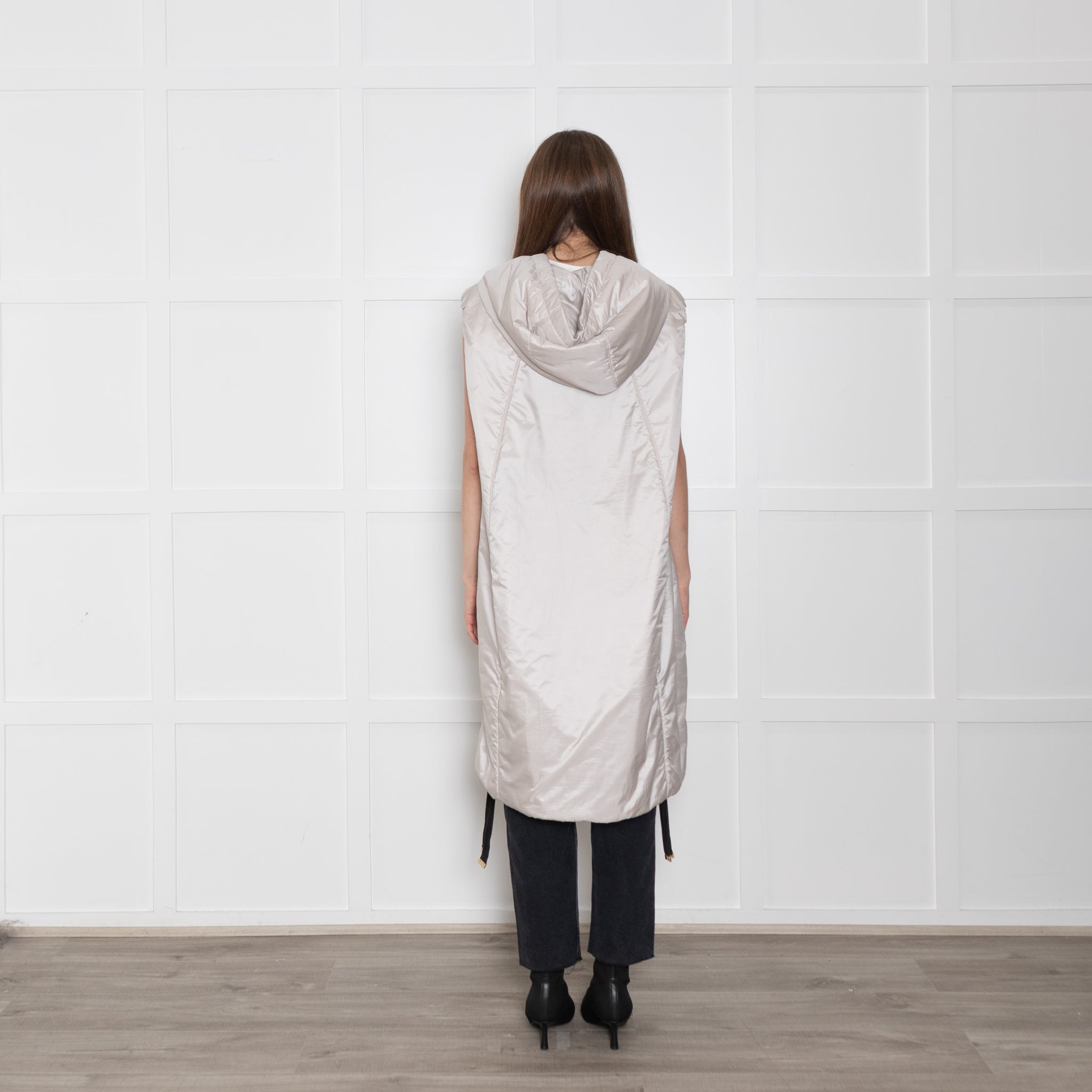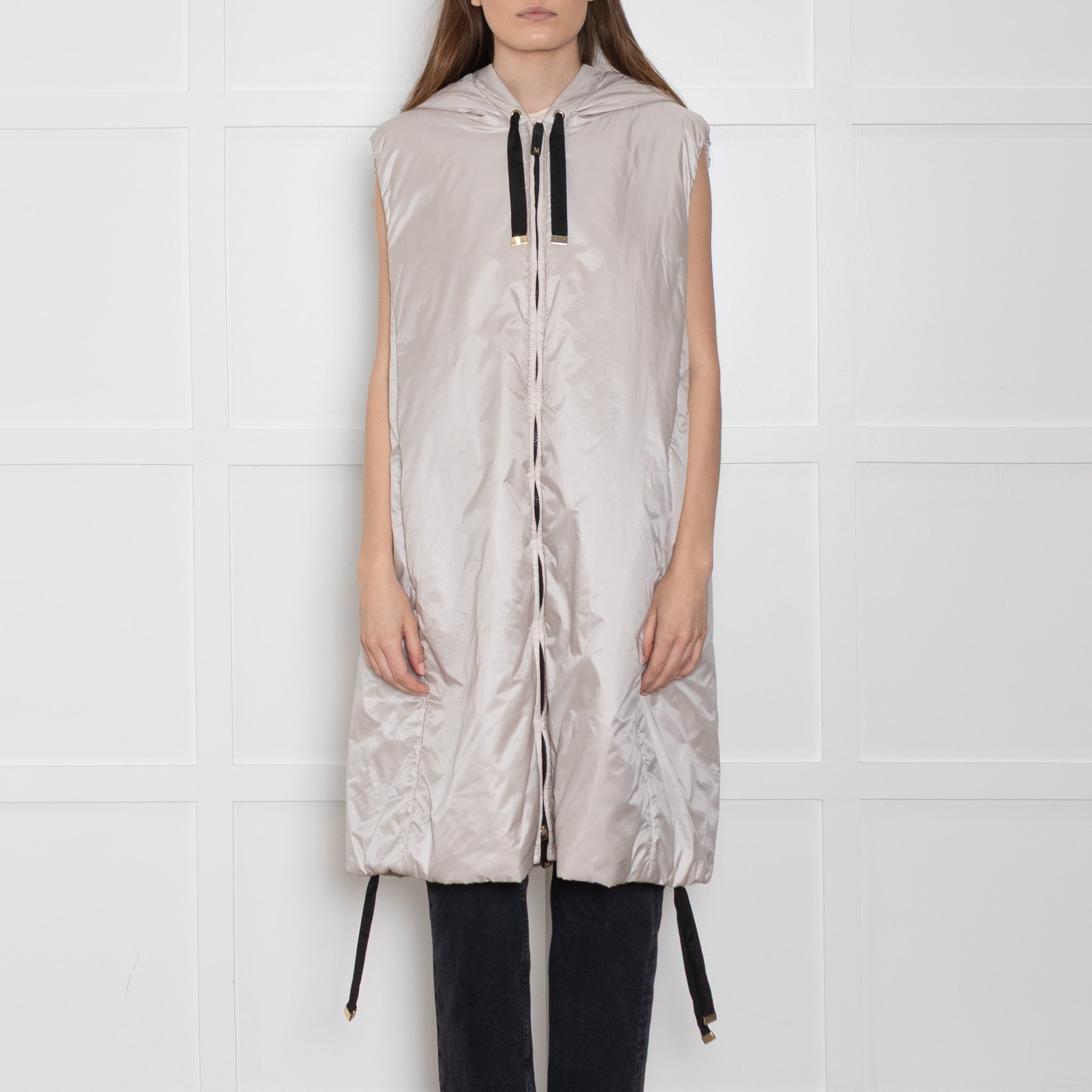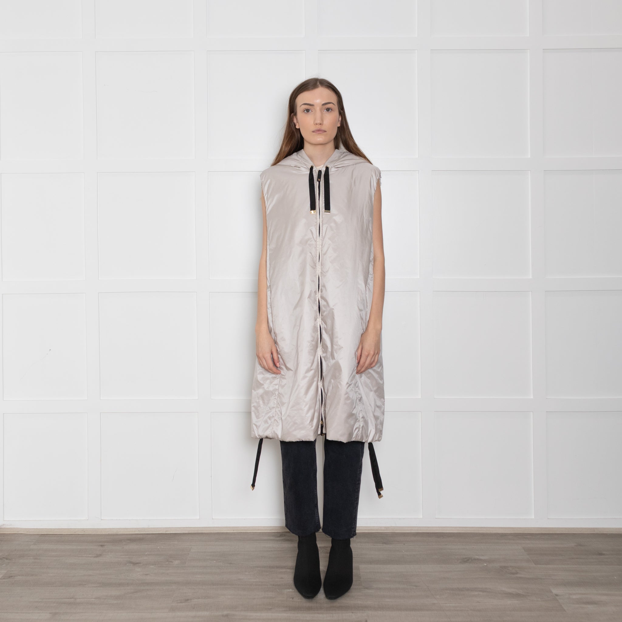 Max Mara The Cube long, hooded gilet in the colour putty. This jacket is sleeveless with an attached hood, poppers fastening down the side seams, side slip pockets, and front zip fastener.