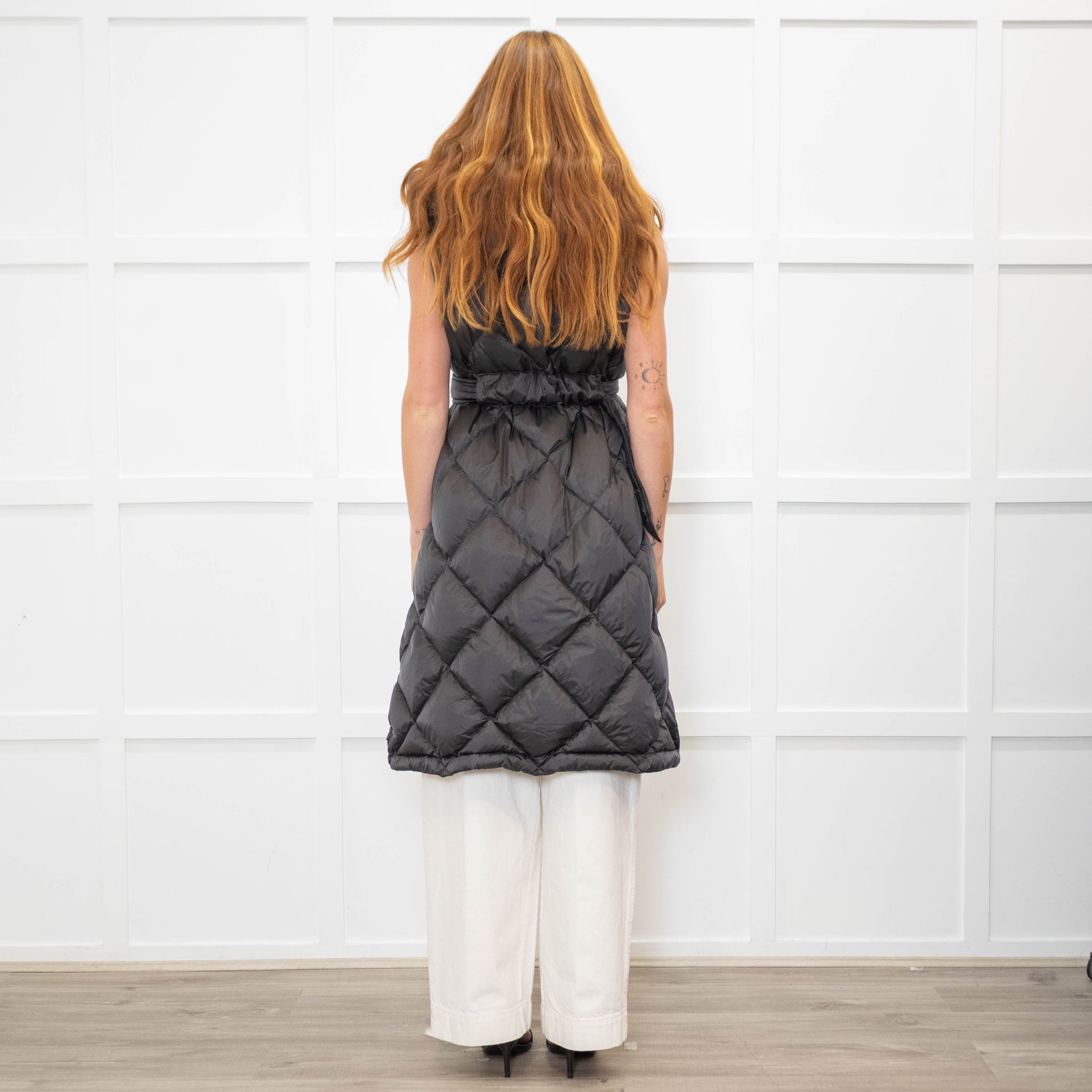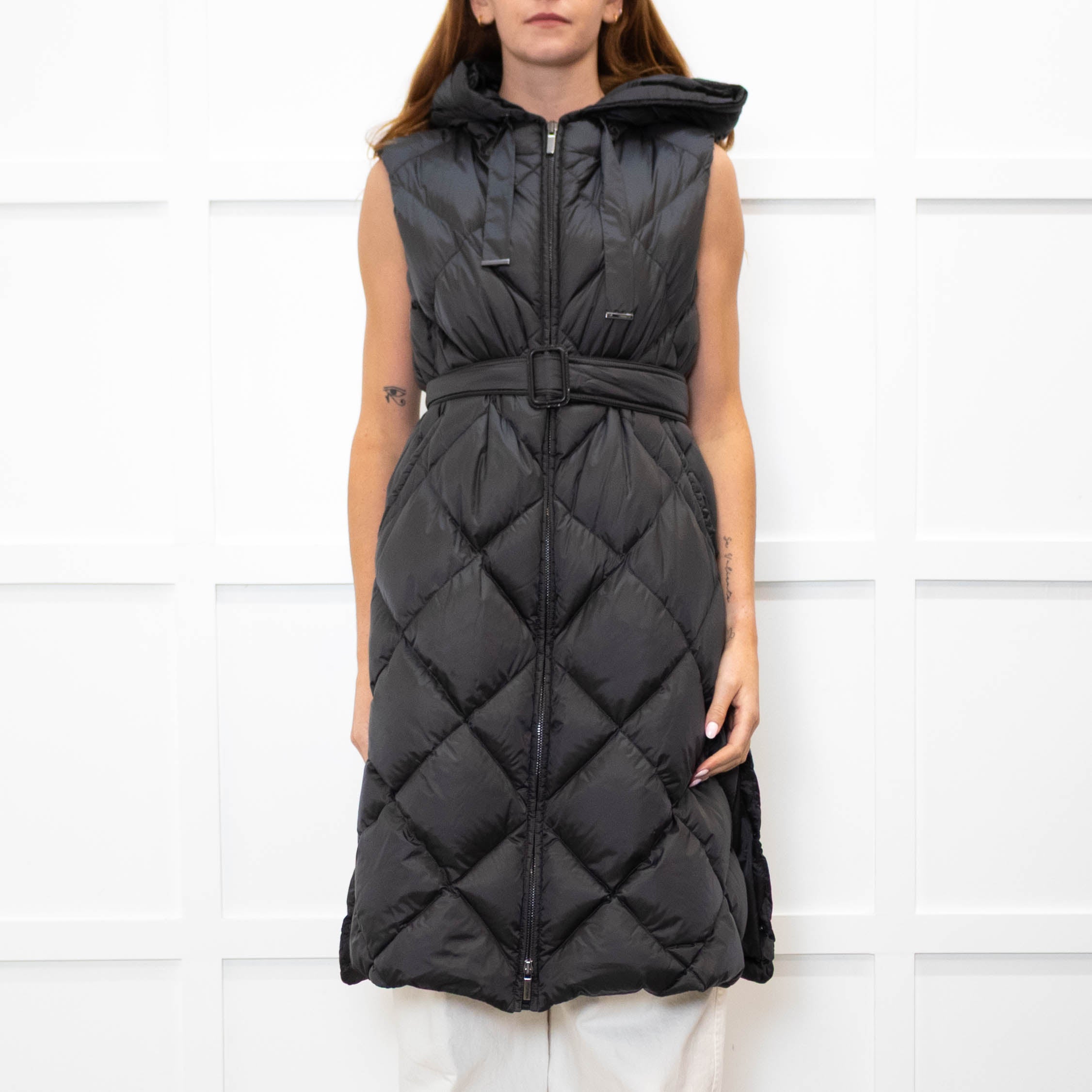 Max Mara The Cube grey quilted long hooded gilet with drawstring toggles, front zip closure, a tonal belt, and two side slip pockets.