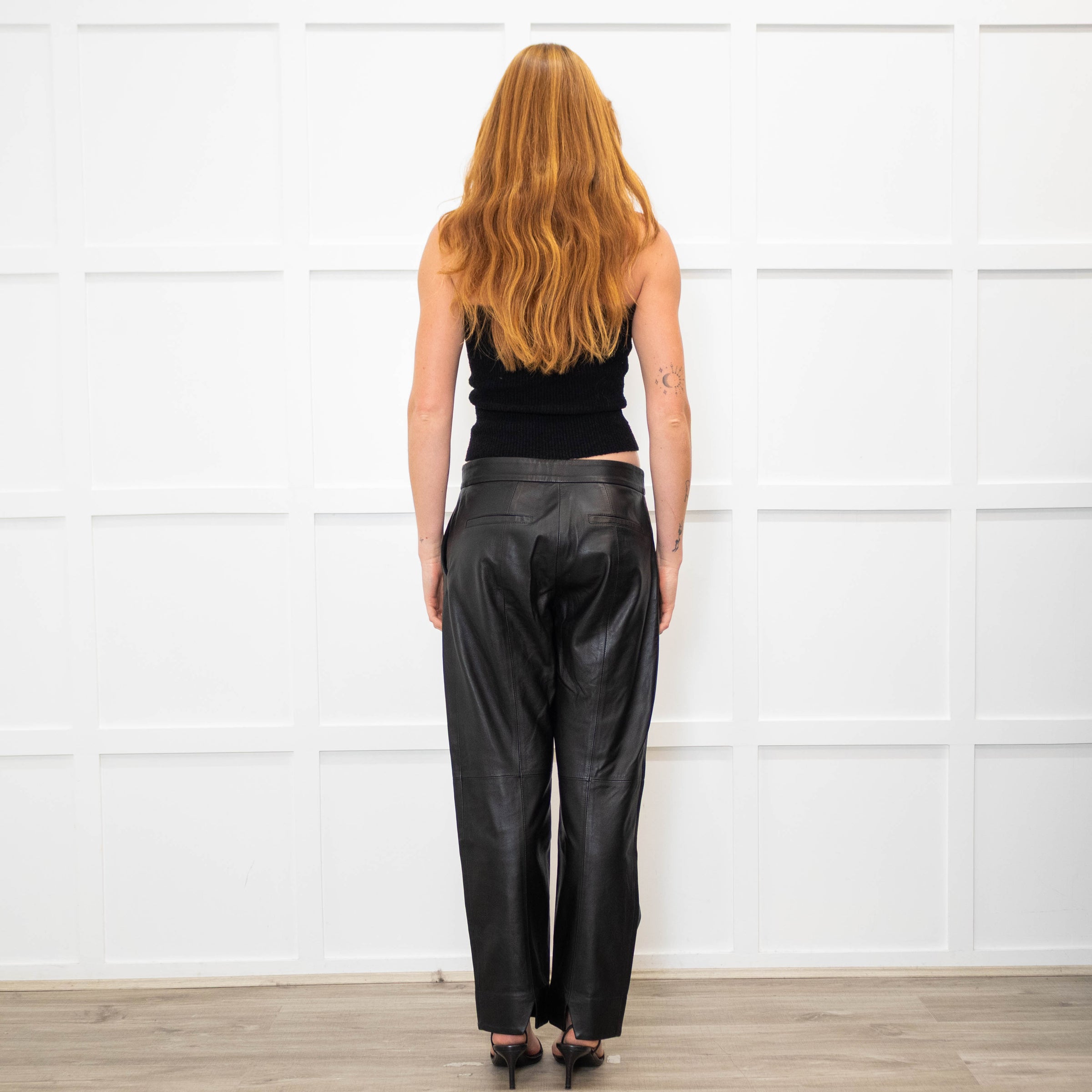 Me + Em black leather front panel stitch trousers with concealed front zip and metal clip flies and four pockets.