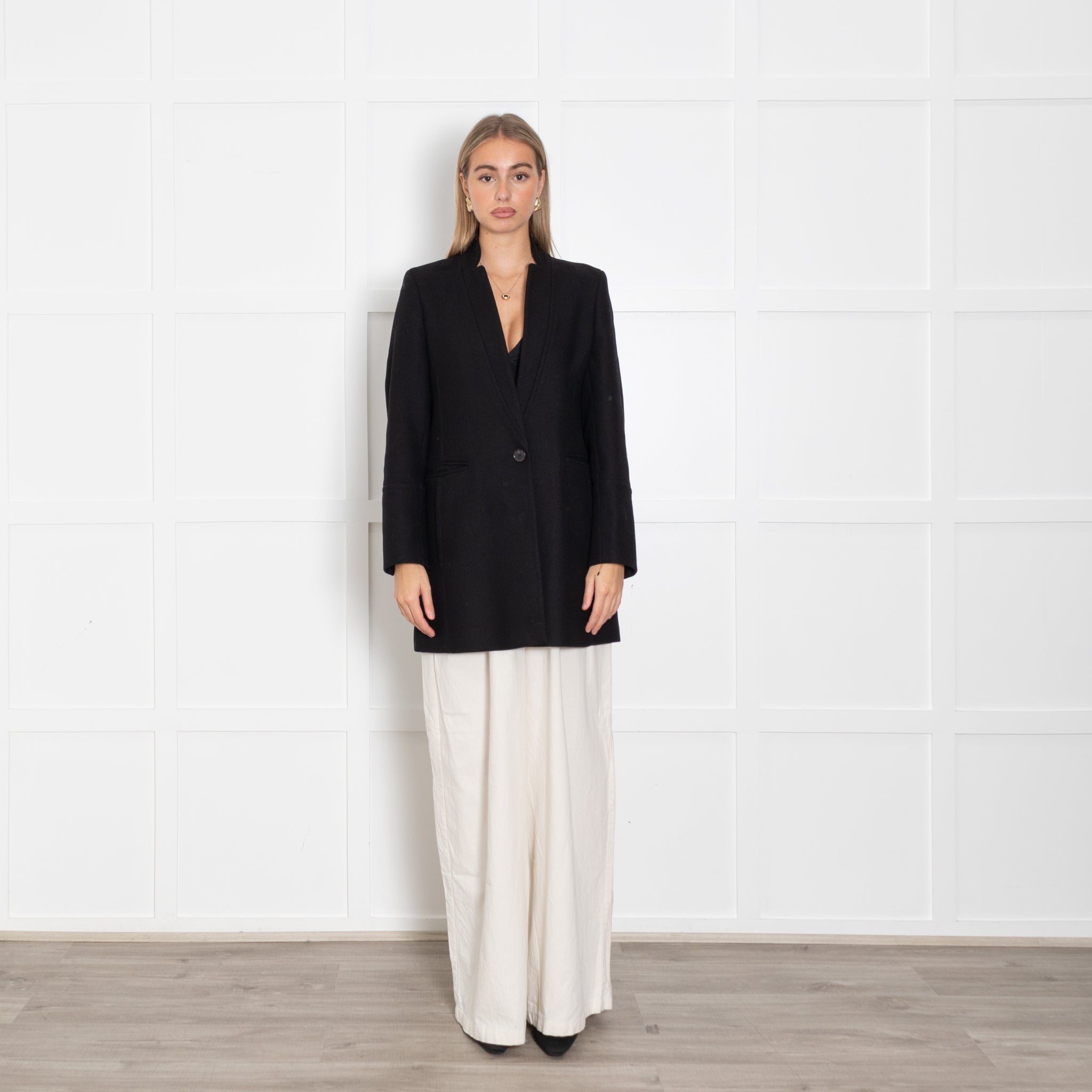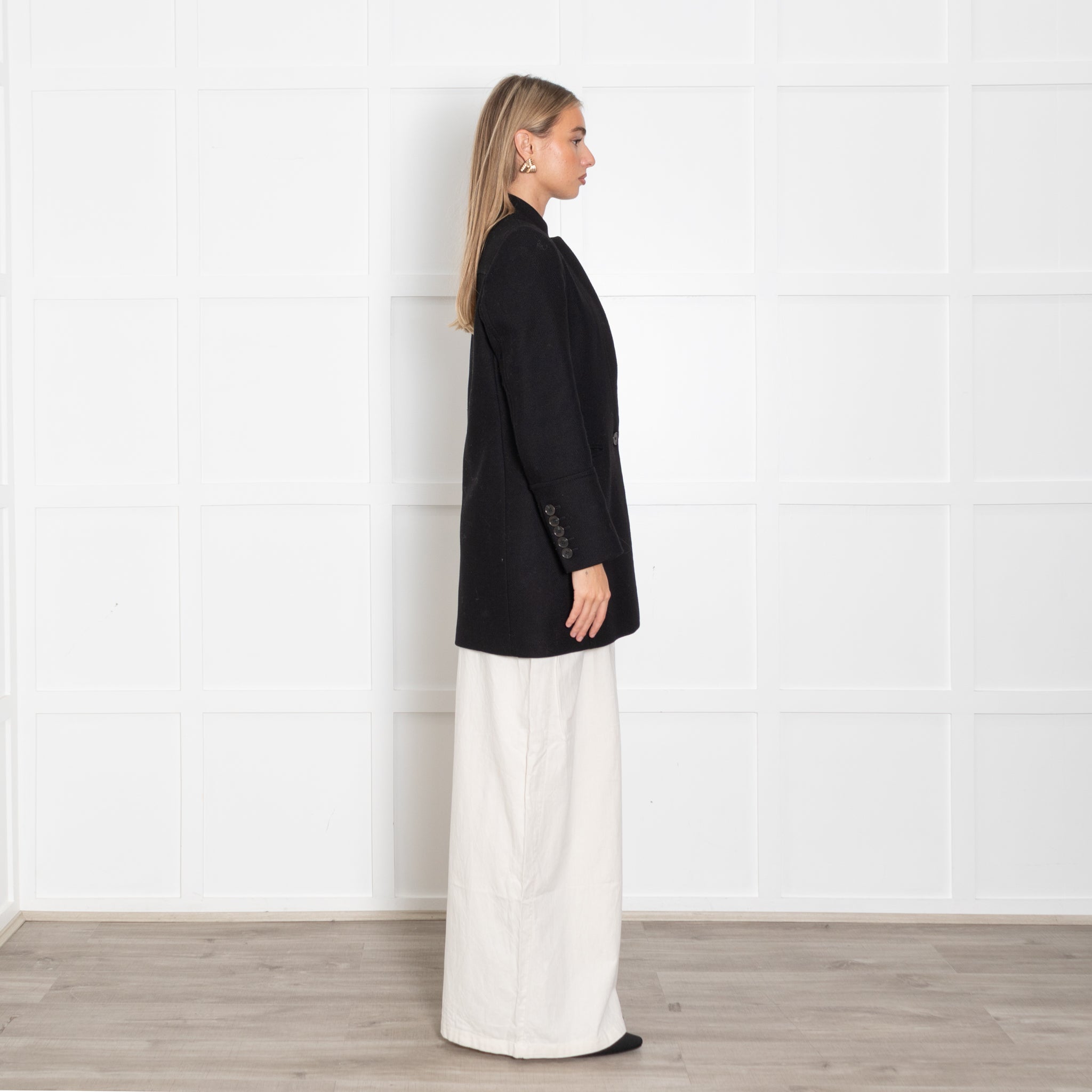 Me & Em long-sleeve black coat, crafted with a stunning, comfy wool blend fabric, featuring a textured wool design, a classic collar, two front pockets, with a single button-up closure.