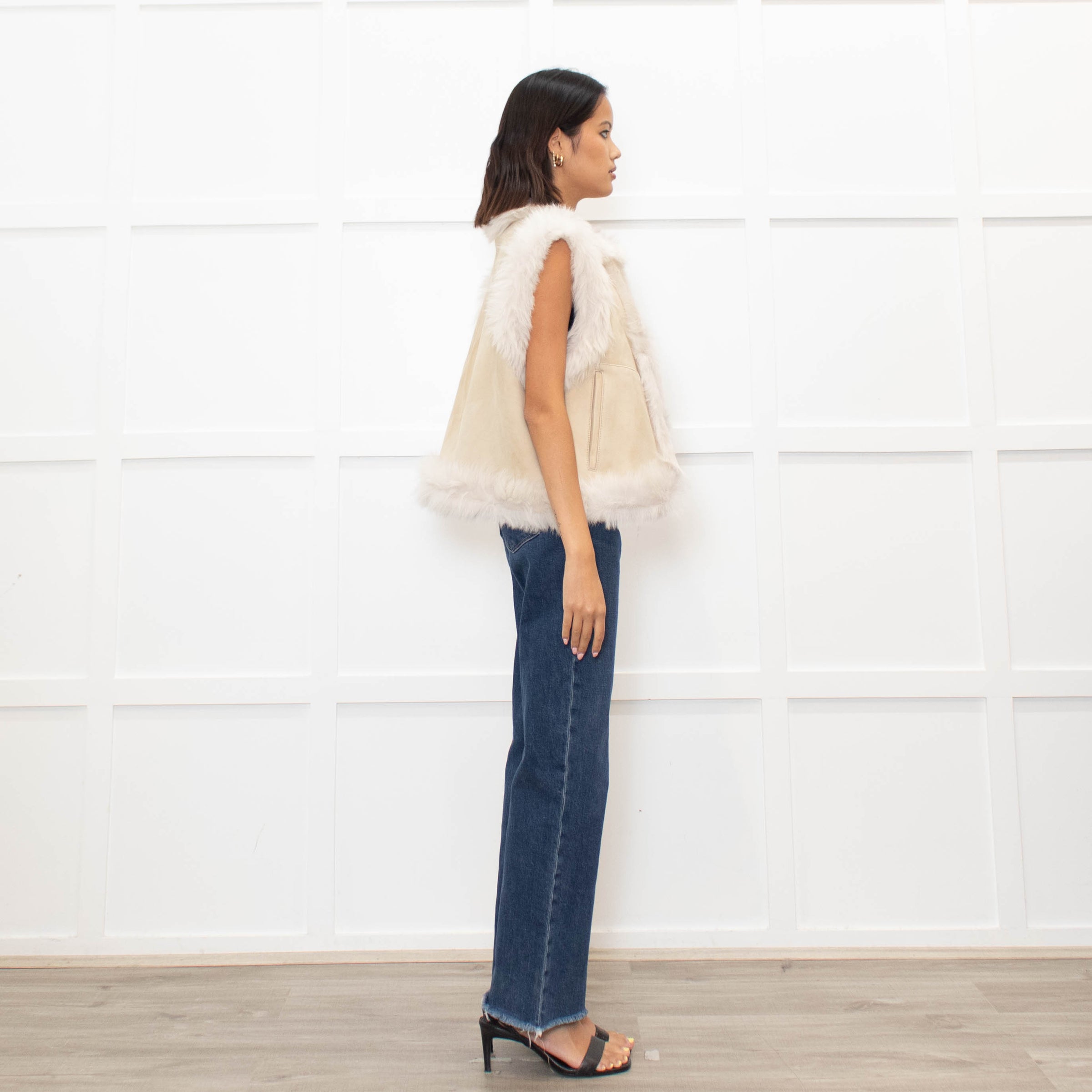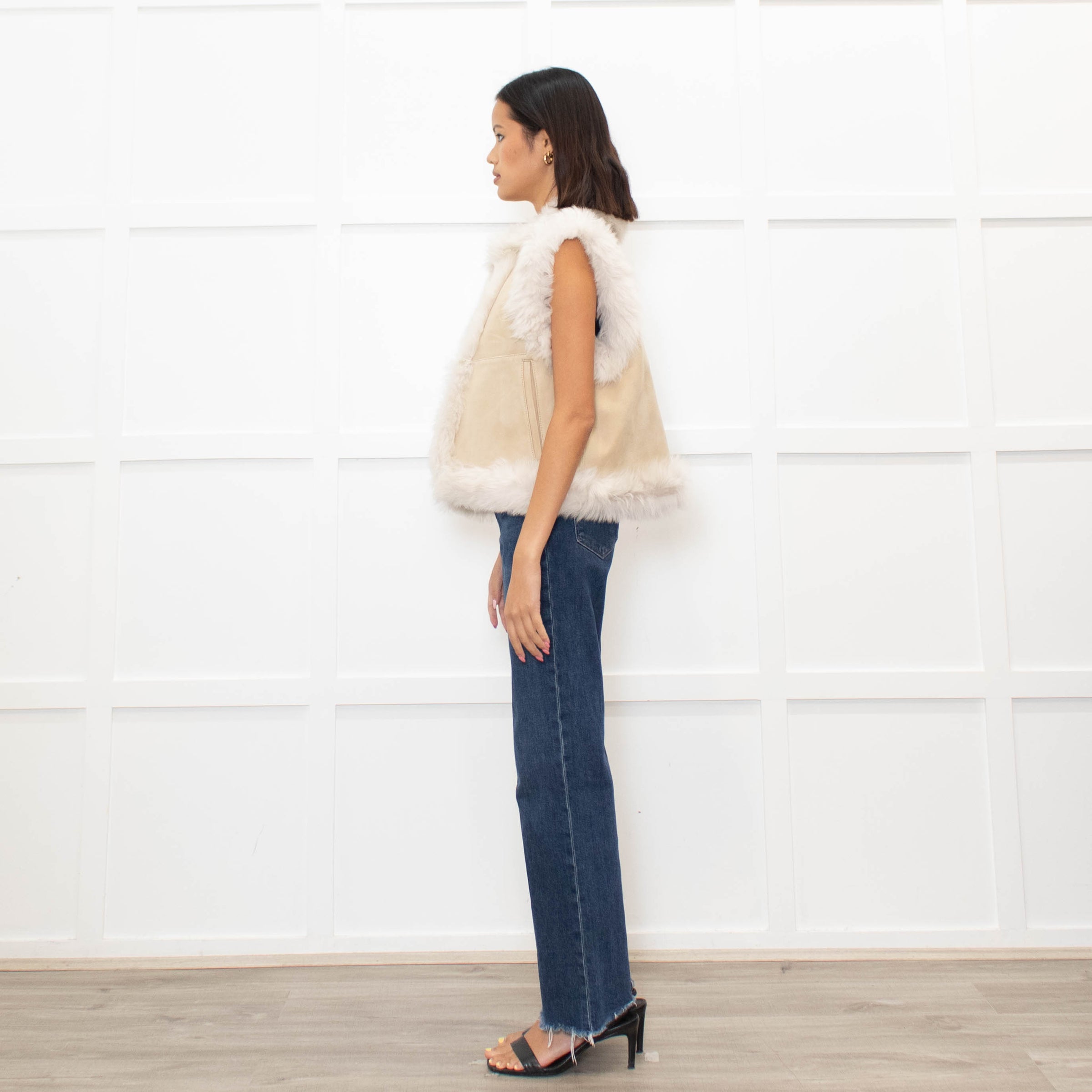 Me + Em cream reversible shearling gilet with hook and eye closures, and side slip pockets.