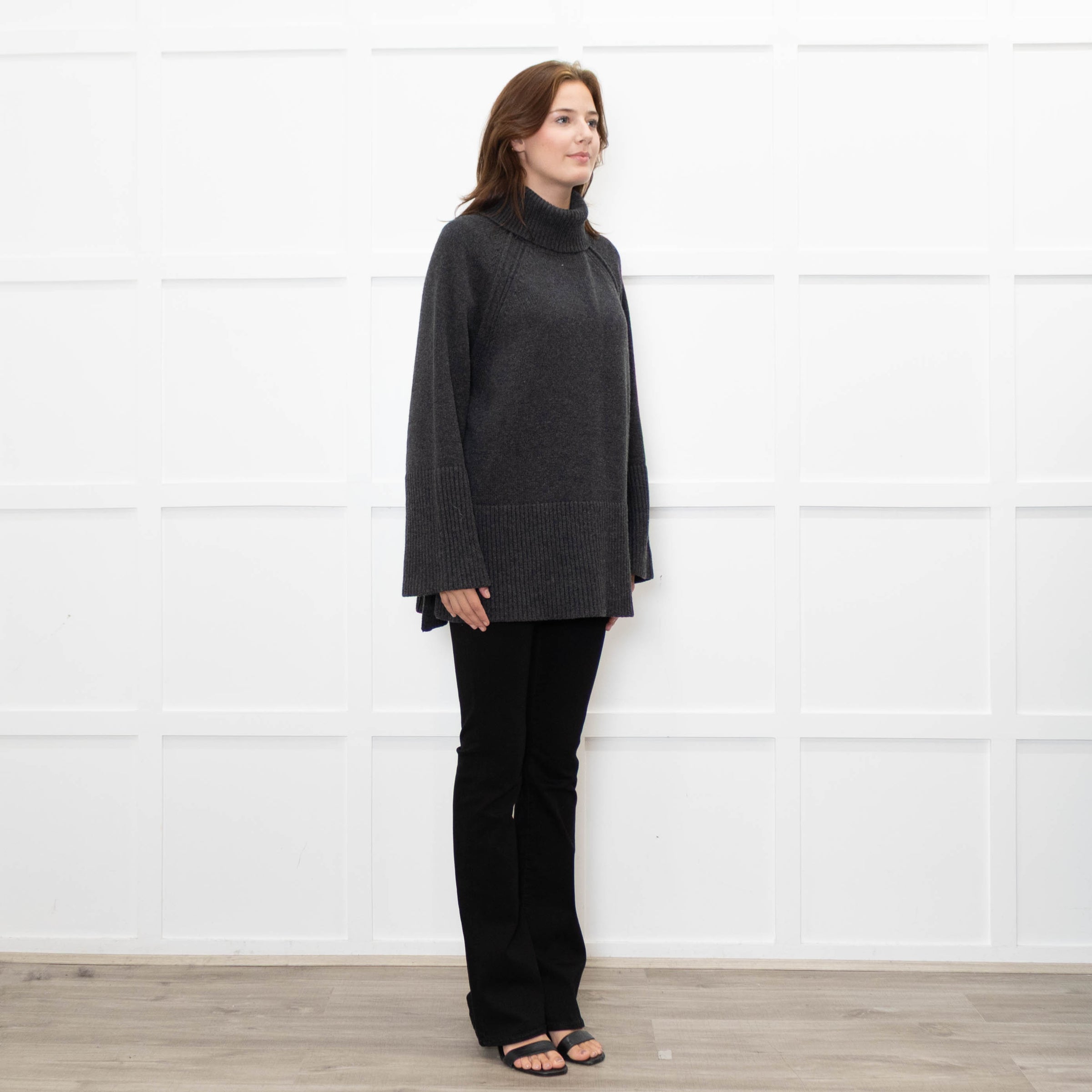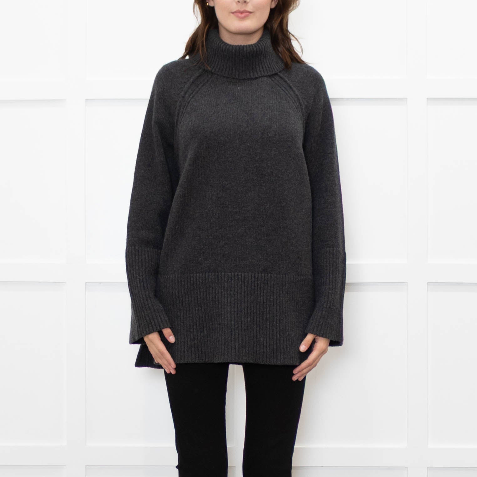 ME + EM grey chunky merino wool knit jumper, ribbed texture to the arms and hem, turtle neck split at the front. Has an oversized fit