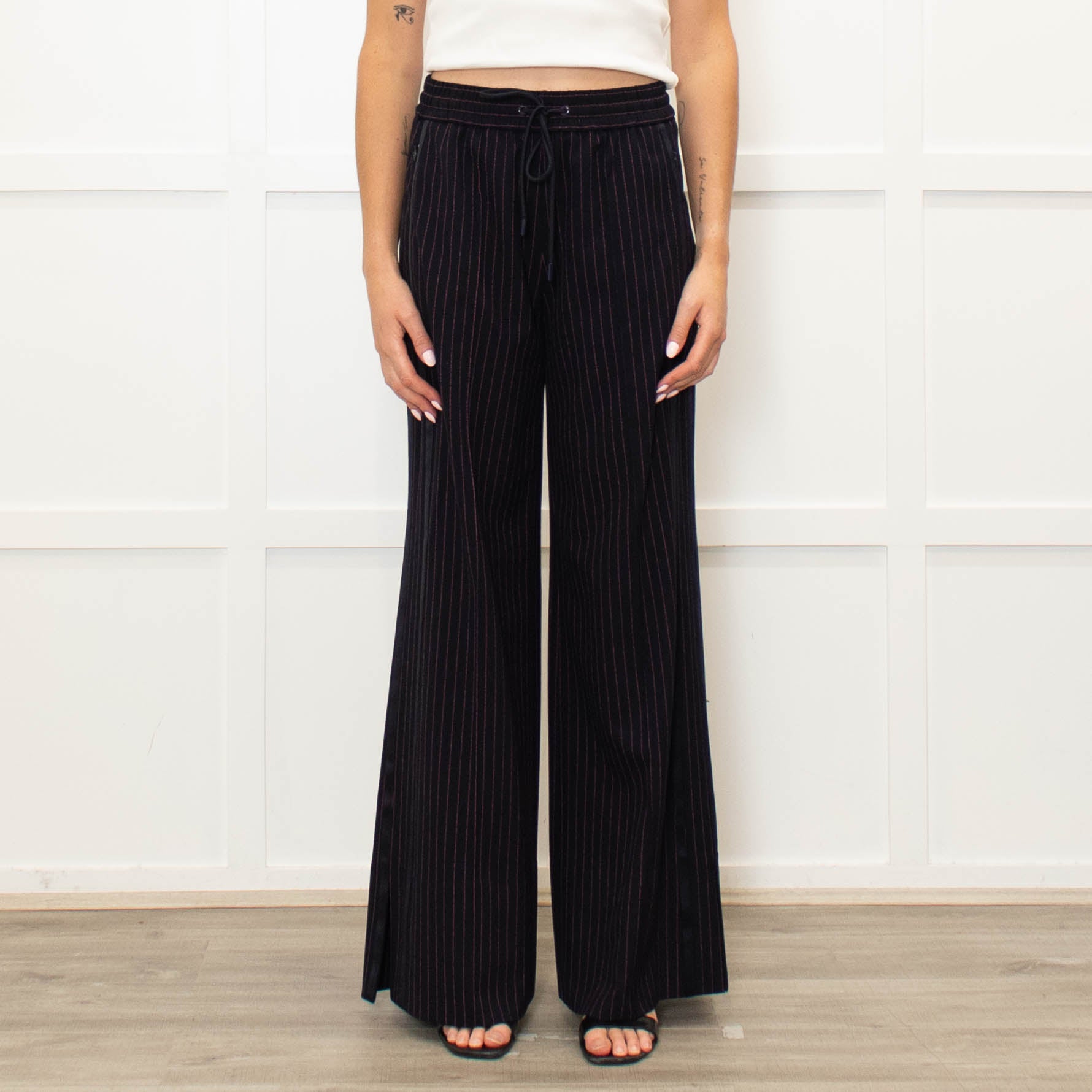 Me + Em navy blue and pink pinstripe wide leg trousers with an elasticated drawstring waist, side zipped pockets, and faux rear pockets. New with tags.