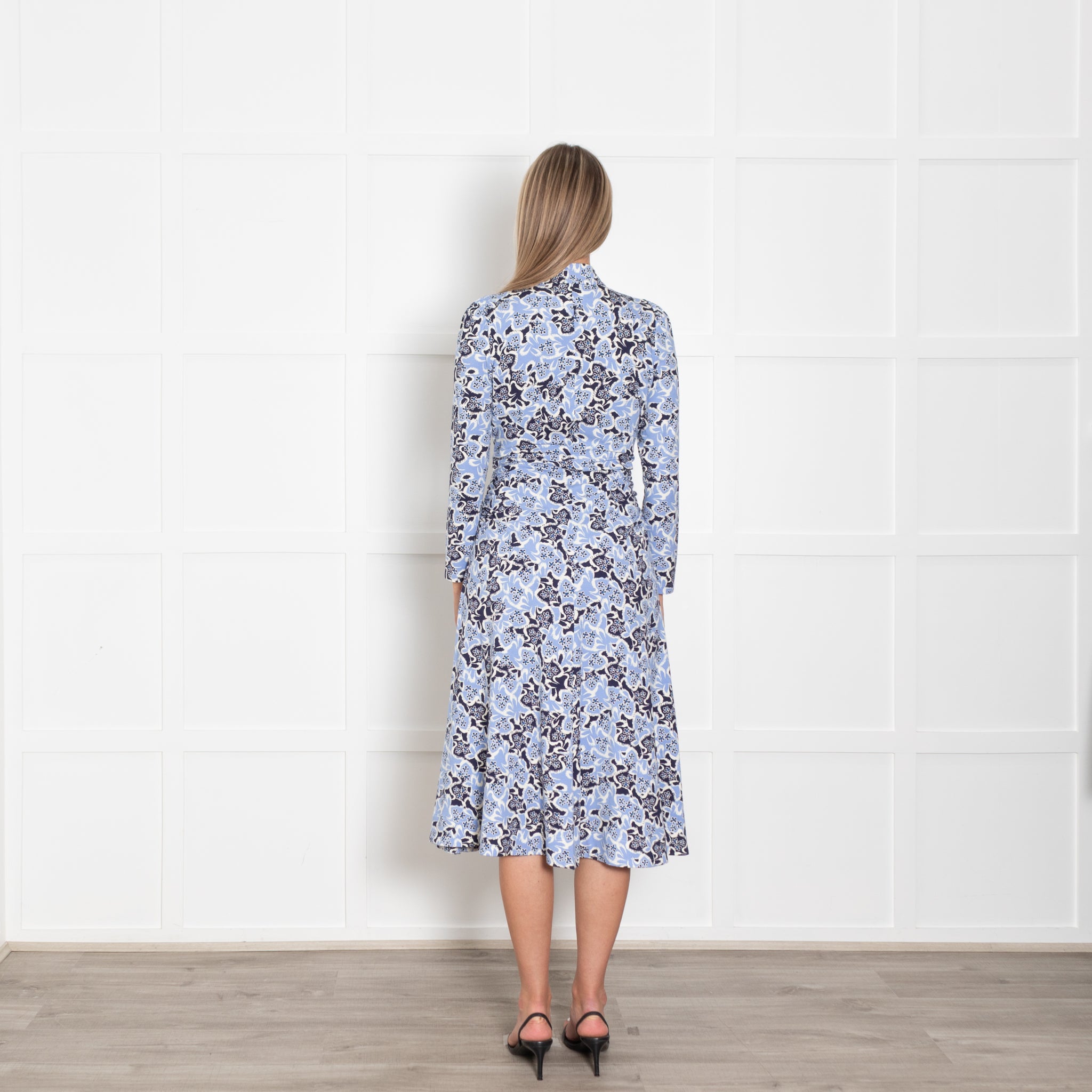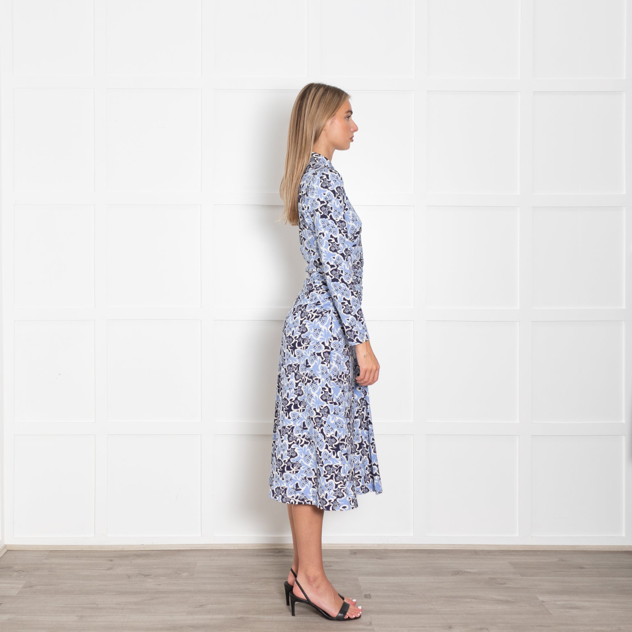 Me + Em blue florals jersey maxi dress. Lightweight soft dress with ruching around the waist and a concealed zip neckline.
