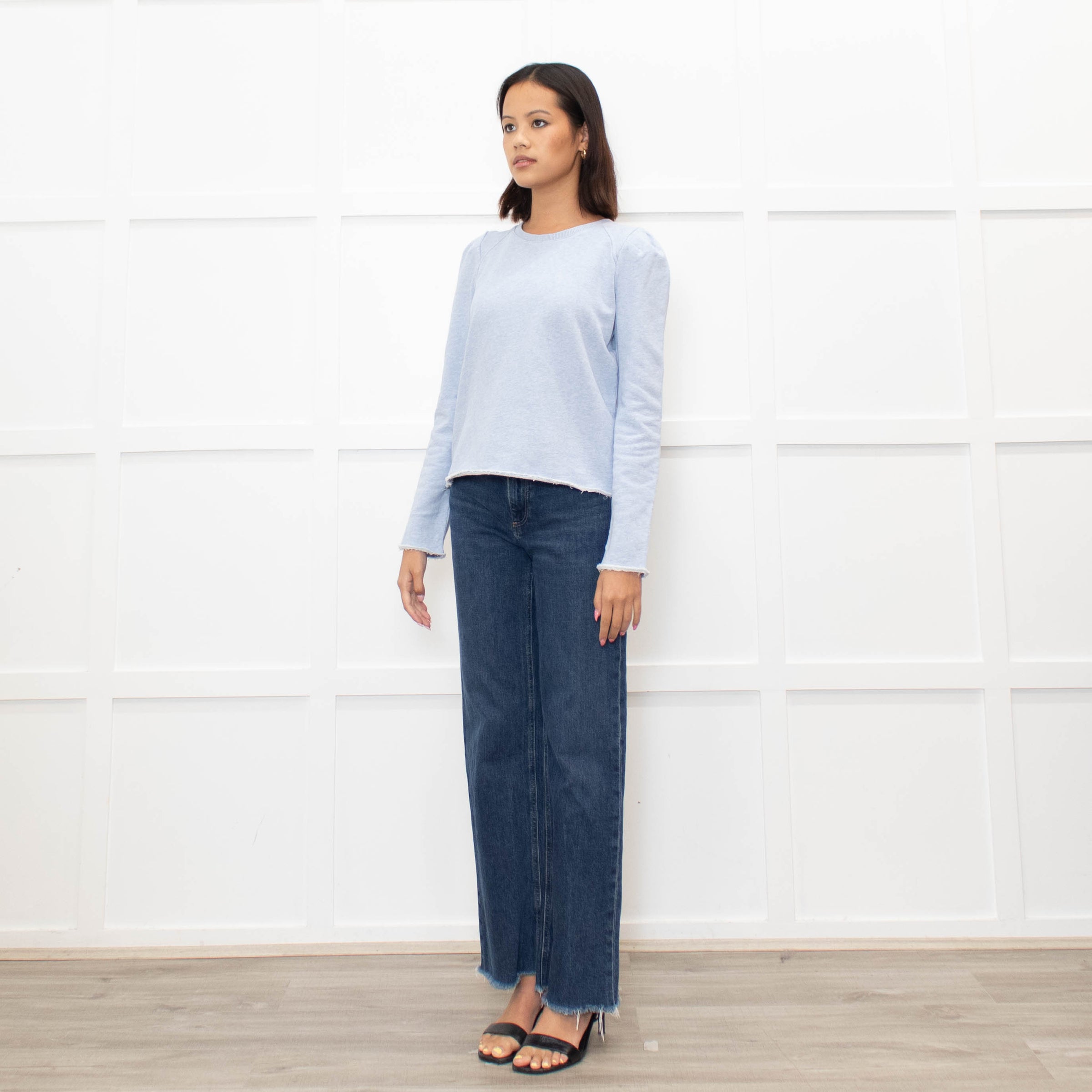 Me + Em pale blue puff shoulder cotton loopback sweatshirt with a rounded neckline, and raw hem detailing.