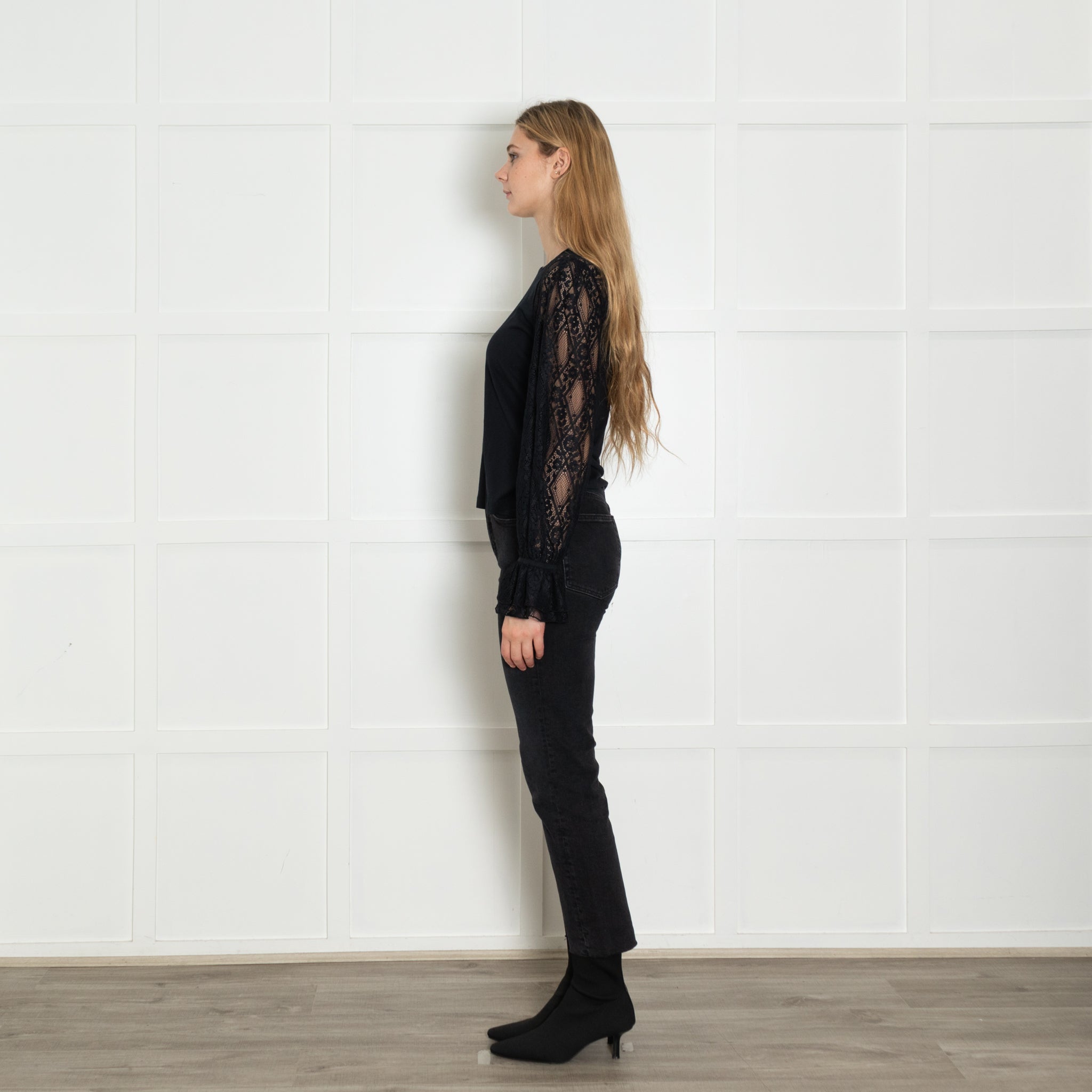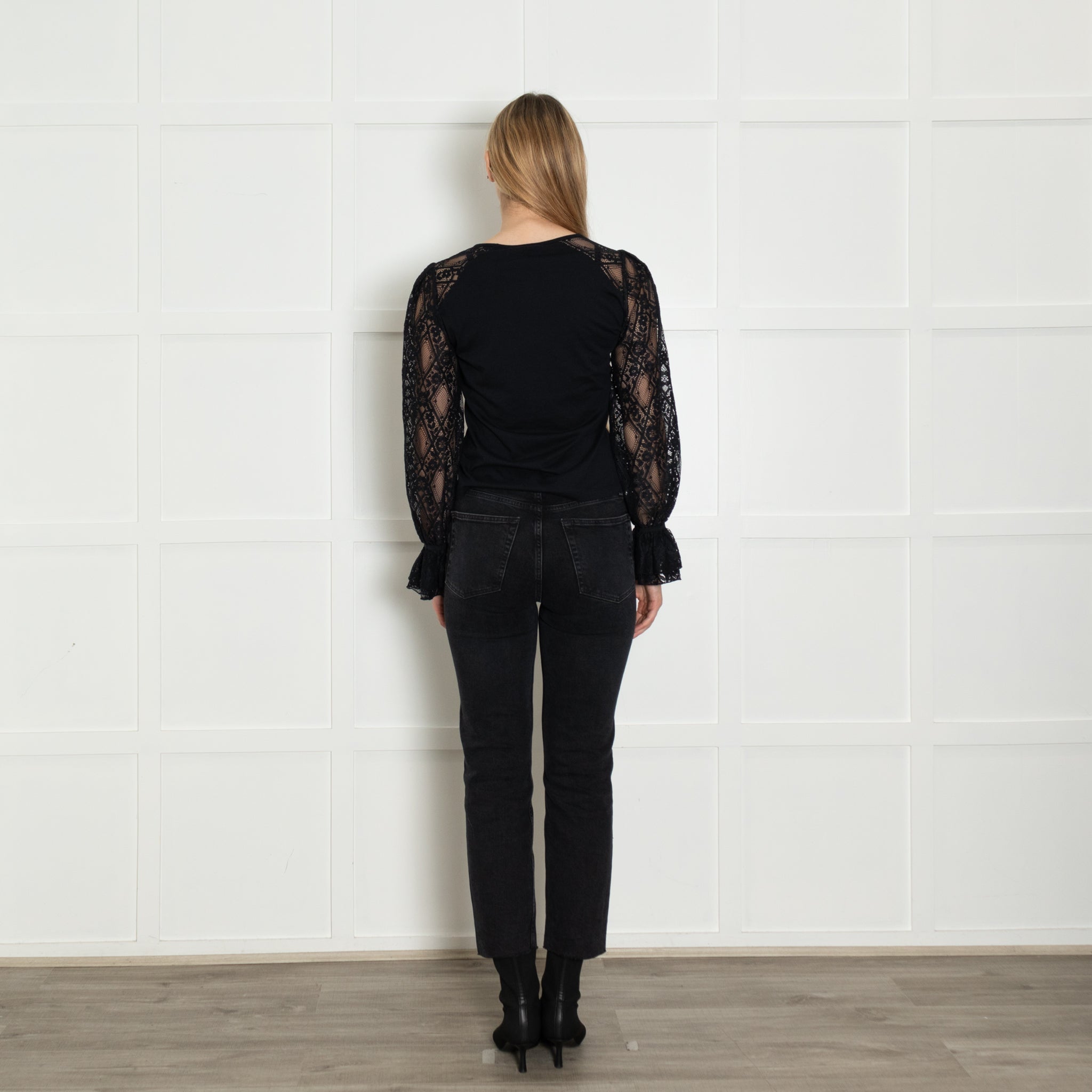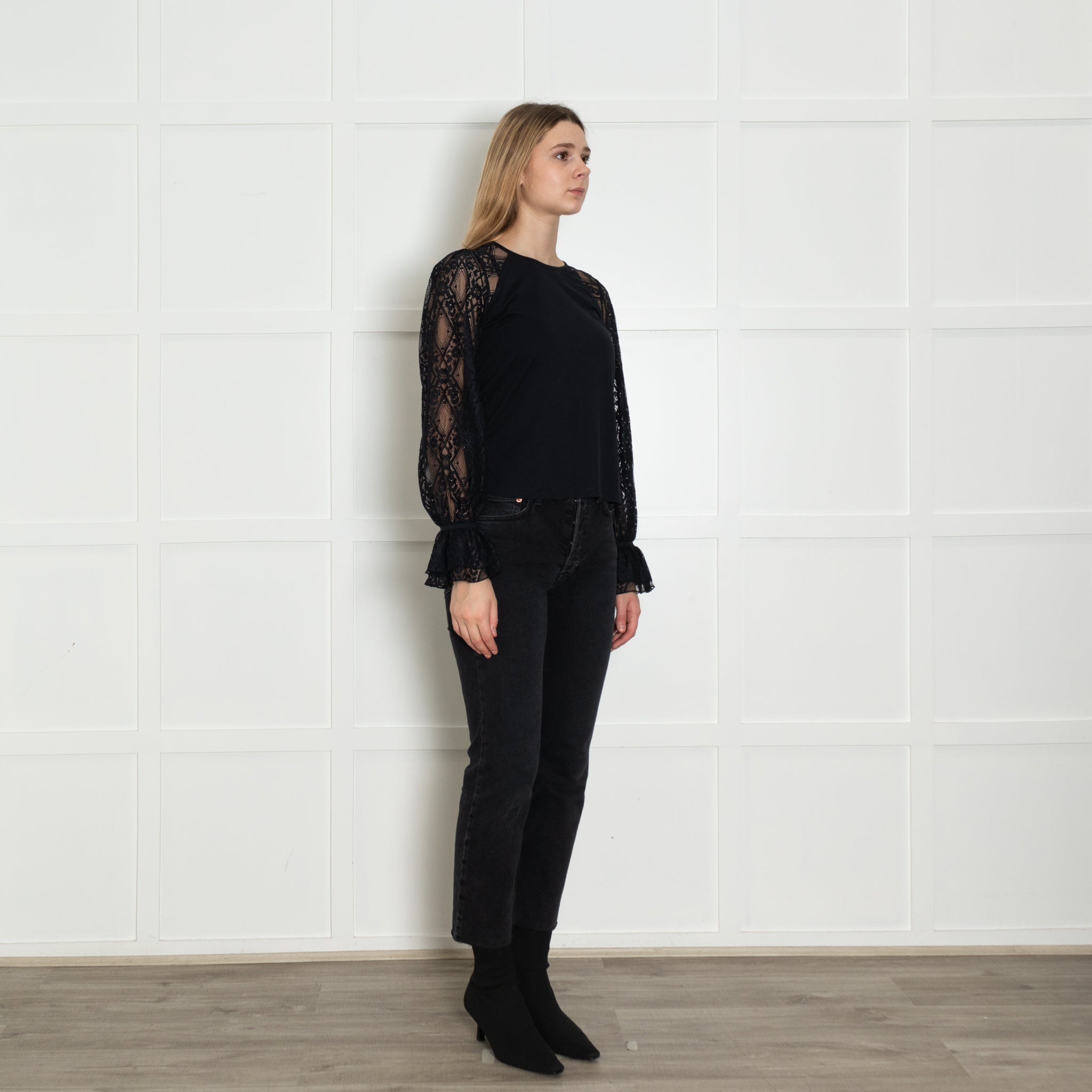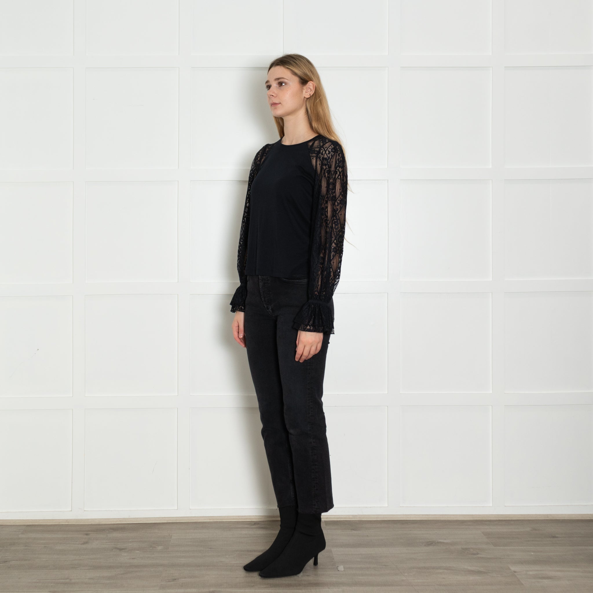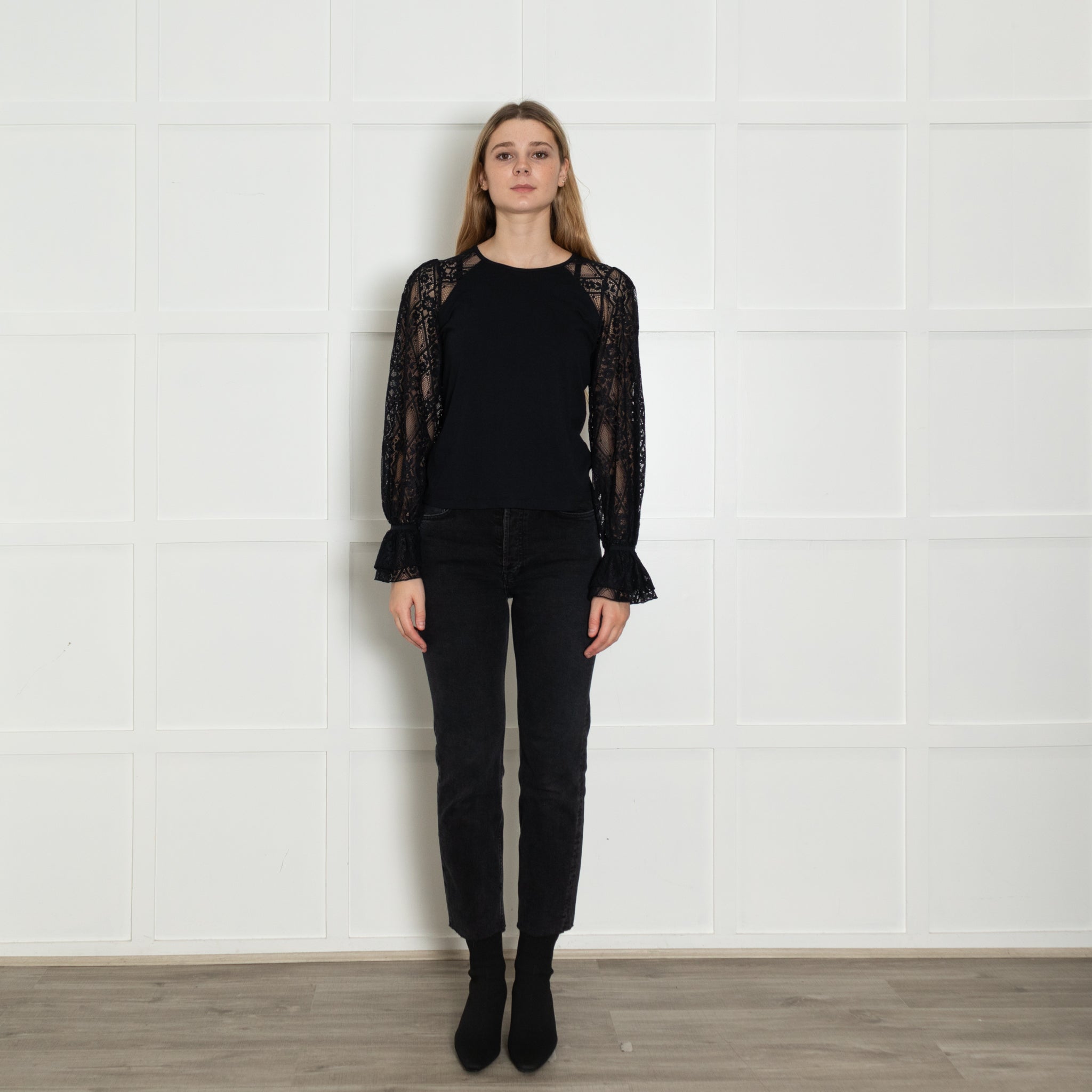 Me+Em navy blue long sleeve top, crafted with a cotton fabric, beautiful jersey blend lace patterned sleeves, with a classic rounded neckline, and stunning pitched sleeves.
