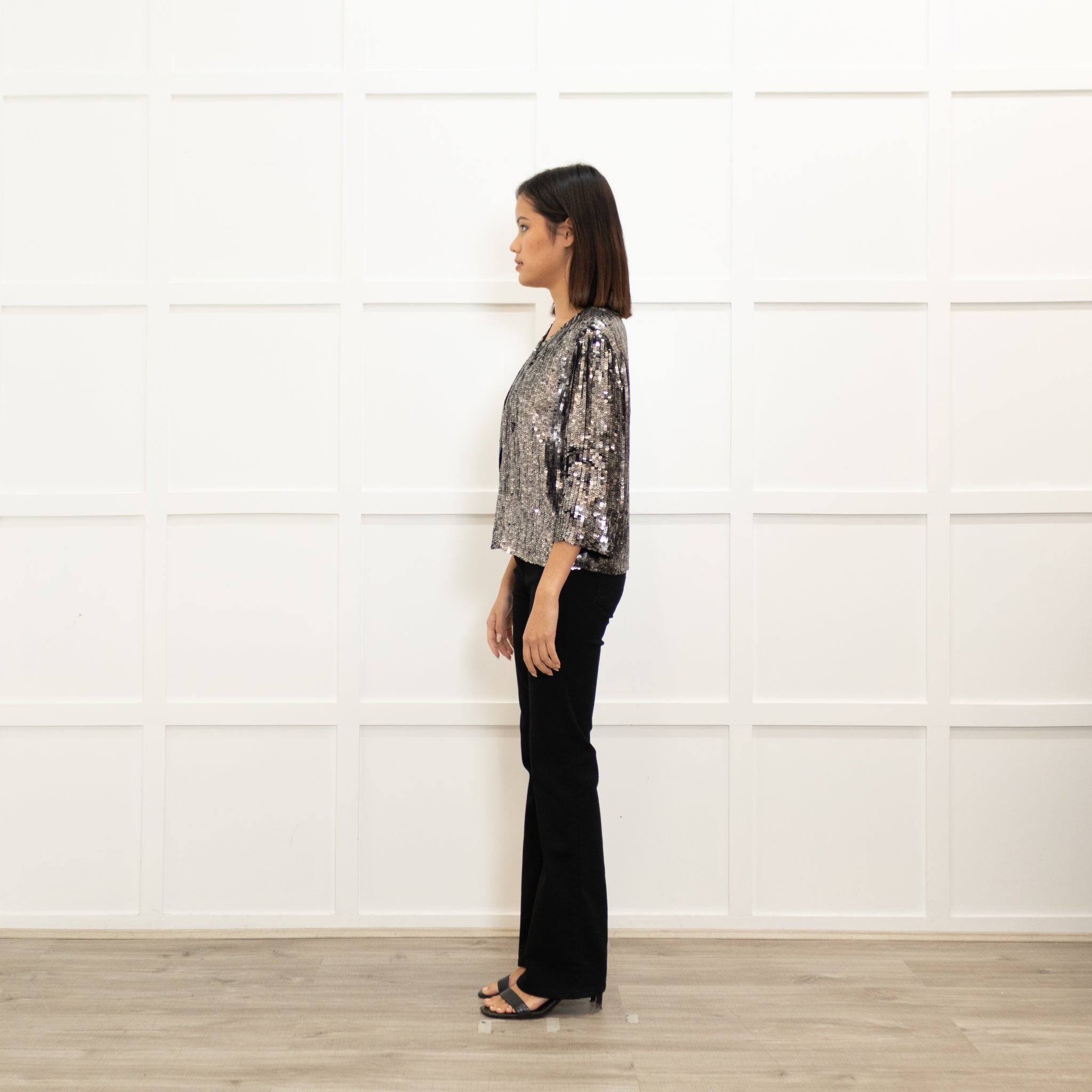 Milly 3/4 jacket, featuring a stunning silver sequin fabric design and black interior lining.