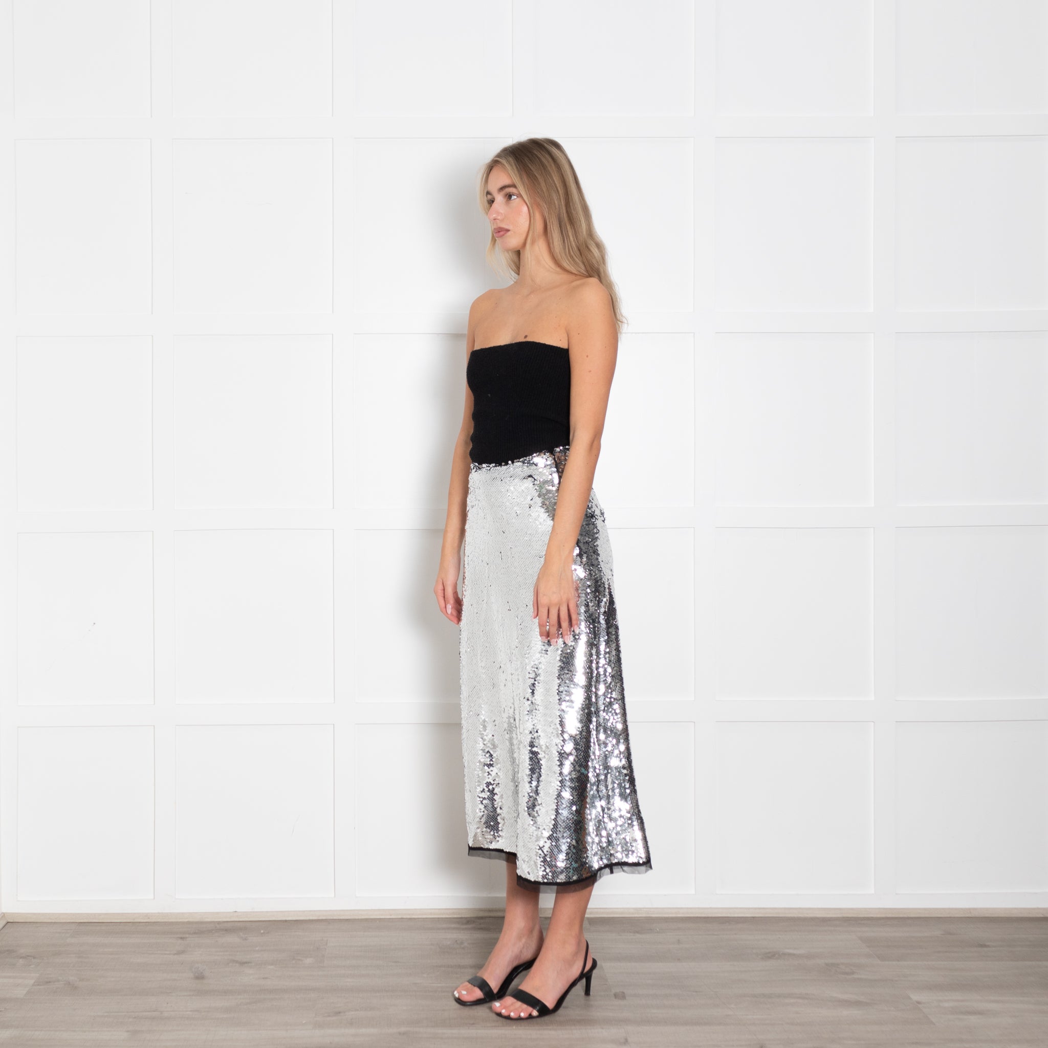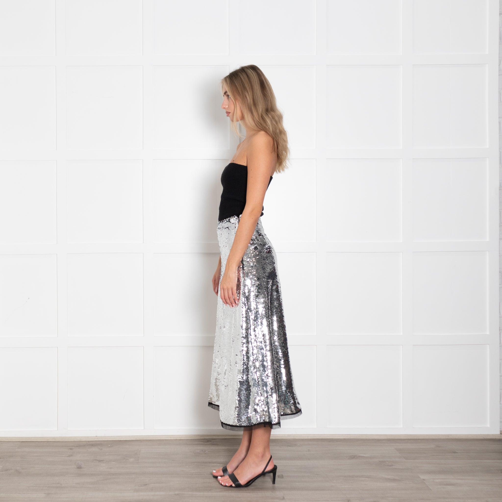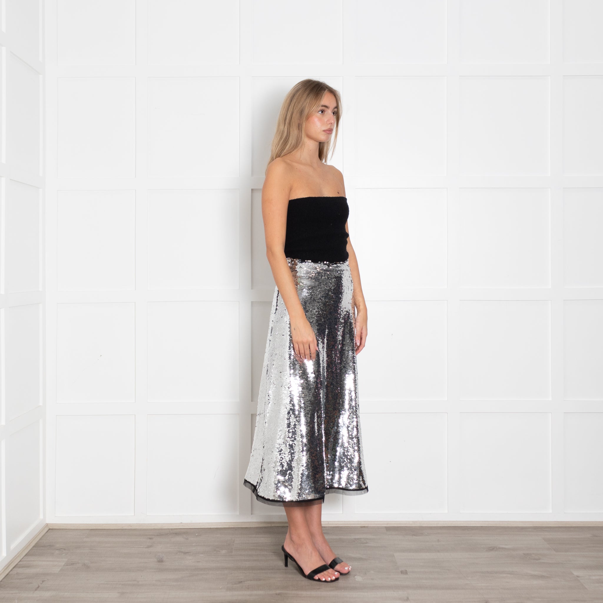 Molly Goddard silver sequin A line midi skirt with side zip closure and sheer panel on hem.