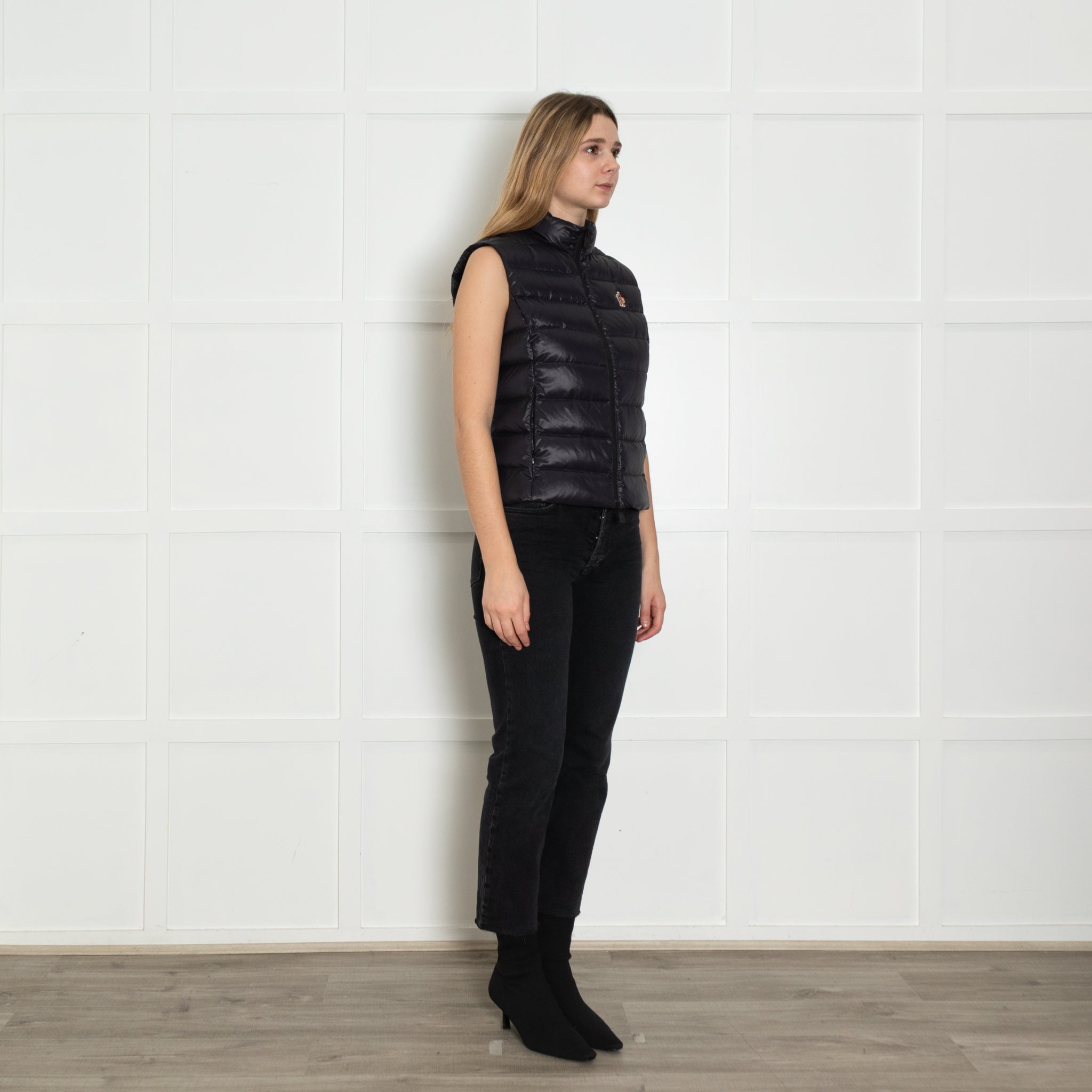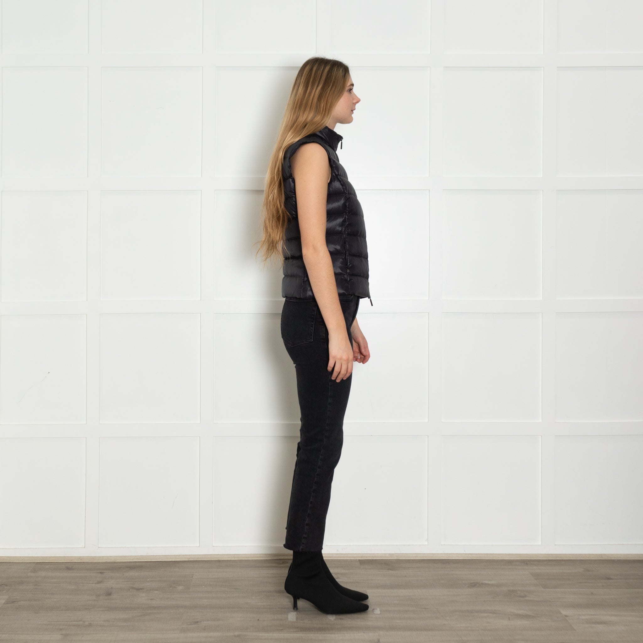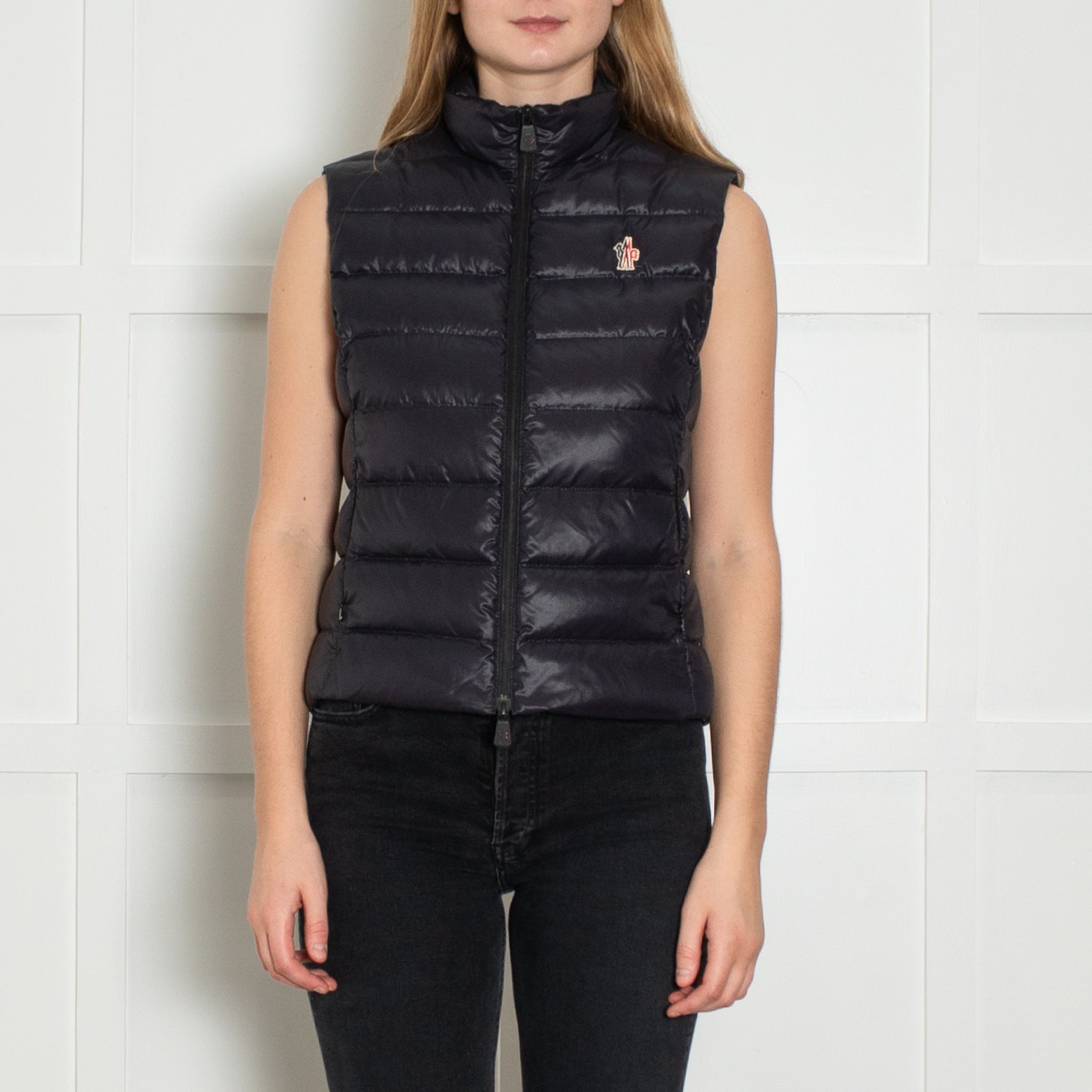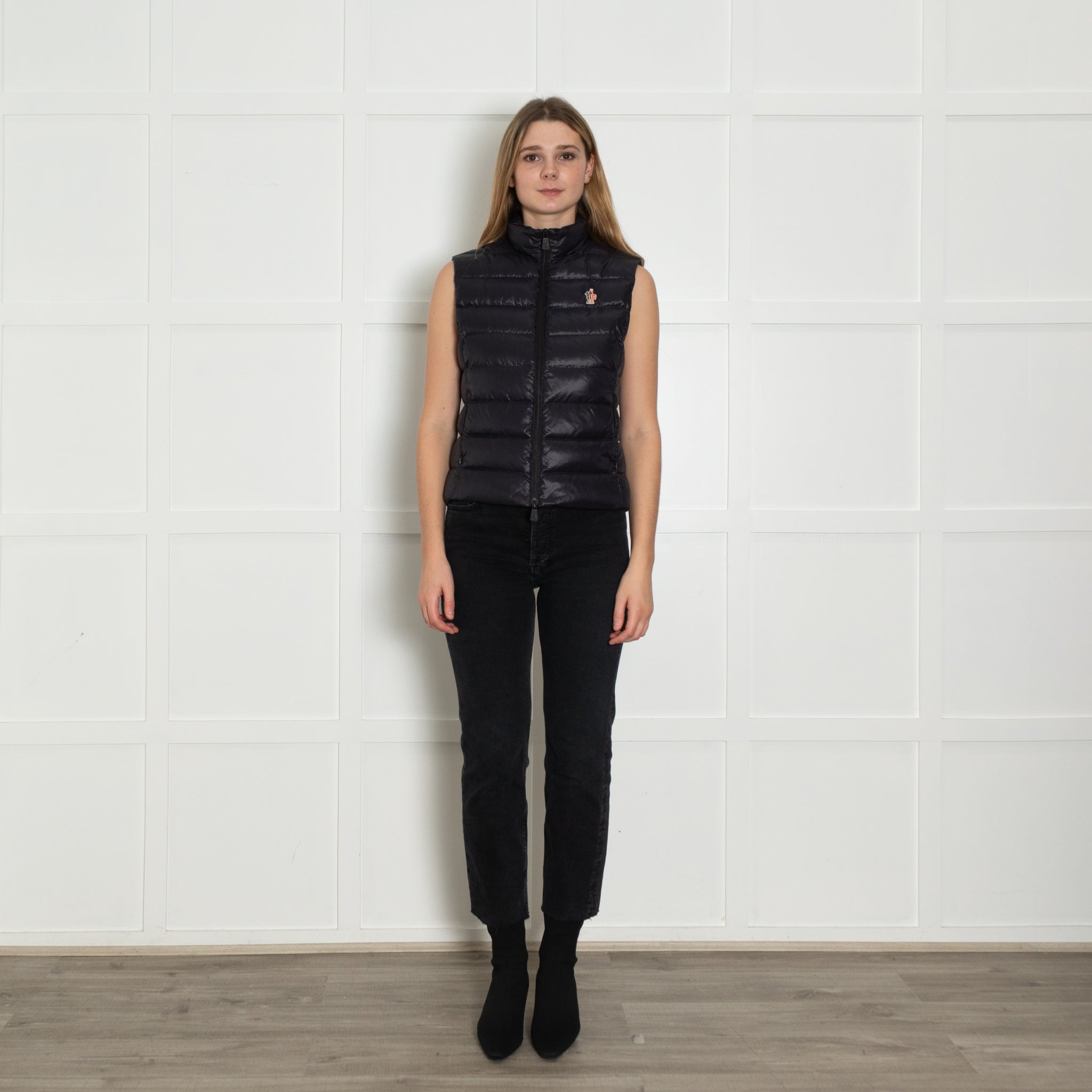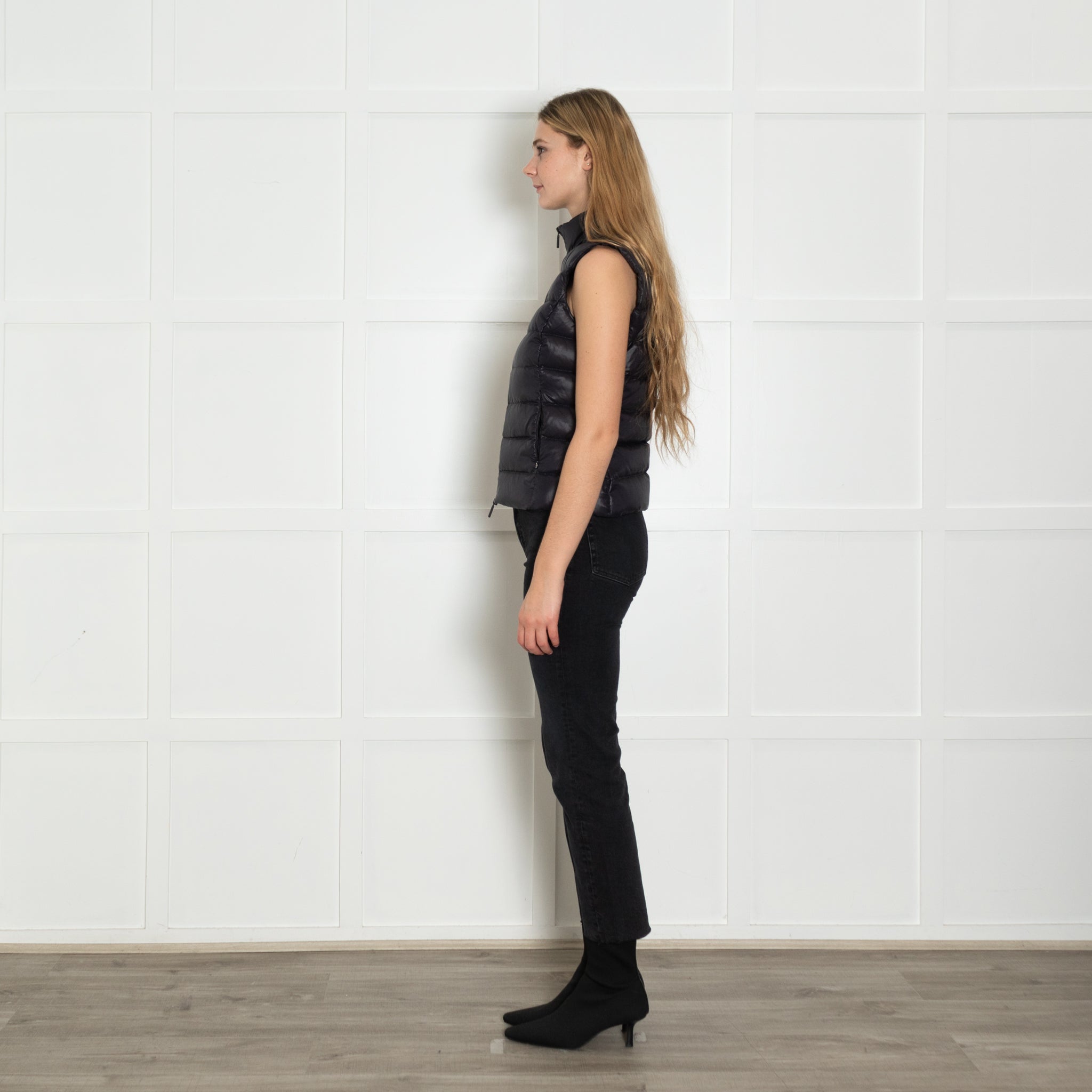 Moncler navy blue sleeveless gilet coat, featuring an elegant quilted exterior design, with two front pockets, and a zipped-up front closure.