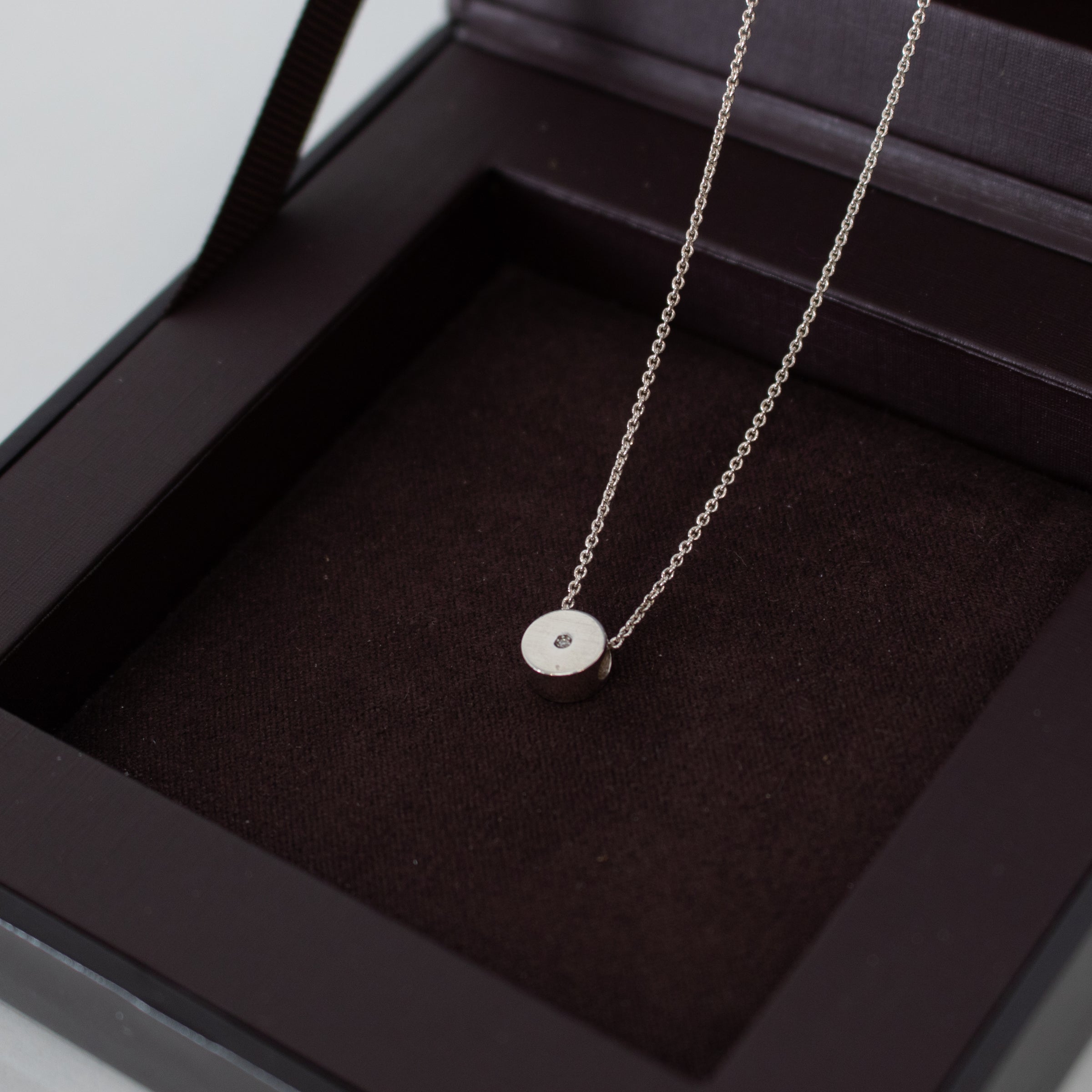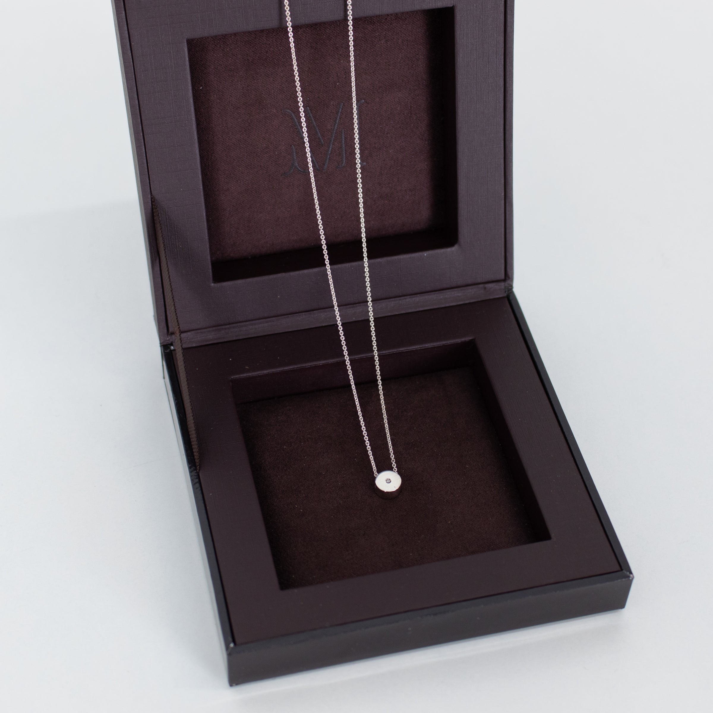 Monica Vinader silver necklace with a small round diamond set pendant. On an adjustable chain.