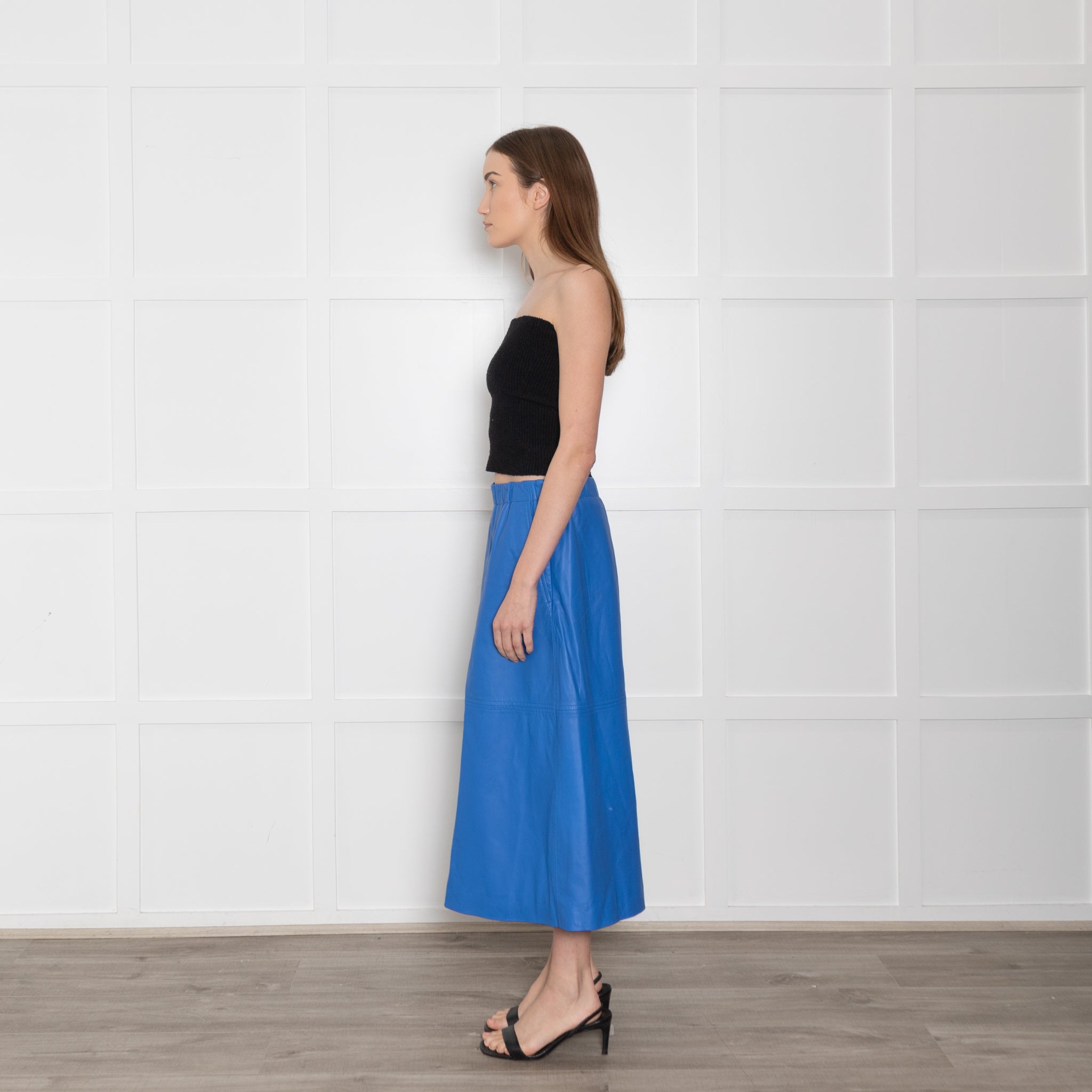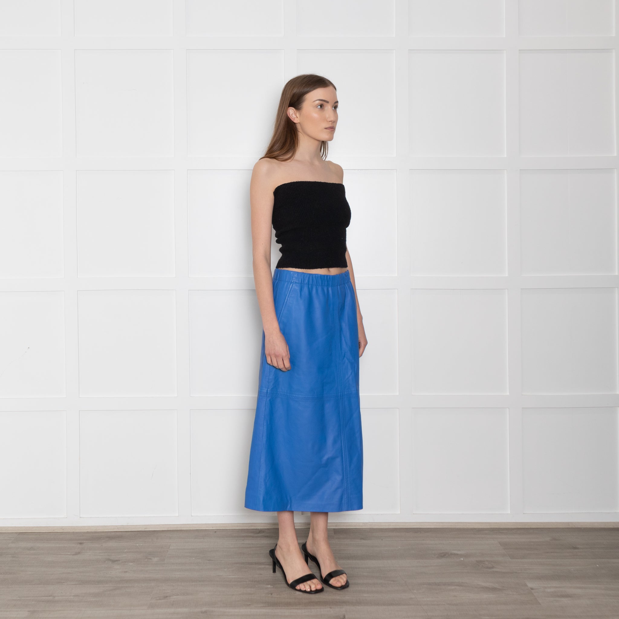 Munthe Cobalt blue midi skirt, featuring a stunning blue lamb leather interior, two front pockets, and a side zip-up compartment.
