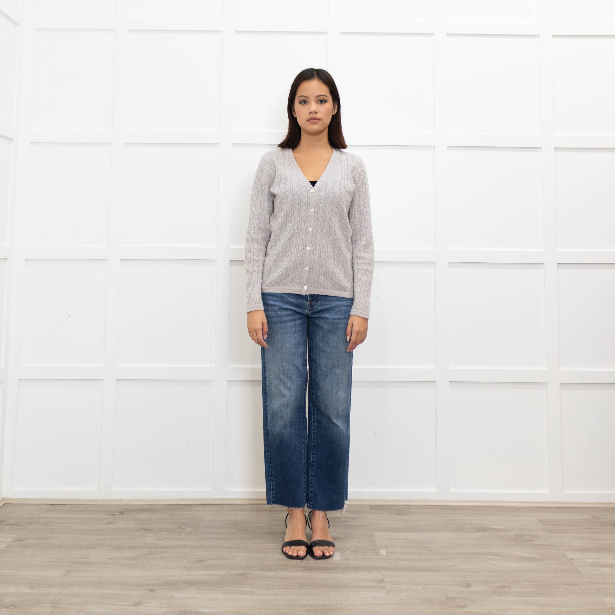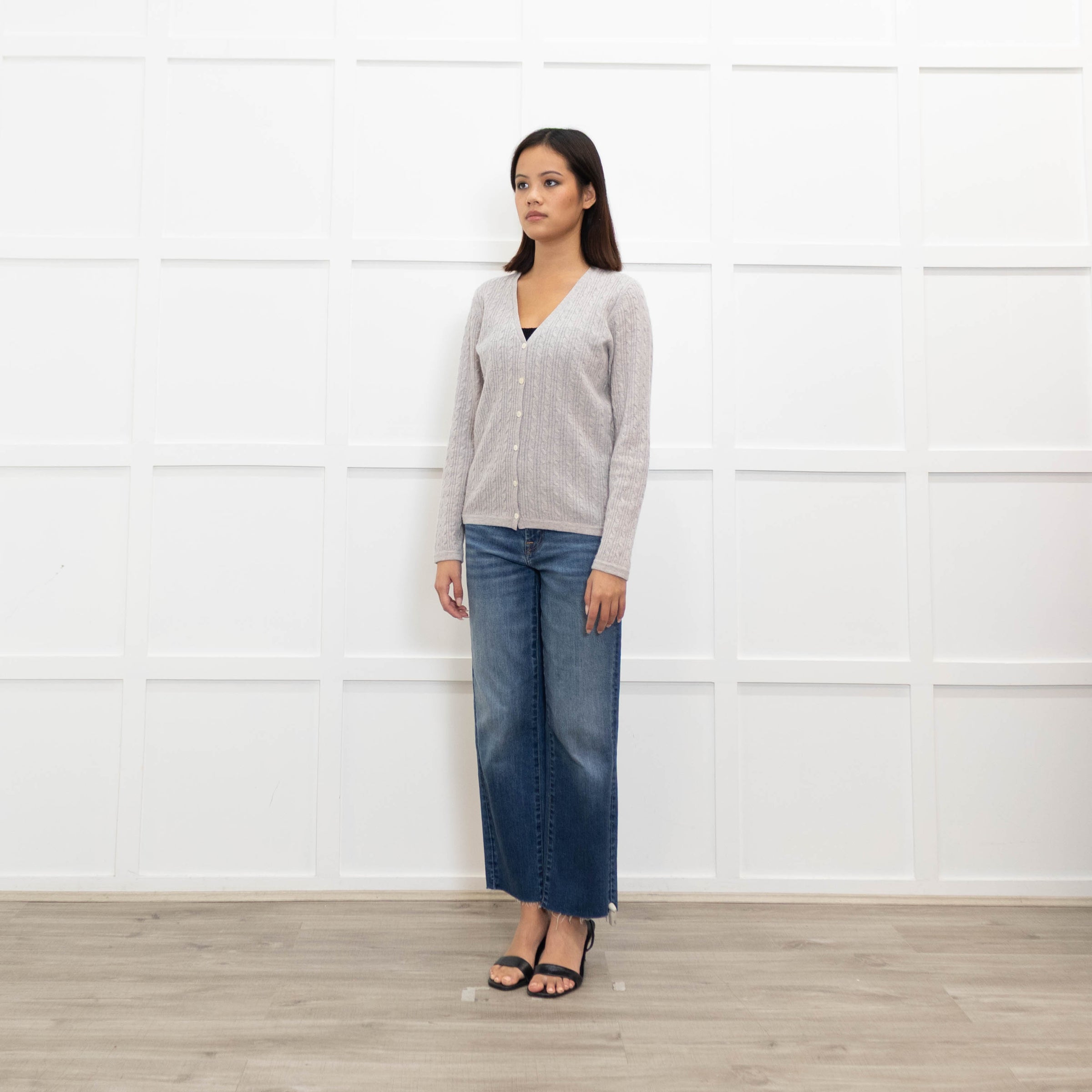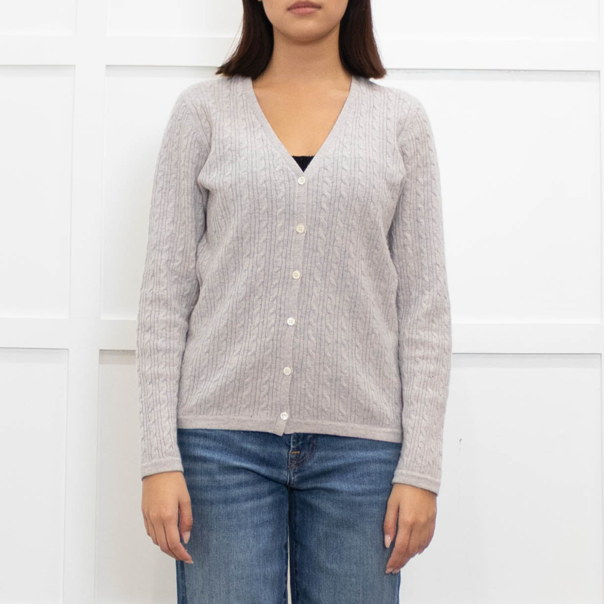 N. Peal stunning grey cashmere cardigan, featuring a gorgeous cable knitted design, a button-up front closure, and a V-neckline, for an elegant, yet casual style.