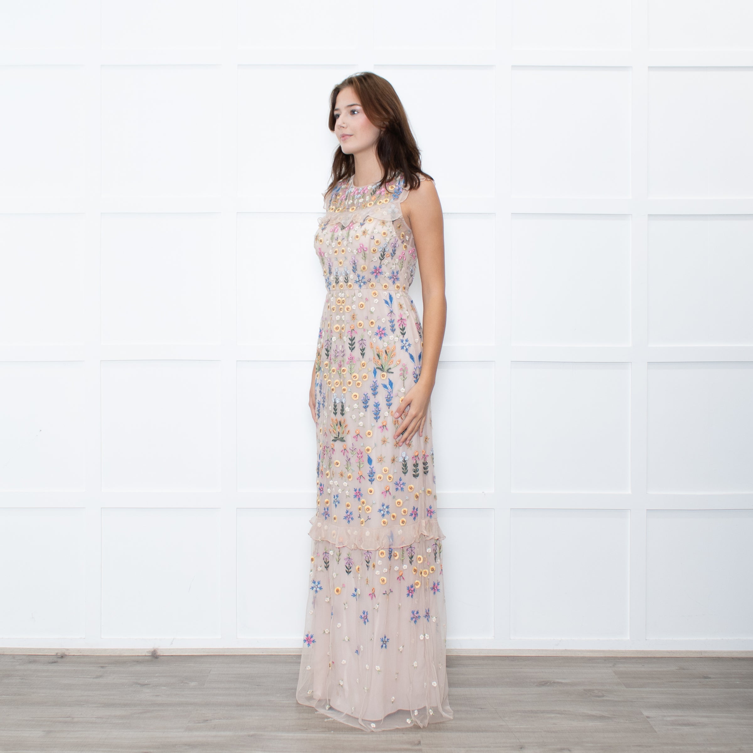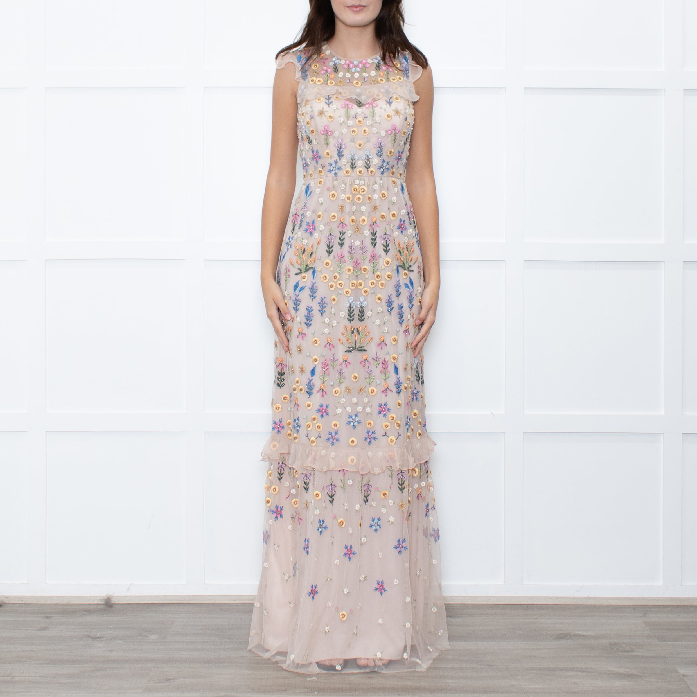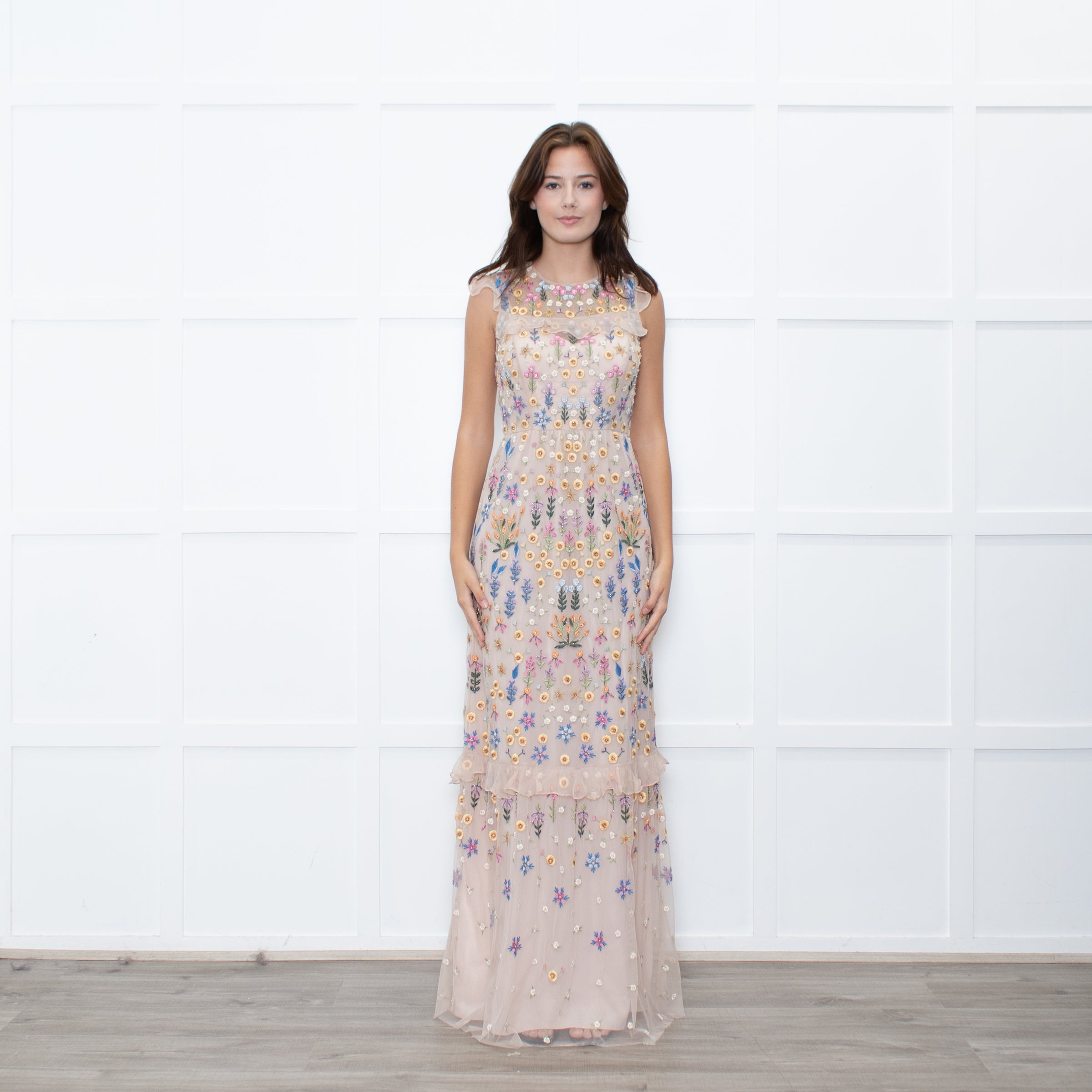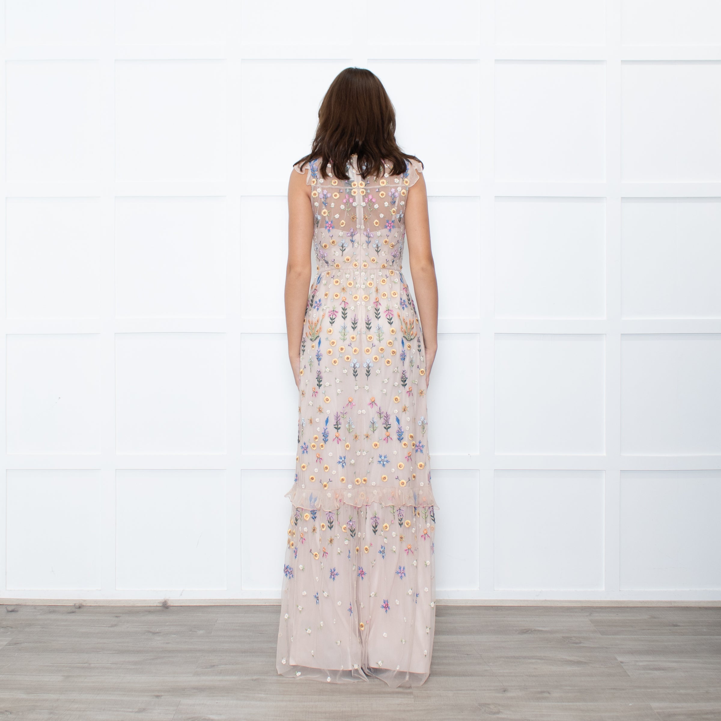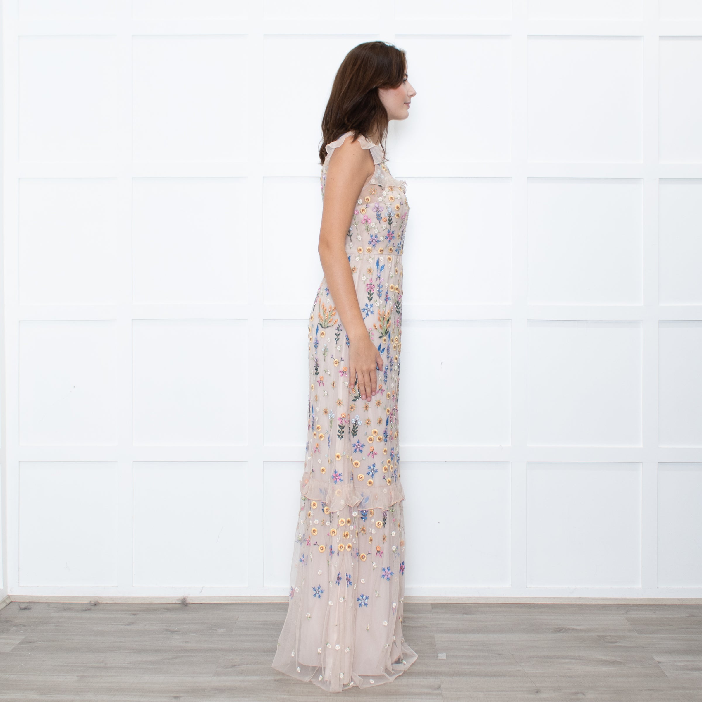 Needle & Thread powder pink mesh net maxi dress with multicoloured floral embroidery all over. Featuring frilled detailing, a two-tiered skirt, and a matching slip dress. New with tags.