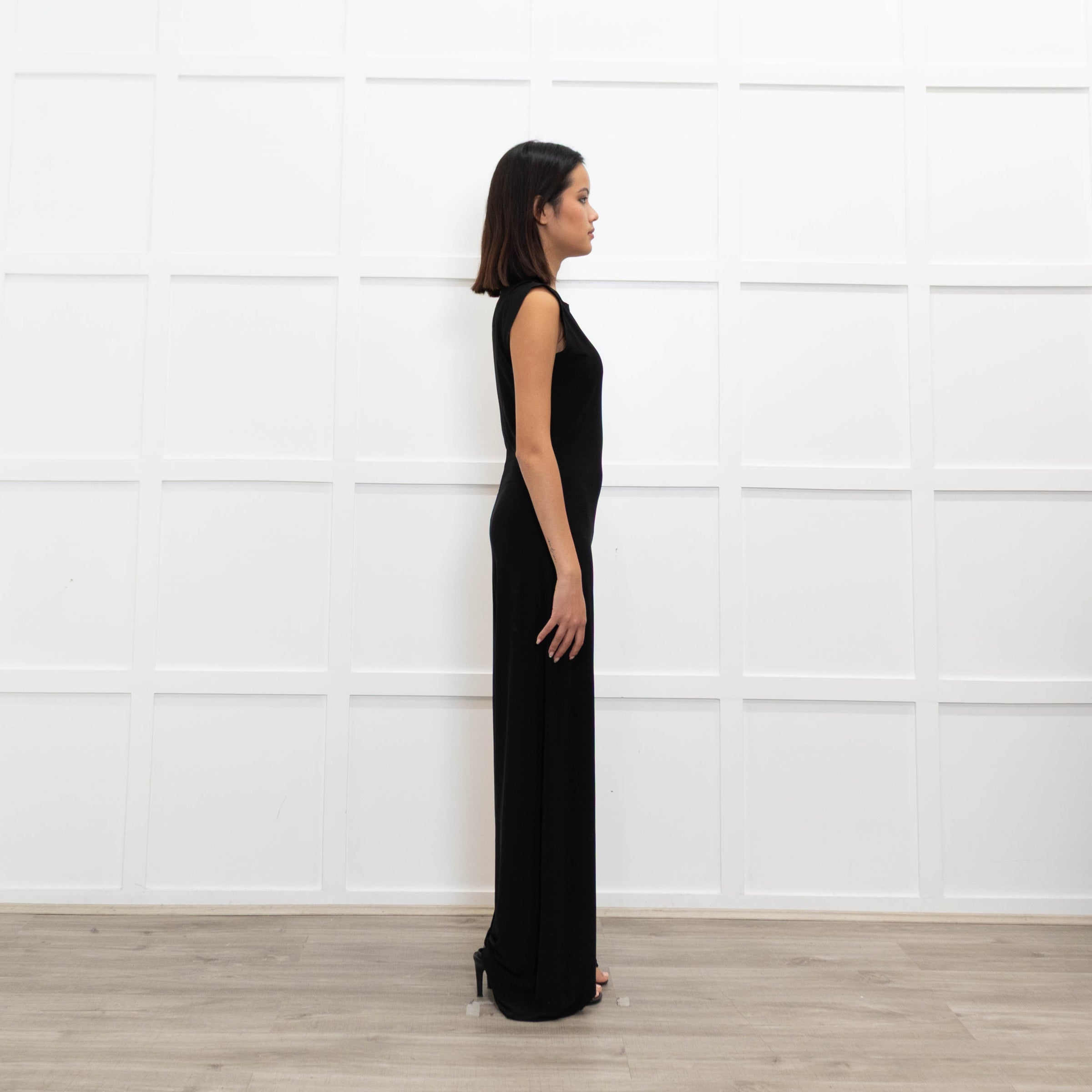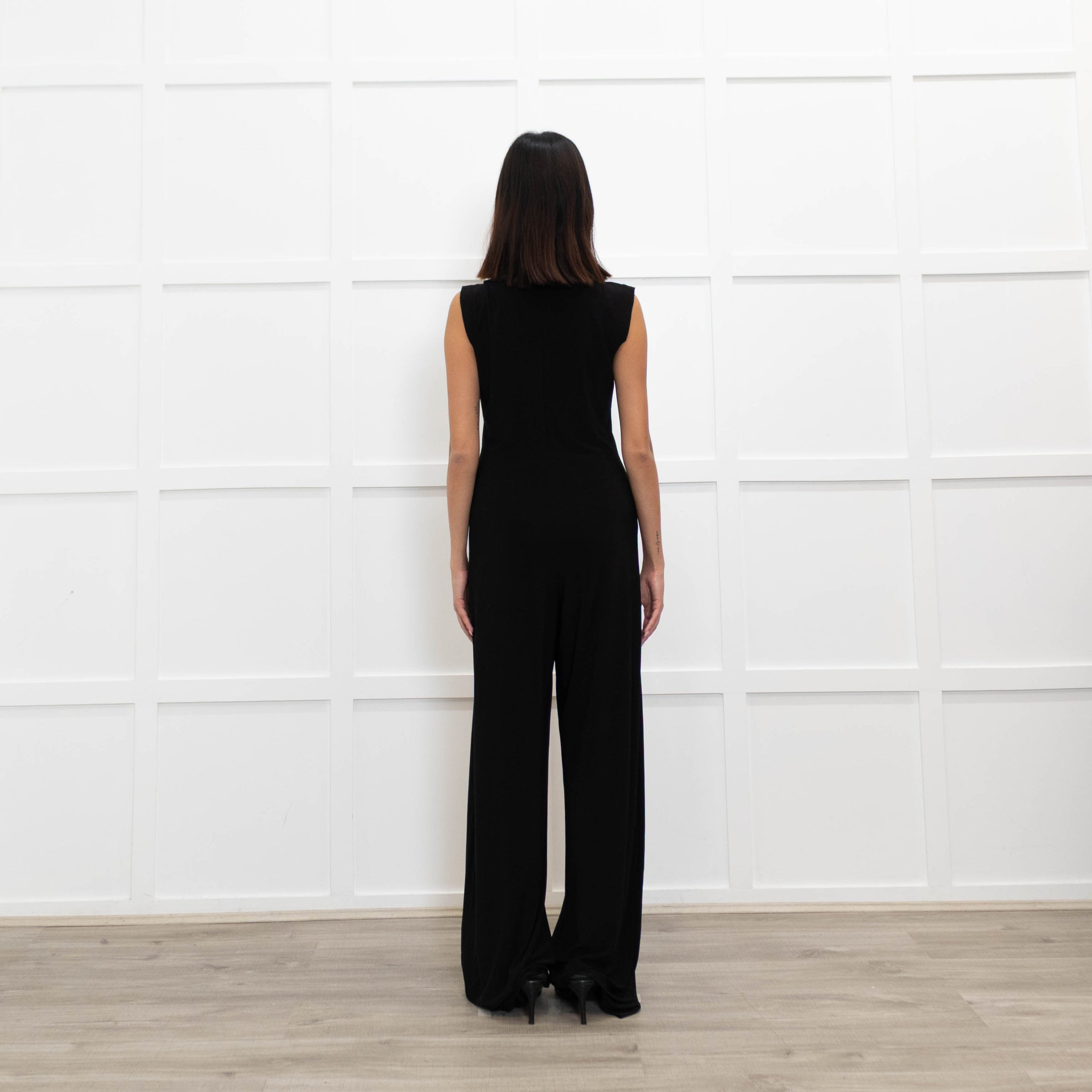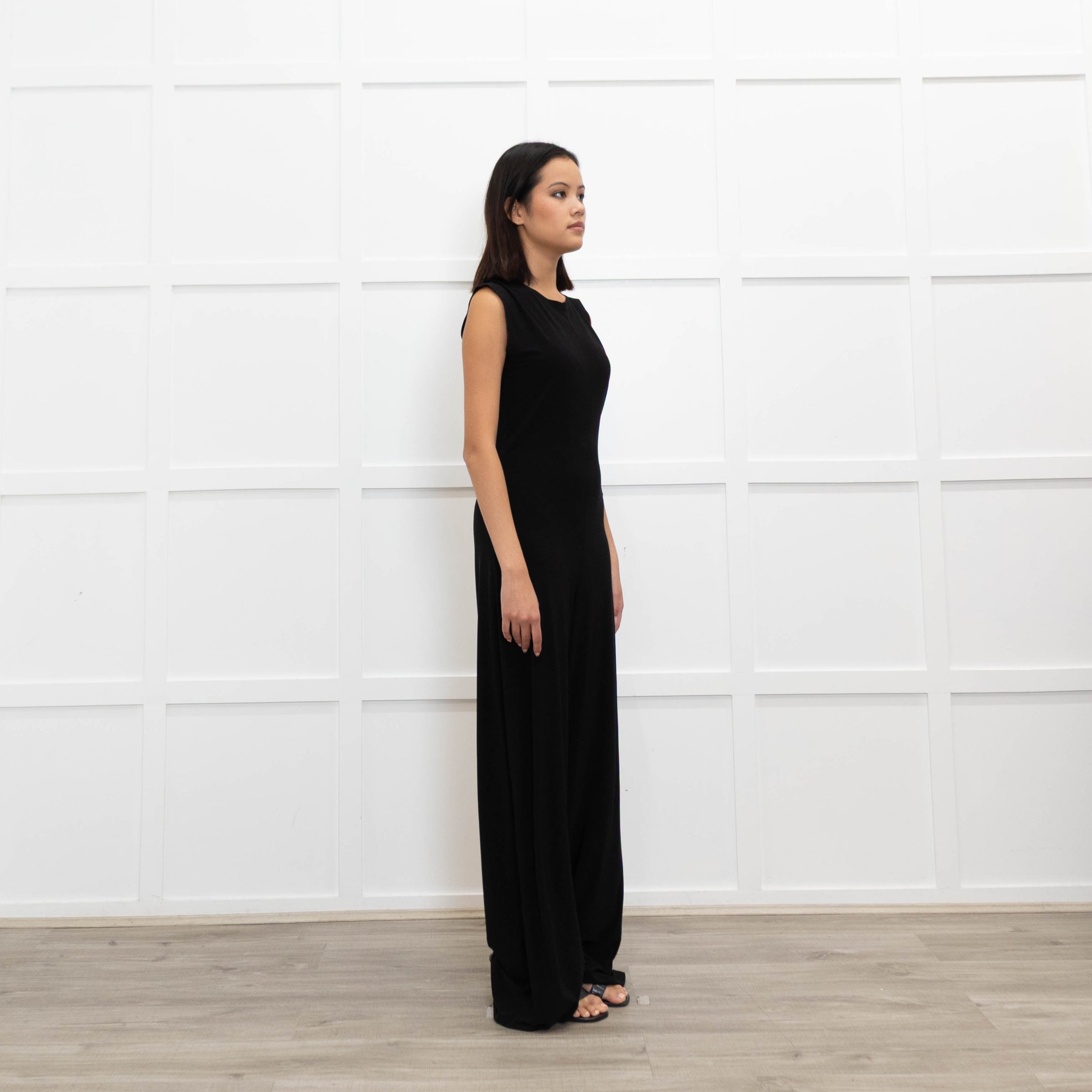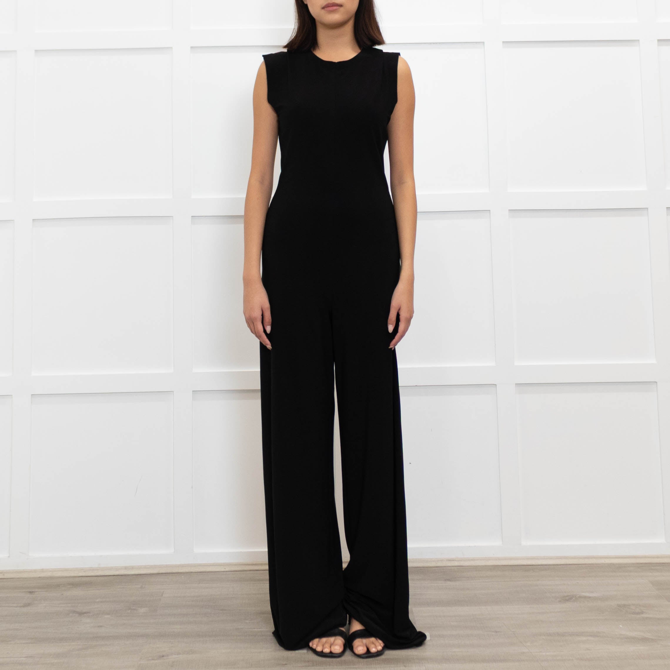 Norma Kamali black wide-leg jumpsuit with raw edges and a rounded neckline.