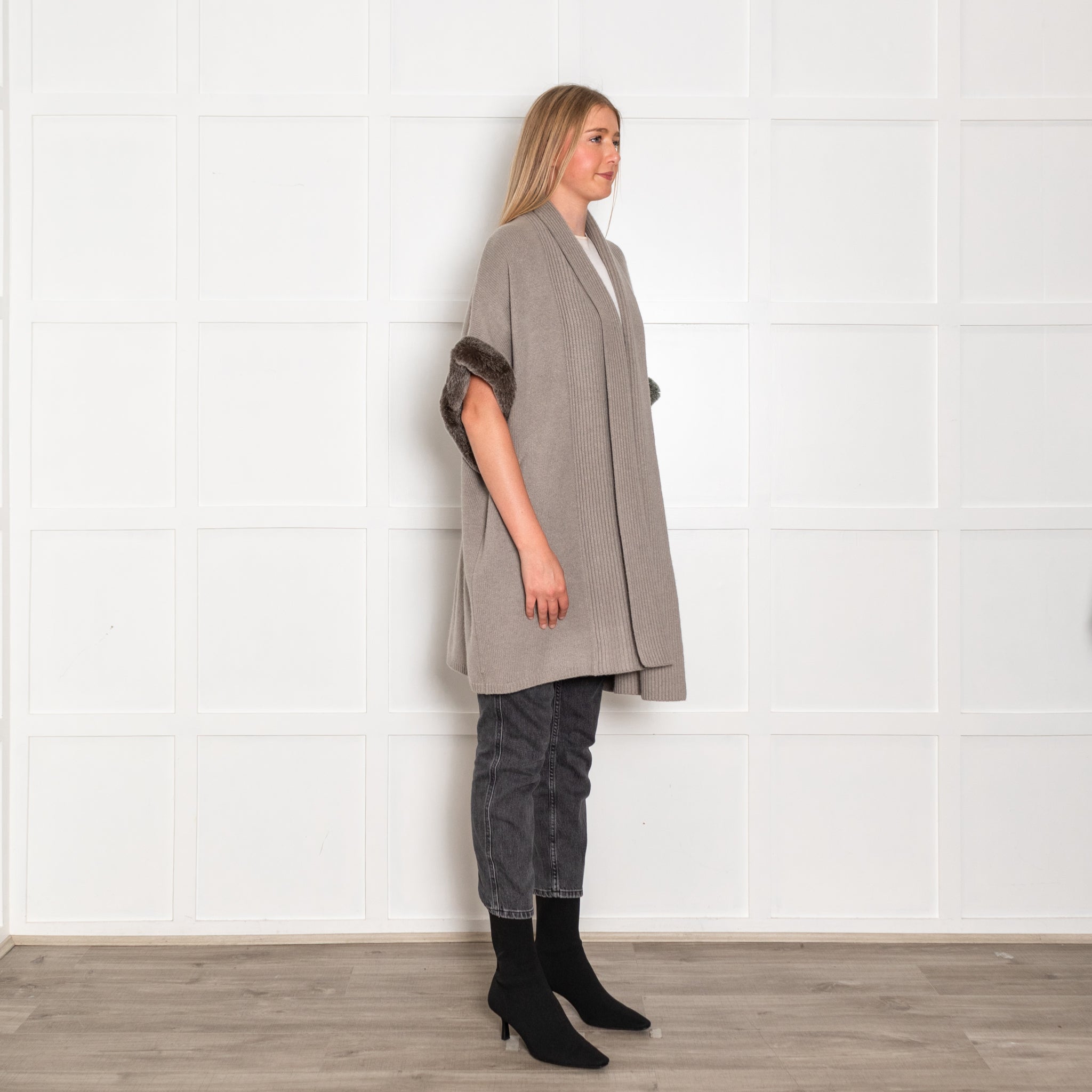 N.Peal elegant long taupe grey cashmere cardigan, featuring a sleeveless design, with rabbit fur trim and a gorgeous ribbed front.
