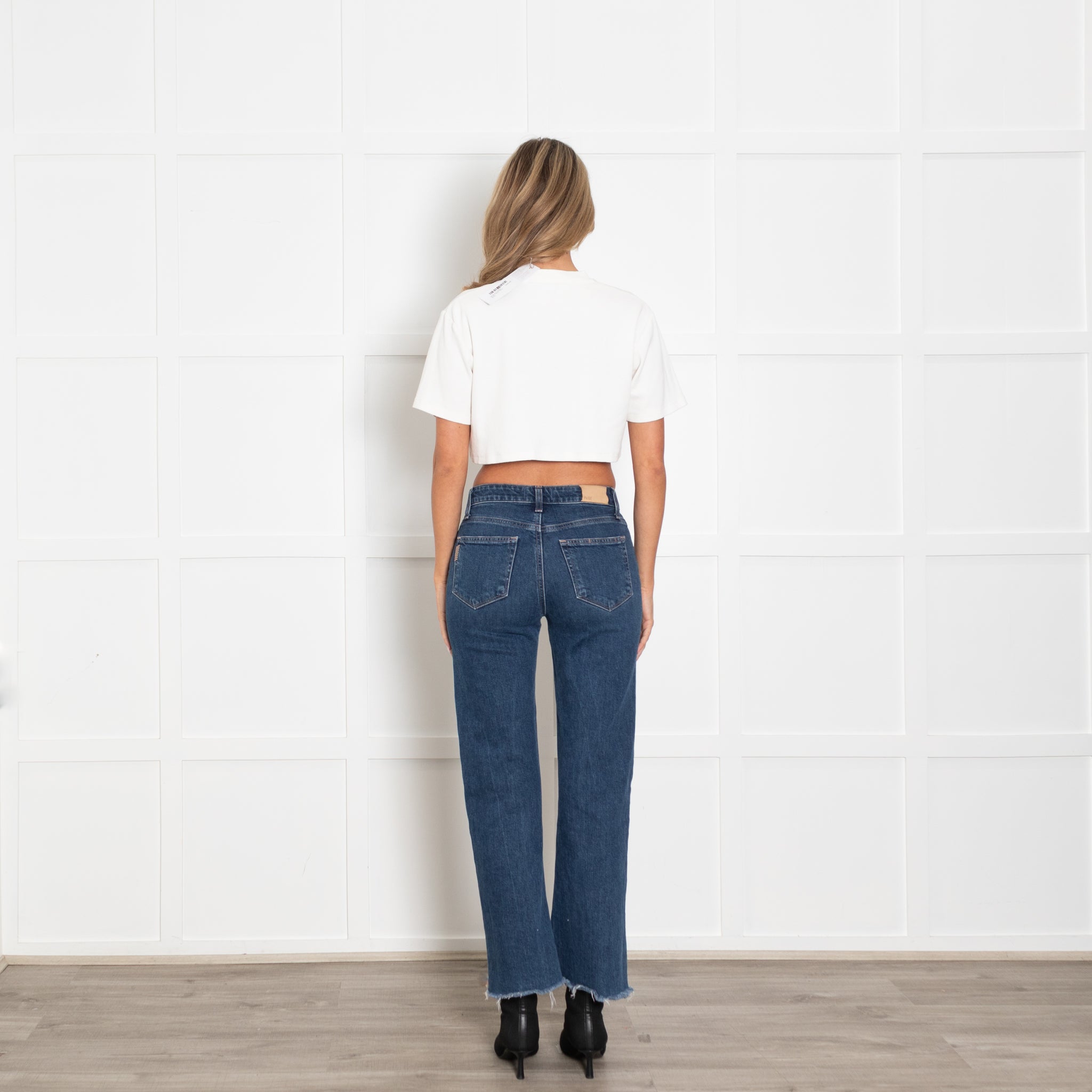 Off White short-sleeve T-shirt, crafted with a soft cotton fabric, featuring a cropped deisgn, a rounded neckline, and the iconic 'OFF' text on the front center of the T-shirt, for a minimal, stylish look.