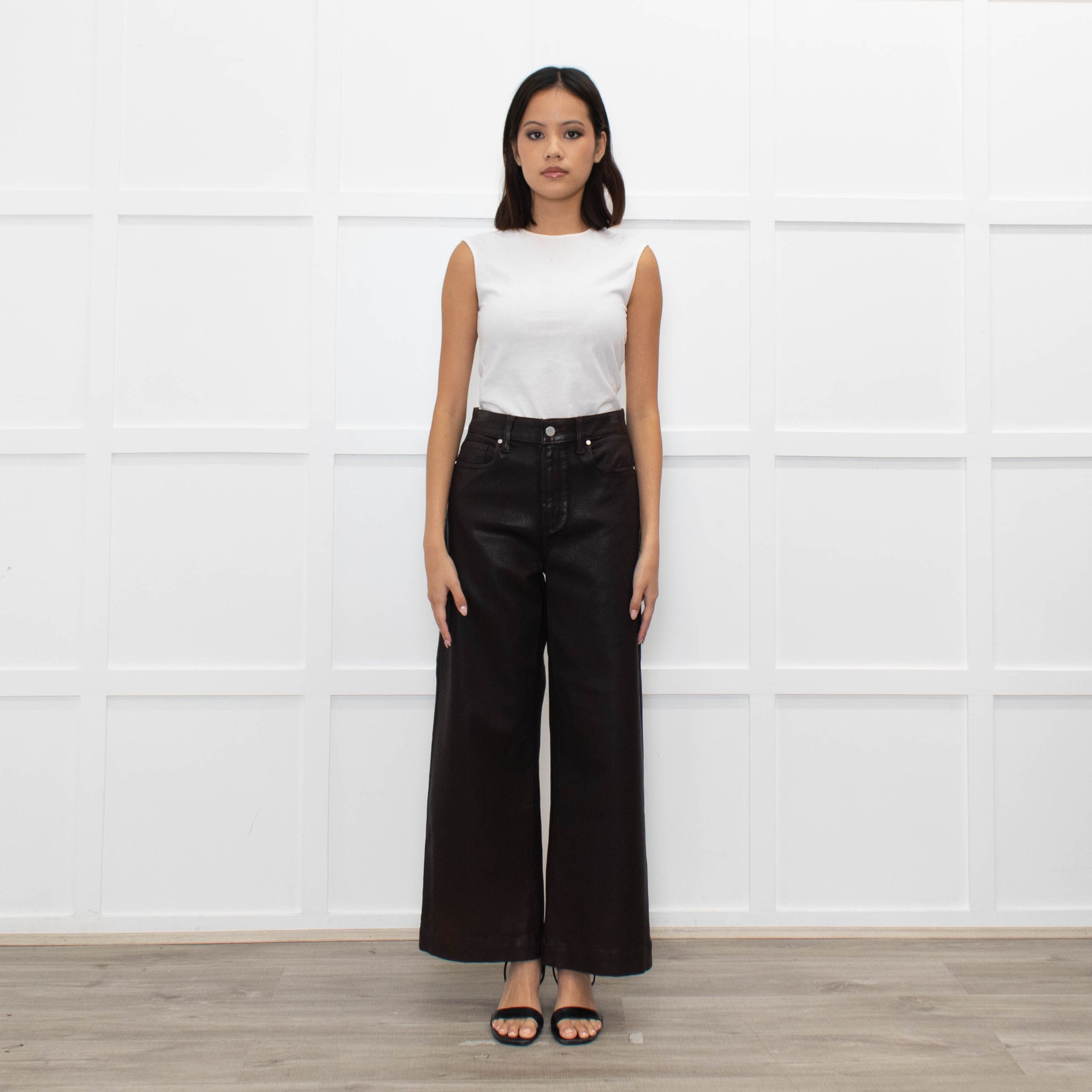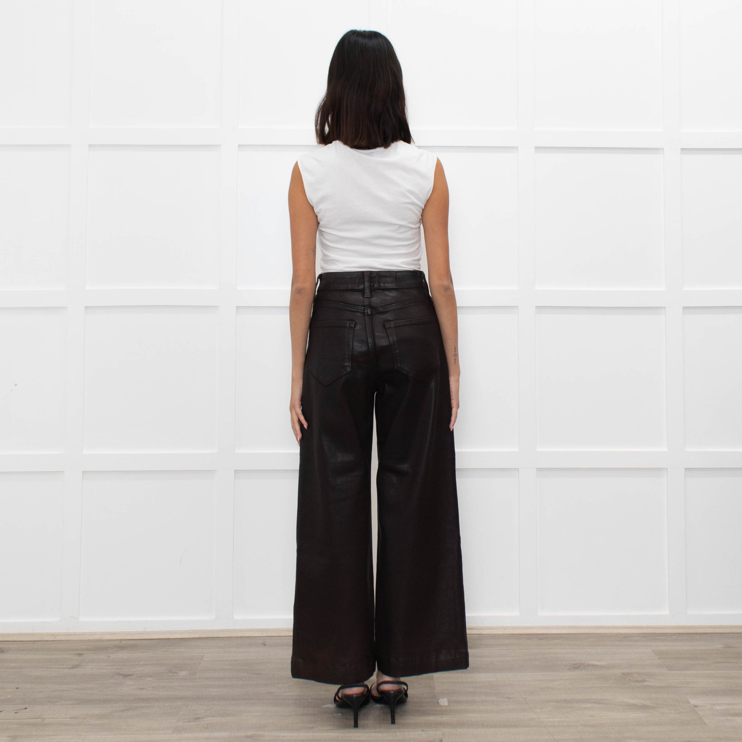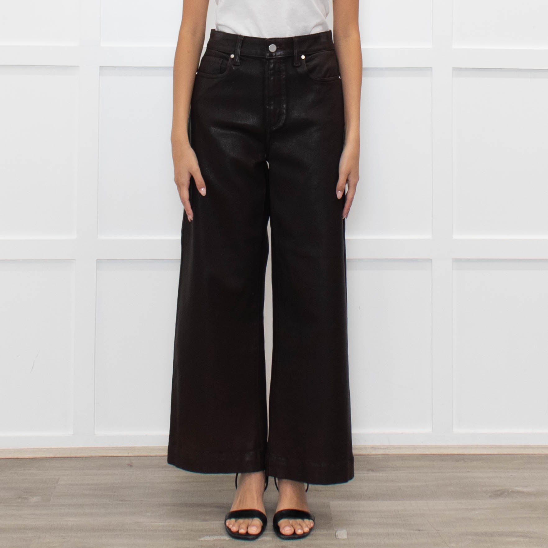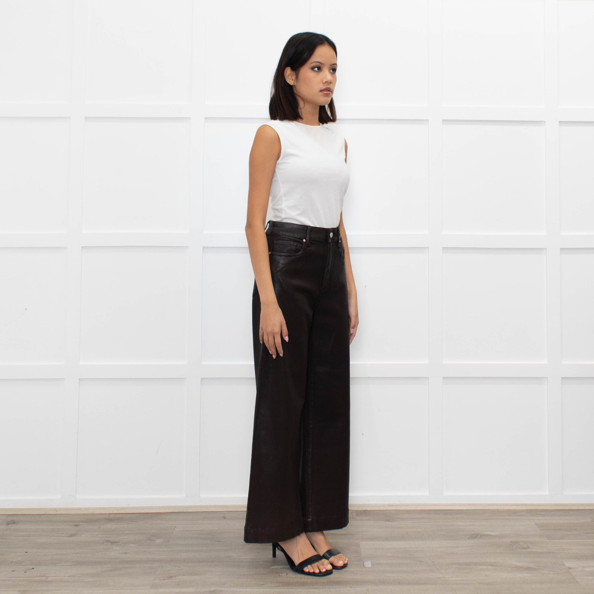 Paige Anessa brown faux leather flared trousers with front zip and button flies, belt loops, and five pockets.