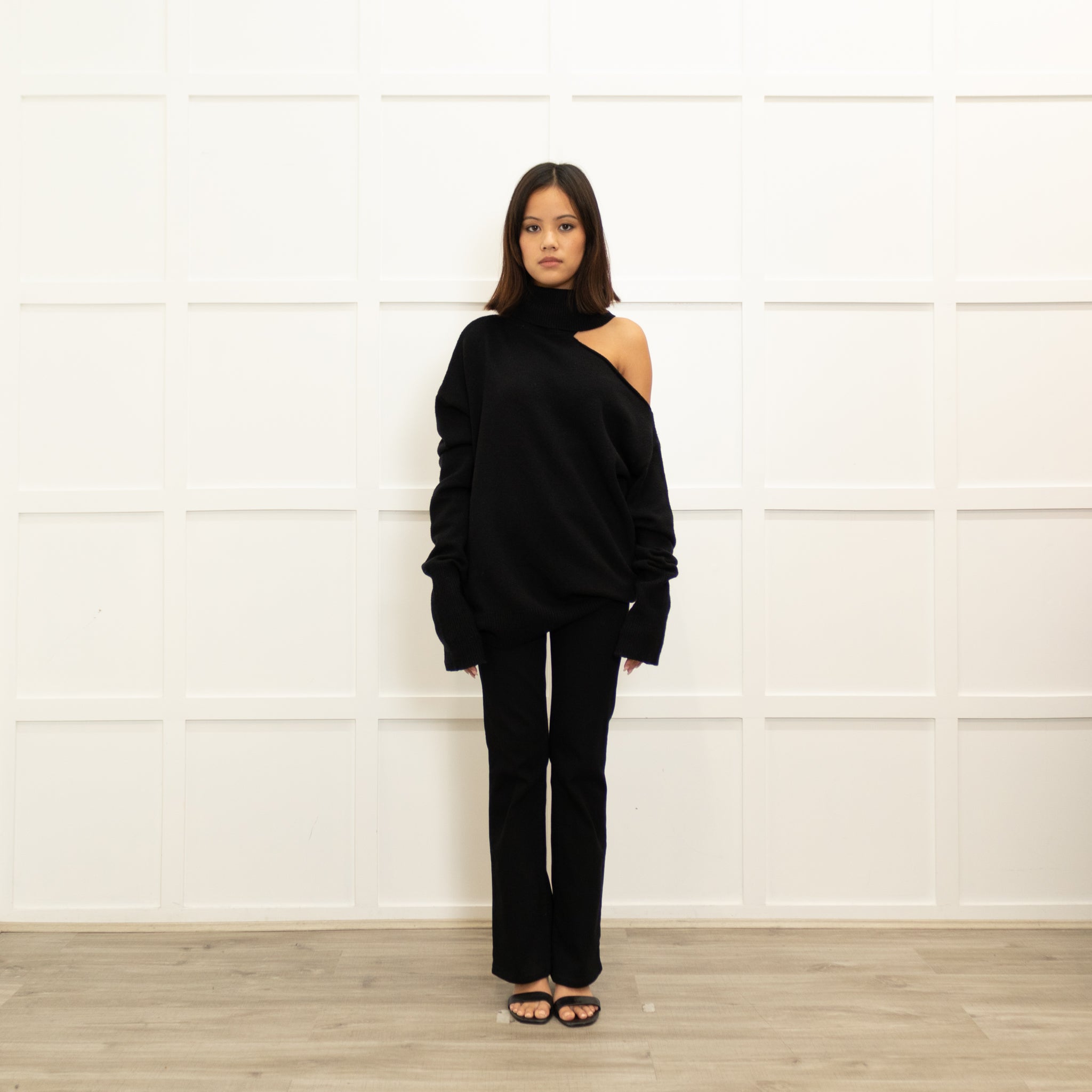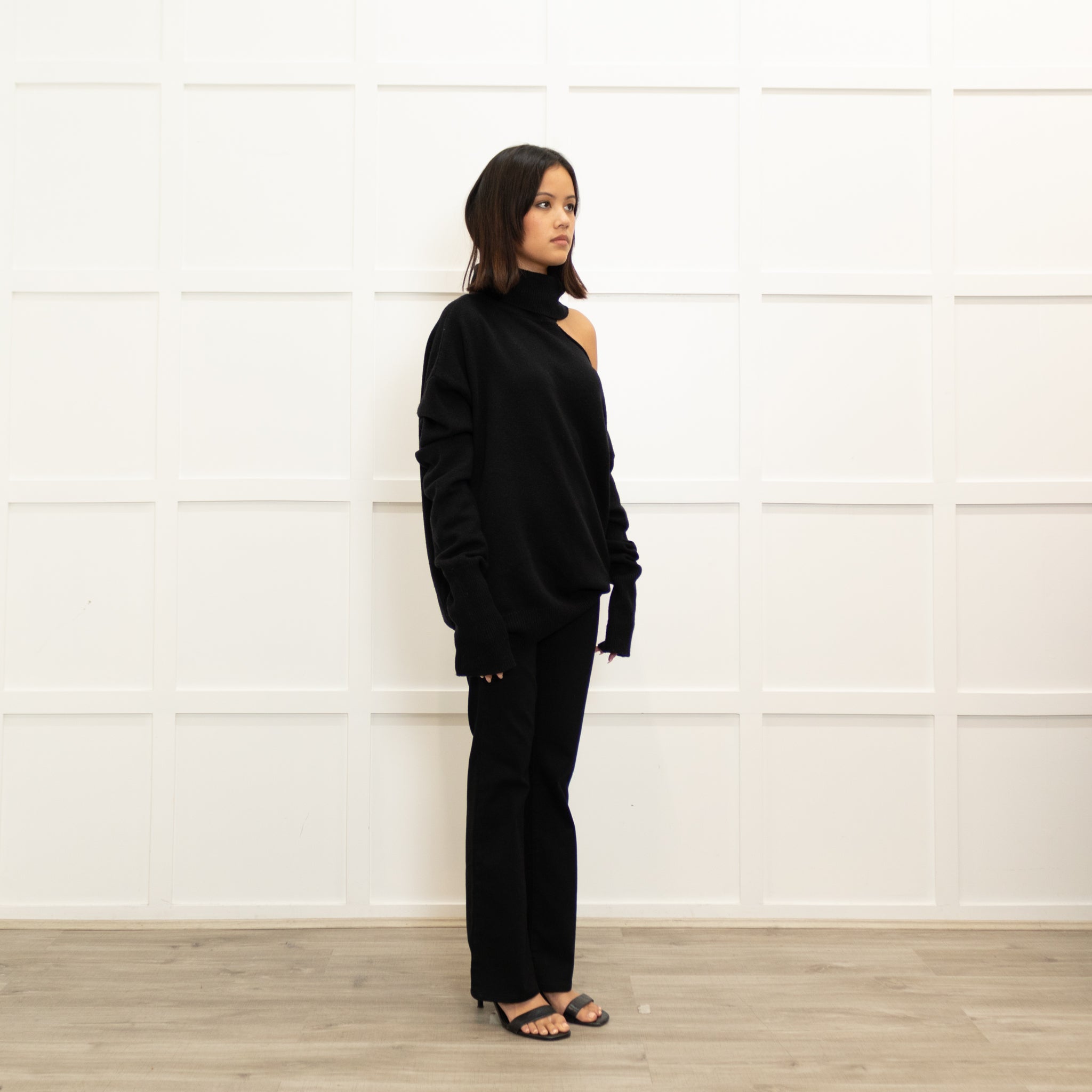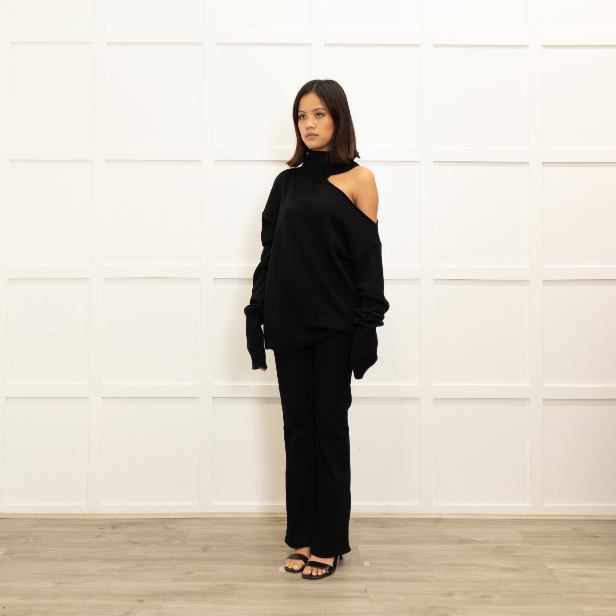 Paige black wool jumper, featuring a stunning wool blend fabric, with an open shoulder oversized design, with a rollneck neckline, for a comfy yet elegant look.