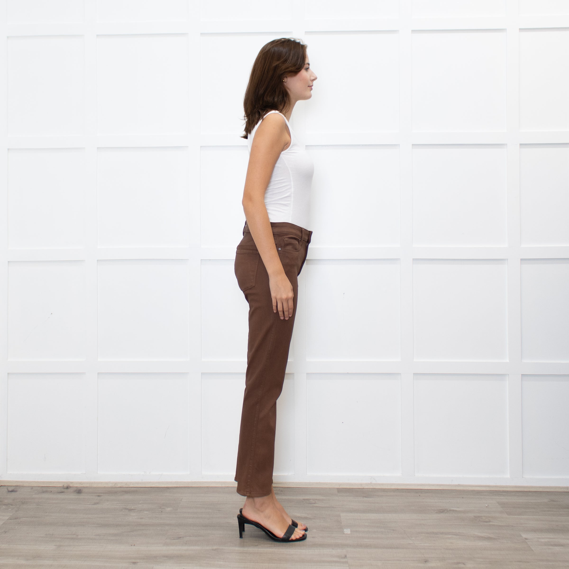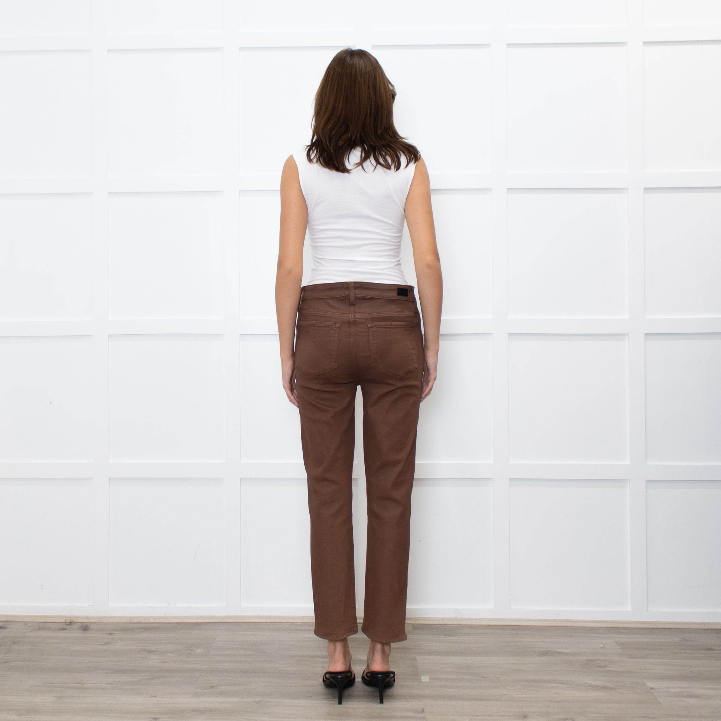 Paige brown coated straight leg jeans with concealed front zip and button flies, five pockets, and belt loops.