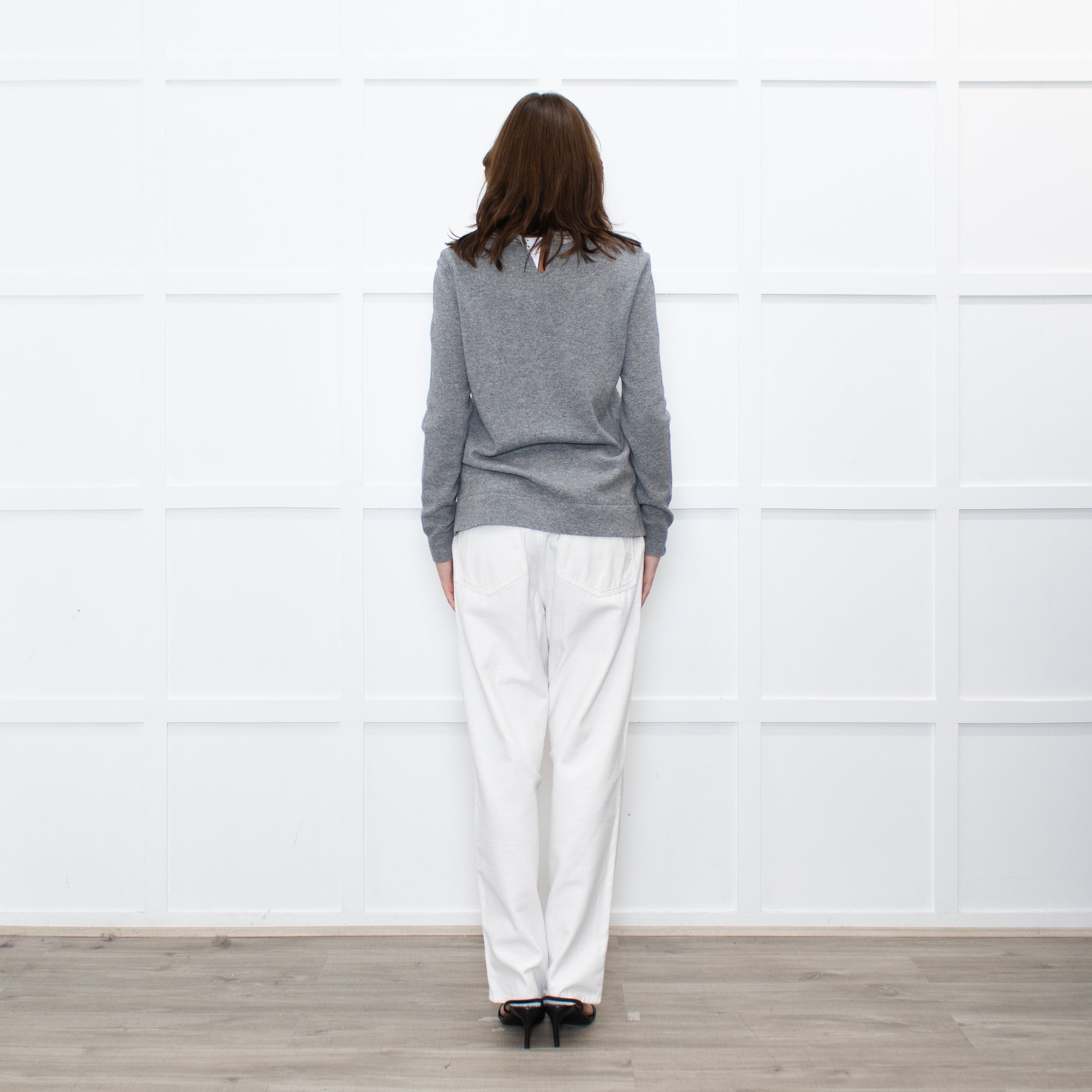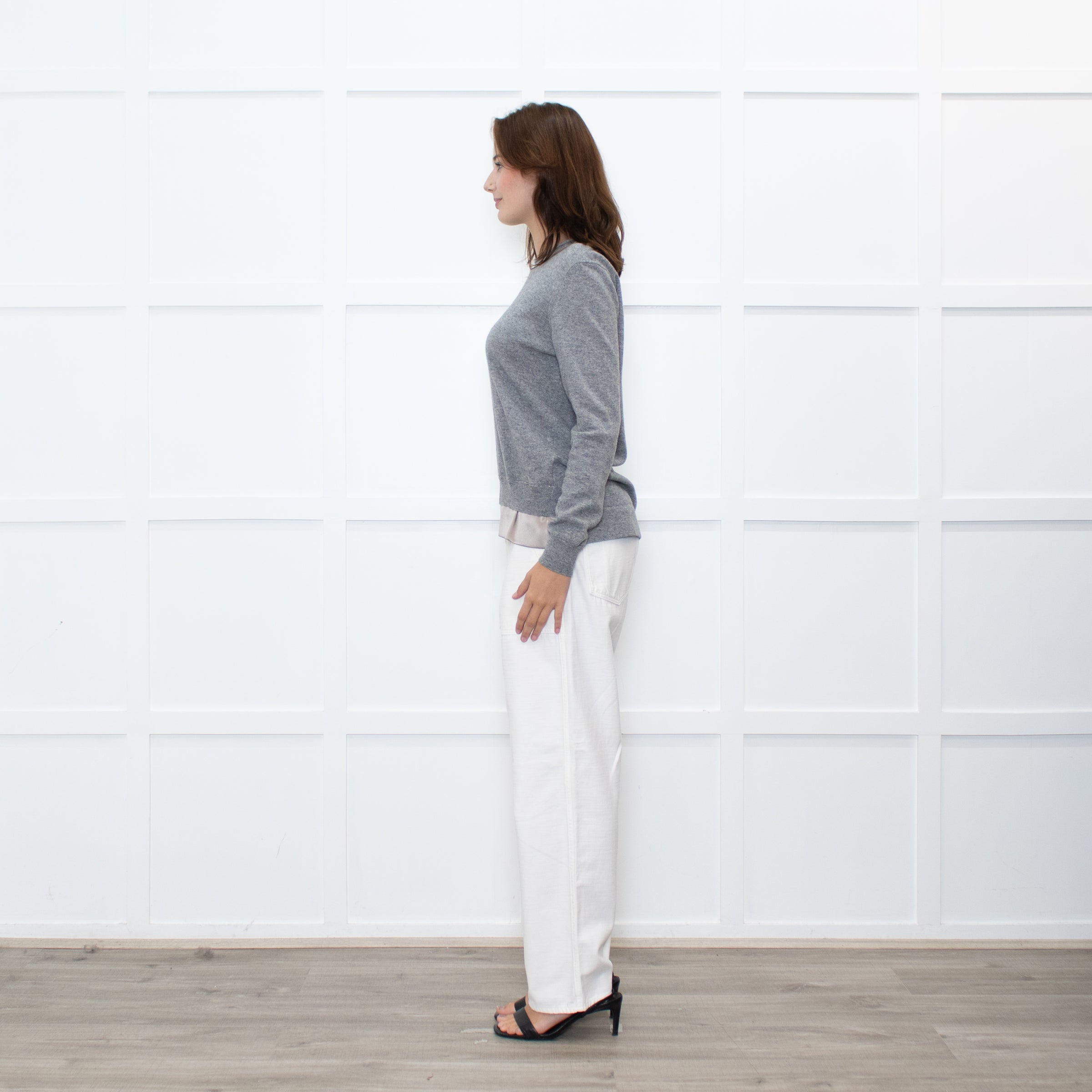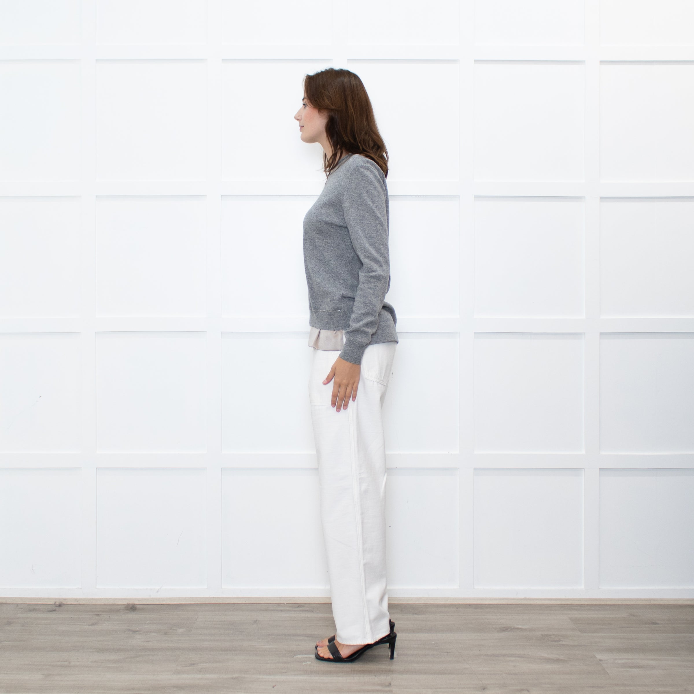 Peserico grey wool blend beige silk trim sweater with cashmere mixed into the blend. This jumper is super soft, finished with fine silver beaded trim.