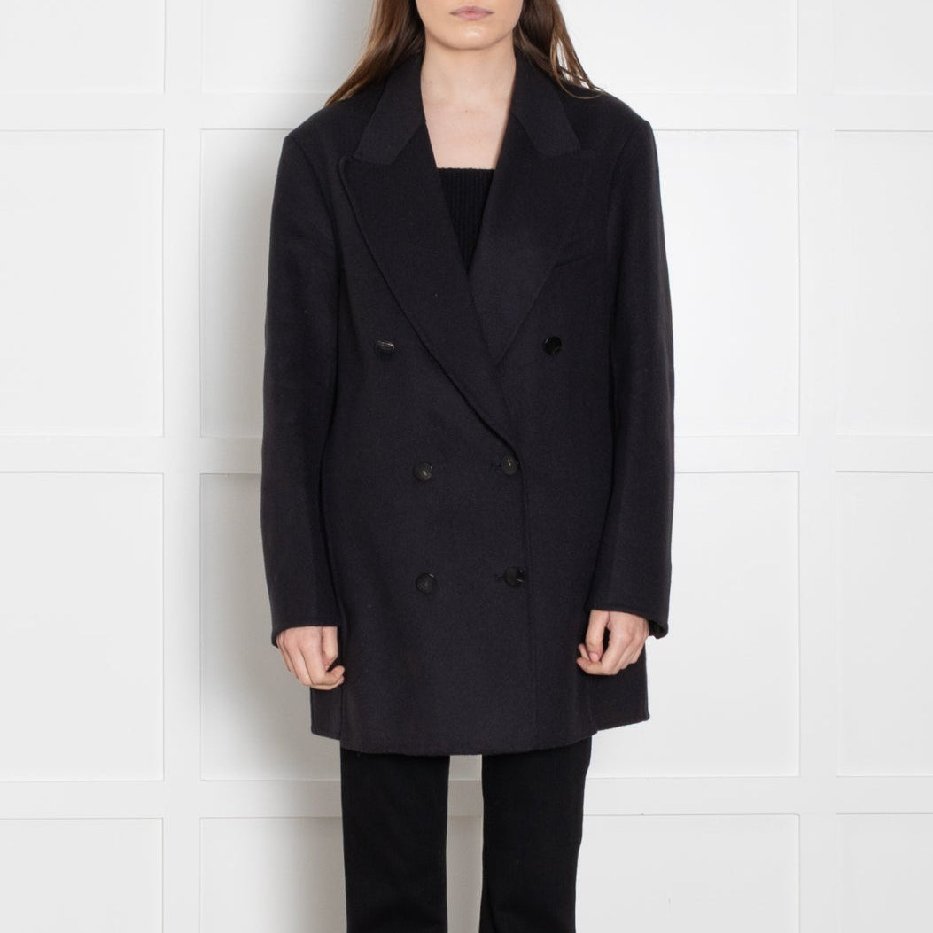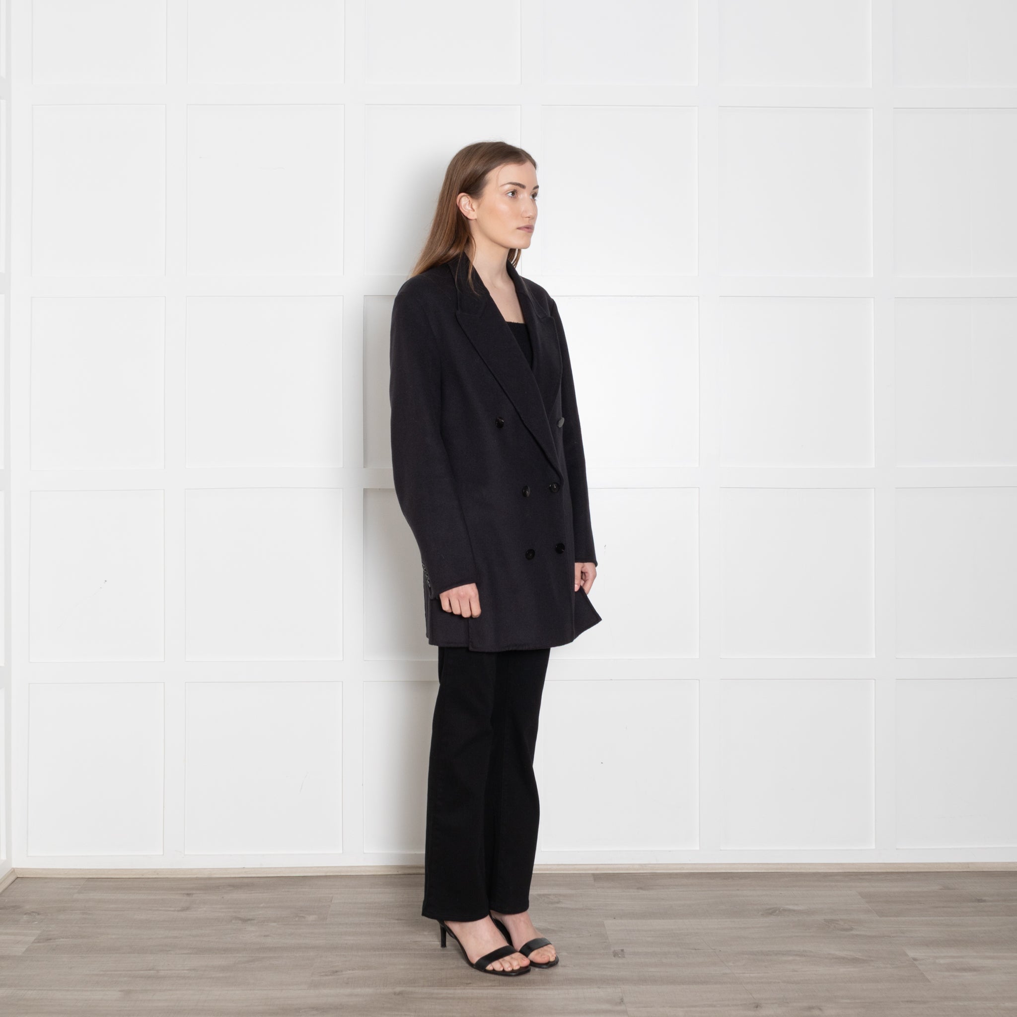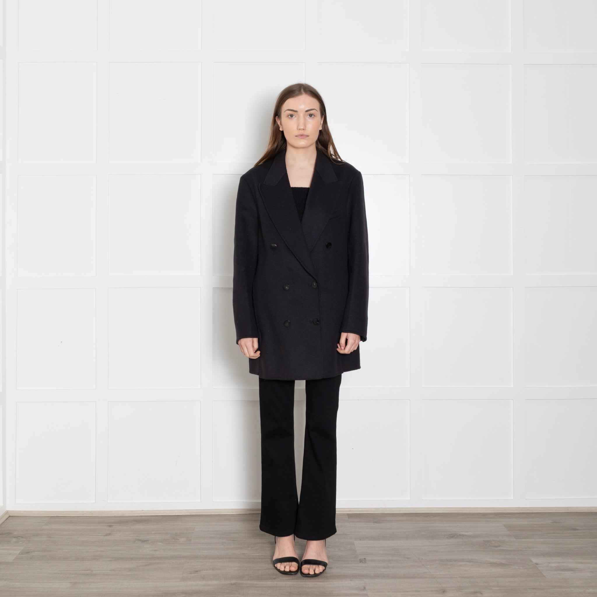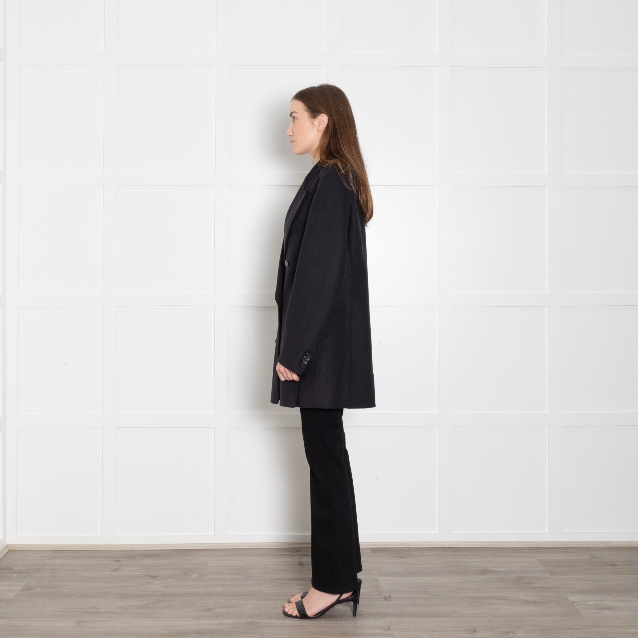 Phillip Lim long-sleeve navy coat, crafted with a soft wool exterior, featuring a classic long collar, two front pockets, hidden by a flip-up outer material for a unique, stunning look.