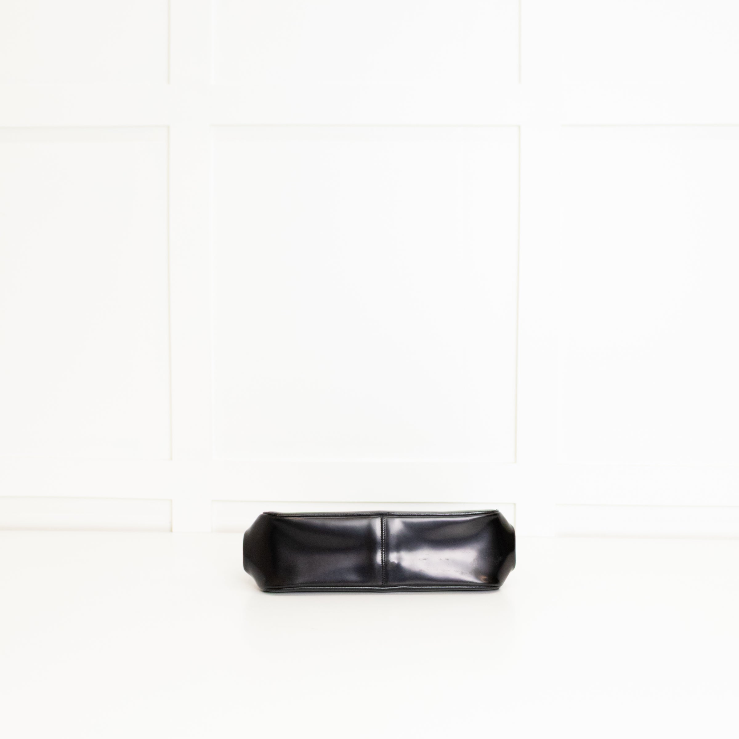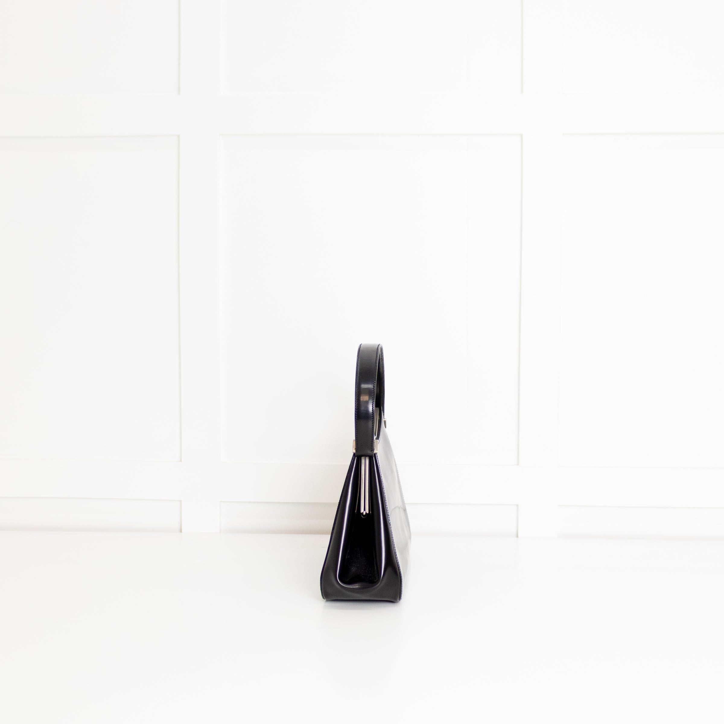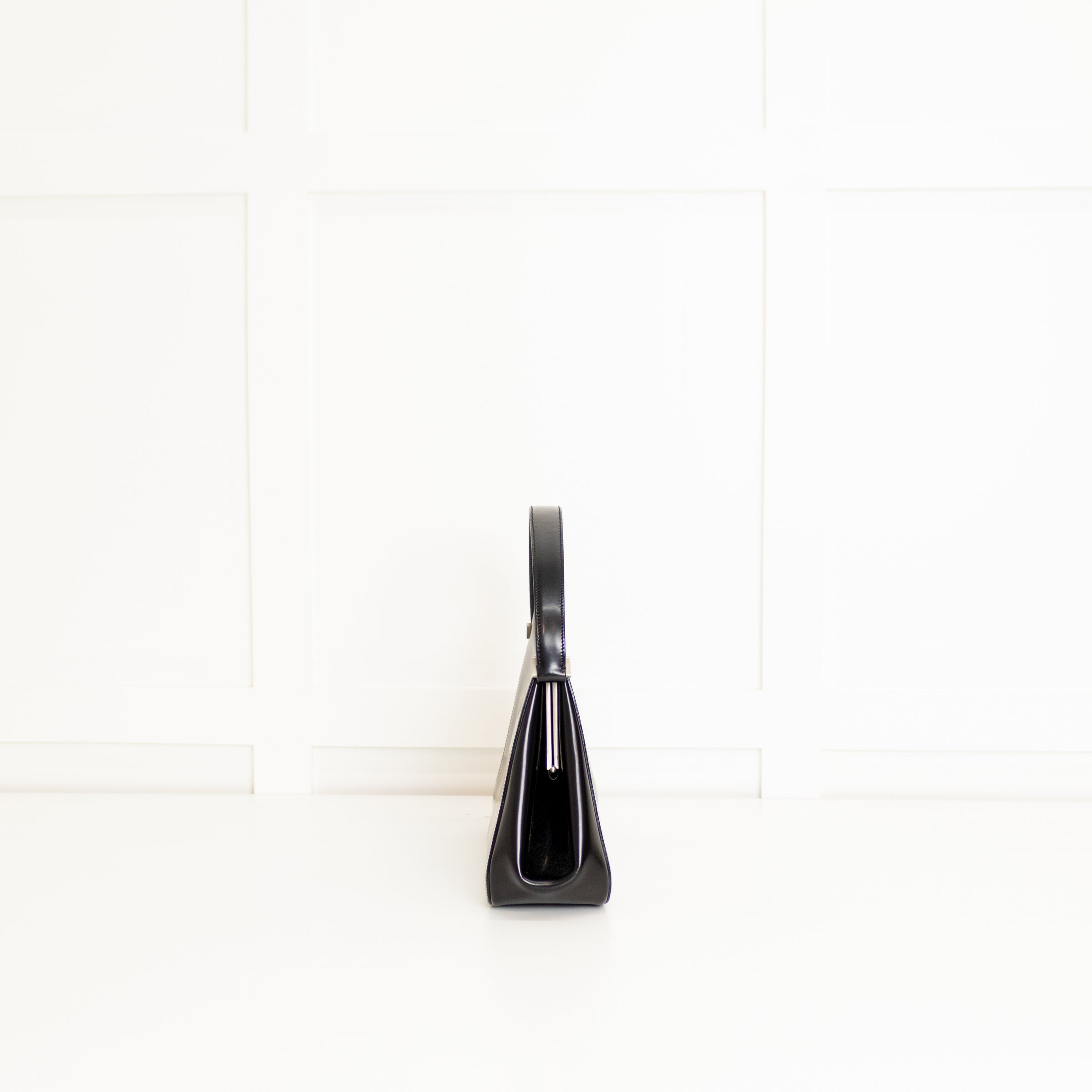 Prada black leather top handle shoulder bag with a top frame closure, embossed branding, and silver tone hardware. With the original dust bag.