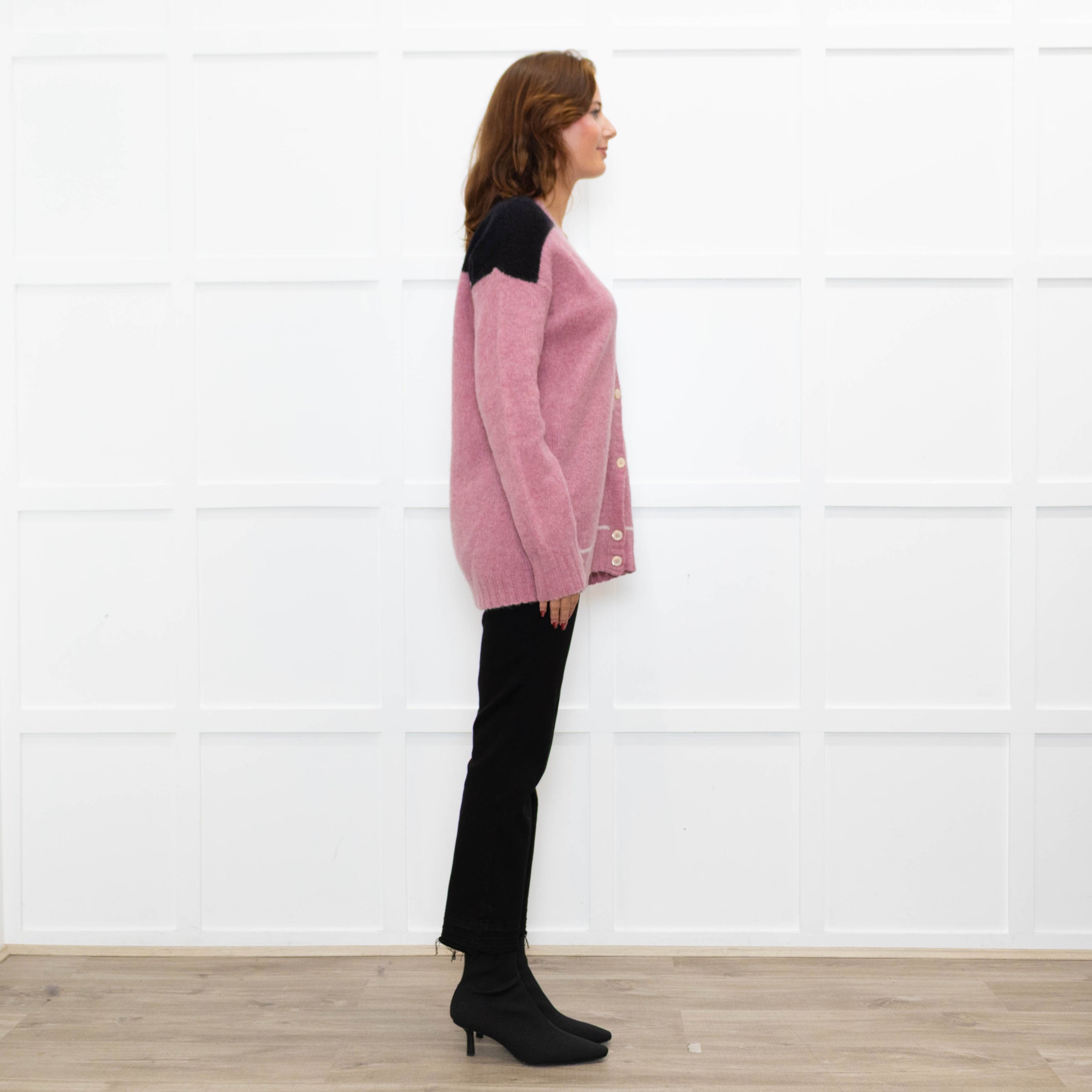 Prada pink and black logo back wool oversized cardigan with front button closure and ribbed trims.