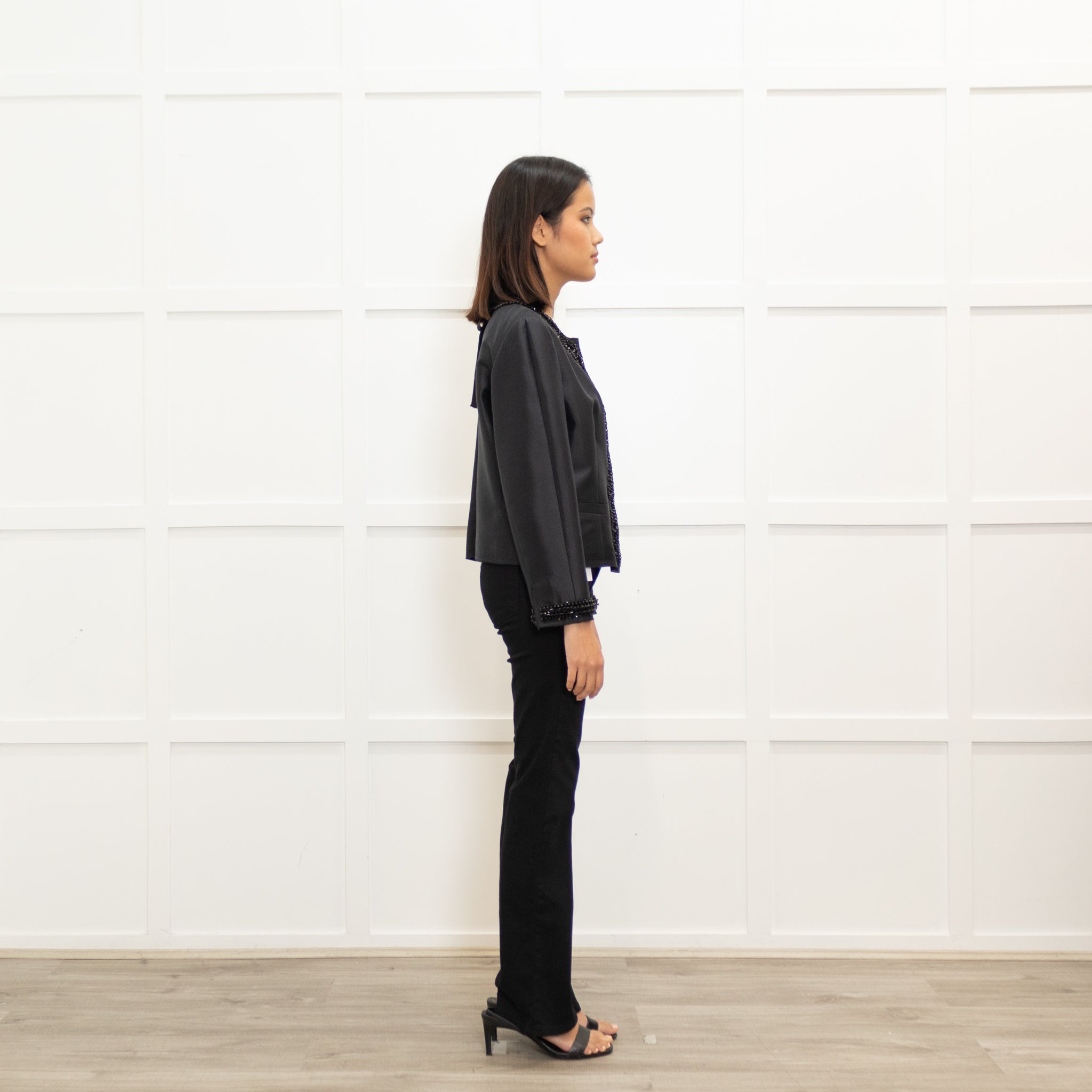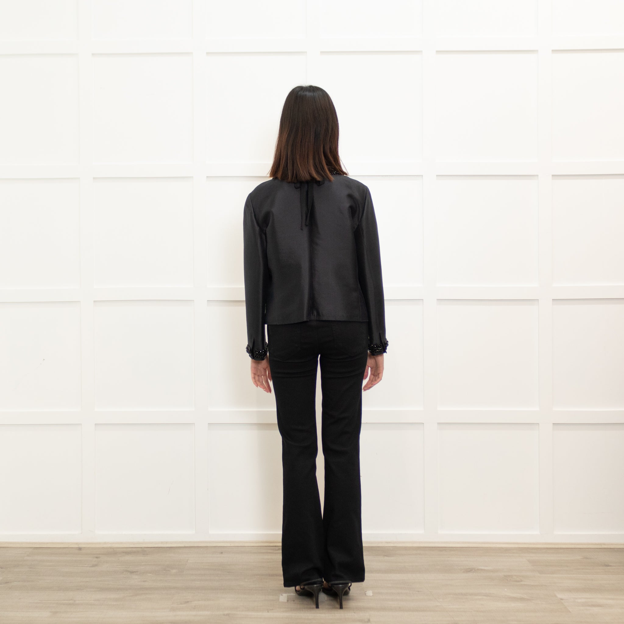 Prada silk beaded trim short elegant jacket with long sleeves, featuring a grosgrain bow at the back of the neck. Hook and eye closure.