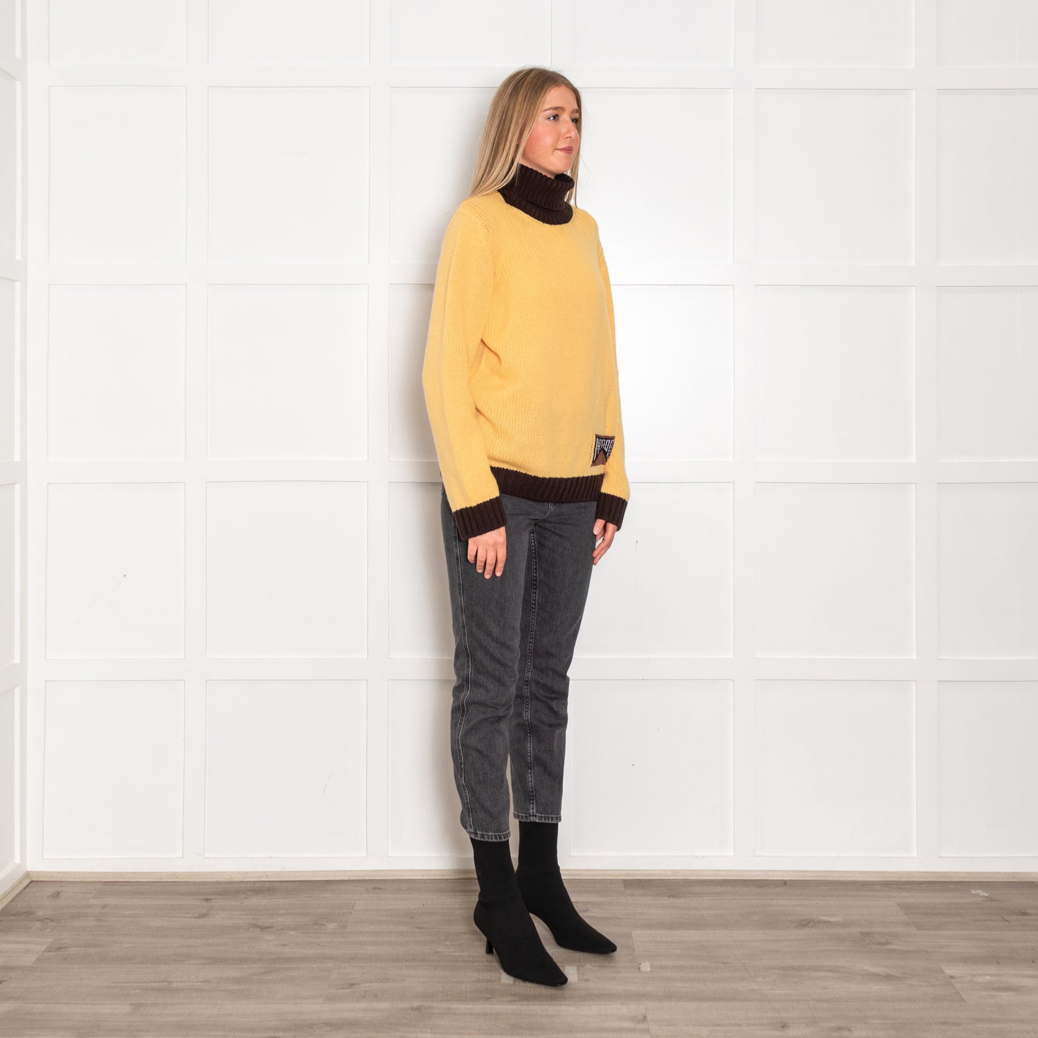 Prada yellow oversized cashmere jumper, featuring stunning brown accent colours with the Prada logo on the front, and a gorgeous roll neck design.