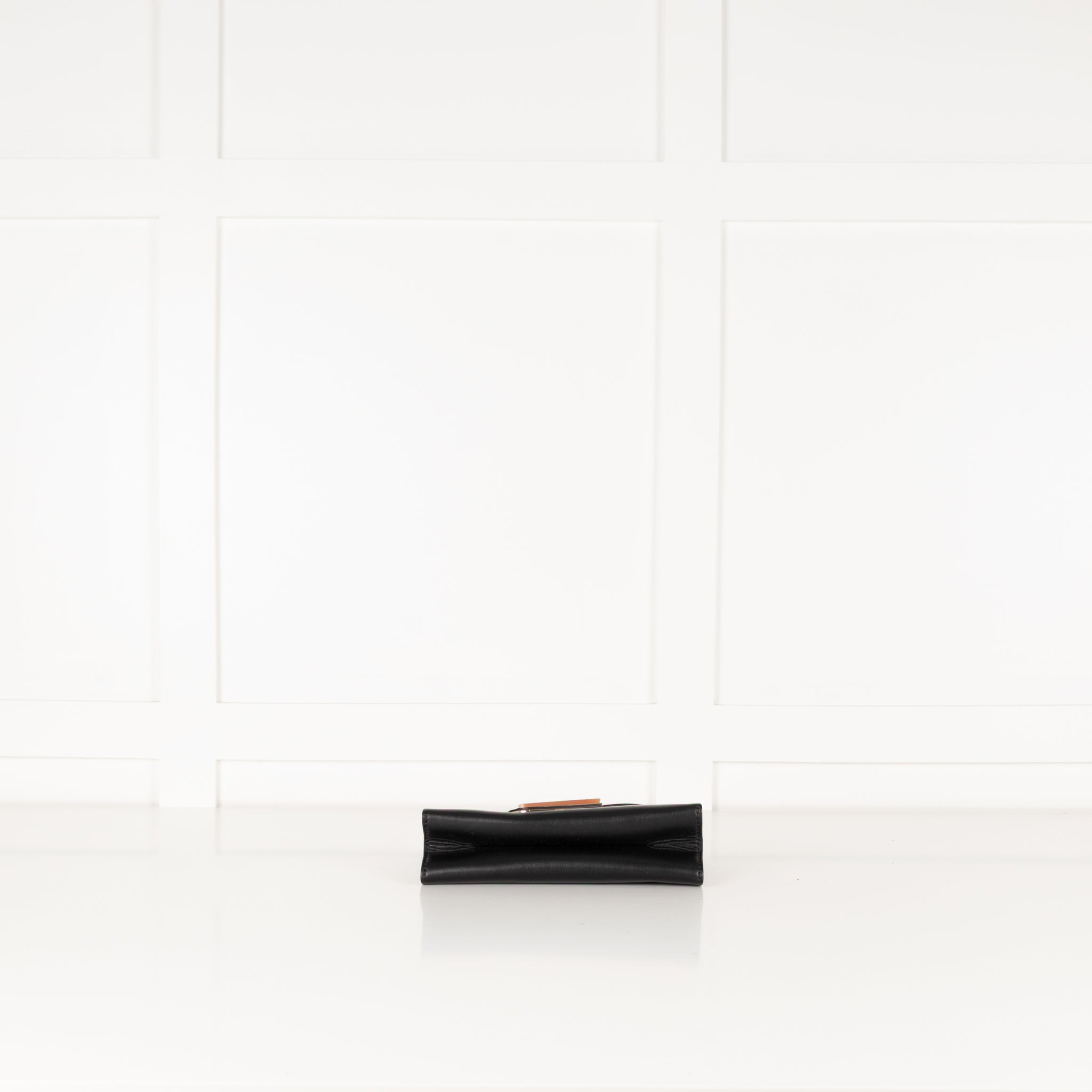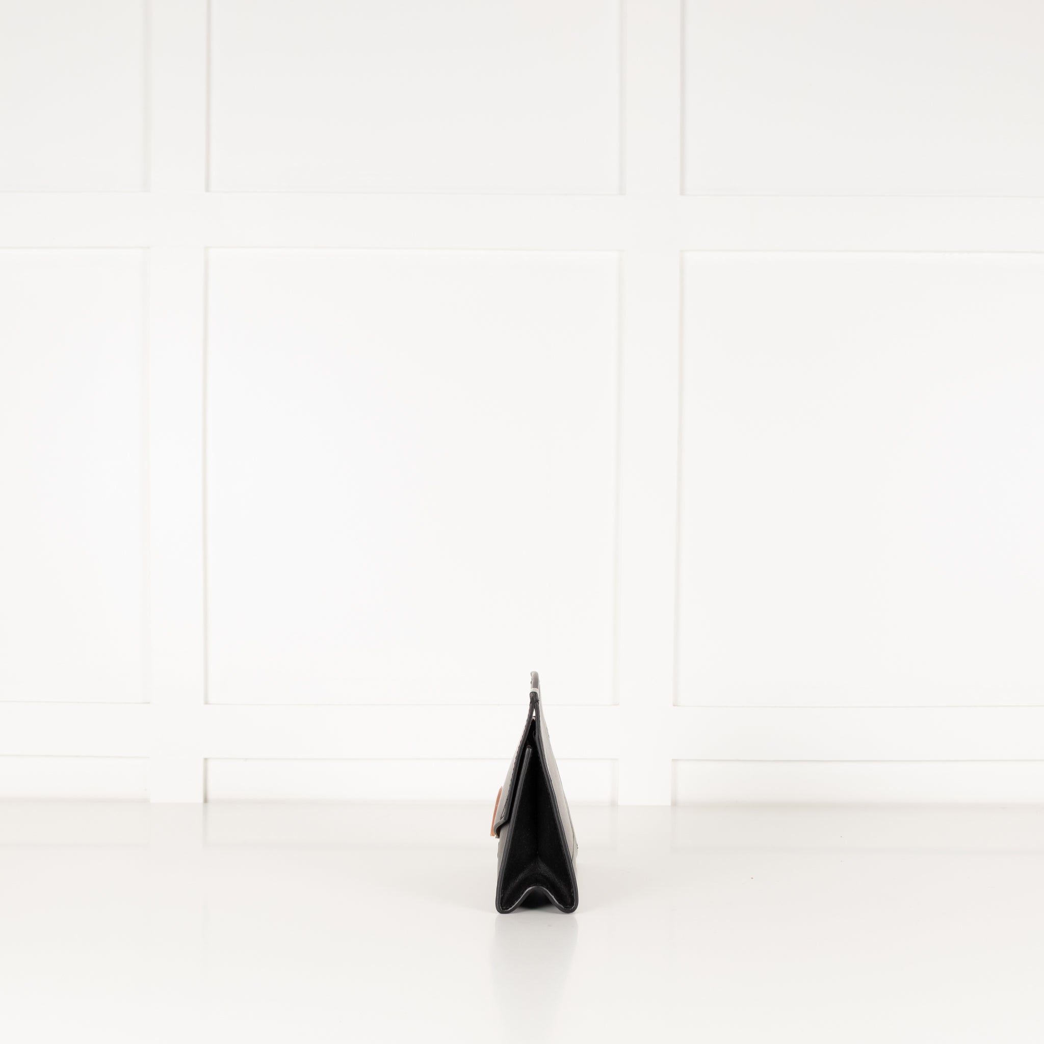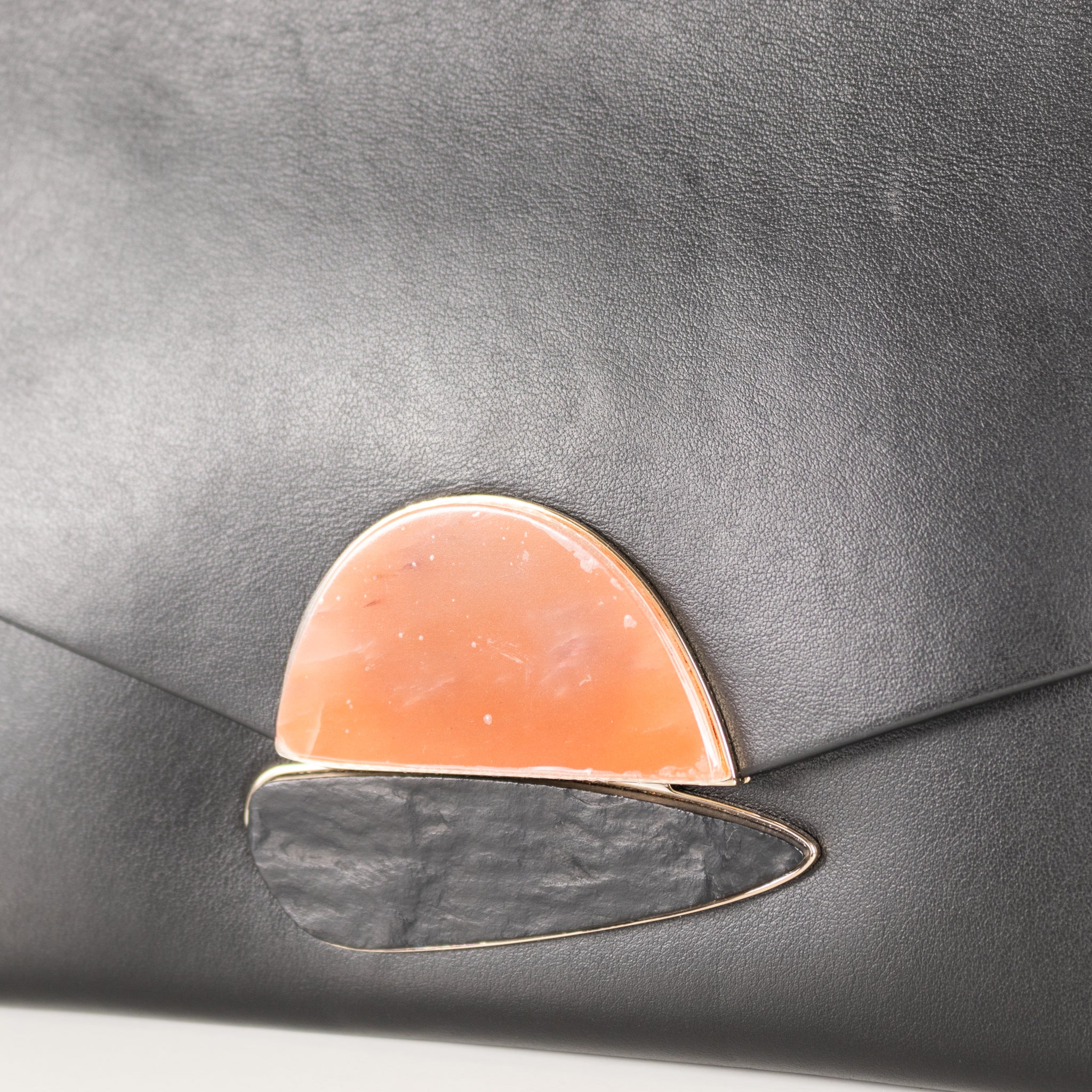 Proenza Schouler black leather curl clutch bag, featuring two stone pendants on the front metal clasp, one in black and one in orange for an elegant touch. It opens up to two departments, including a large section with a soft pink interior and a smaller side compartment. This stunning clutch bag is accompanied with the original dust bag.